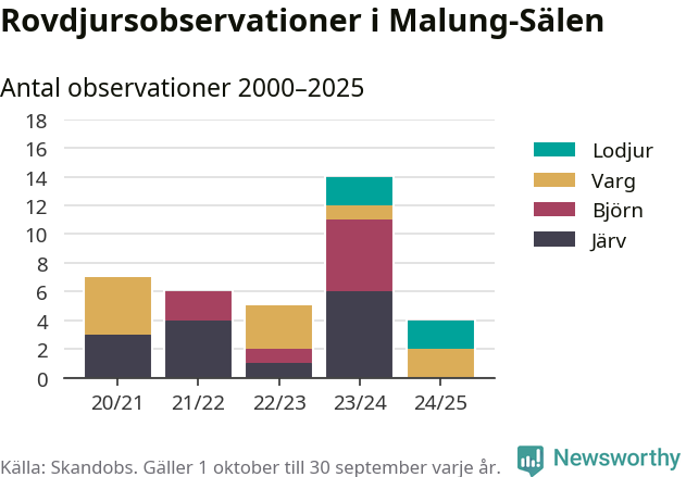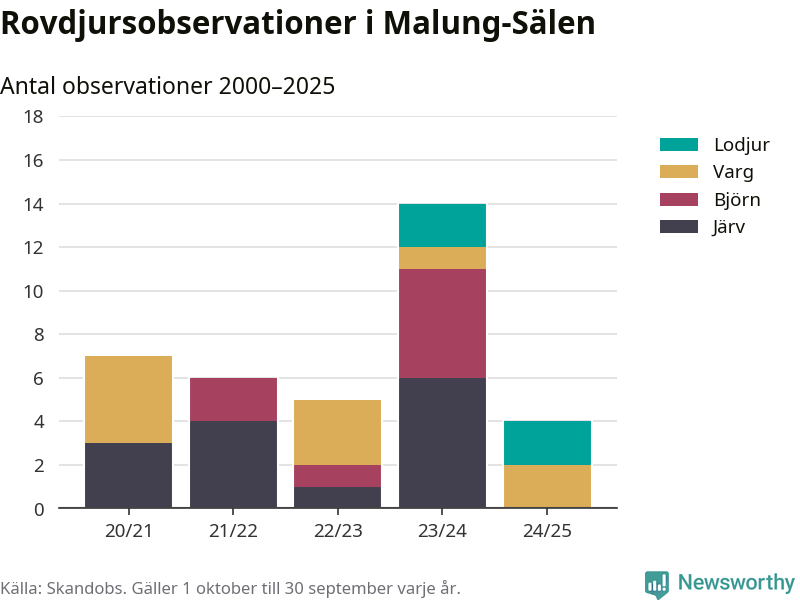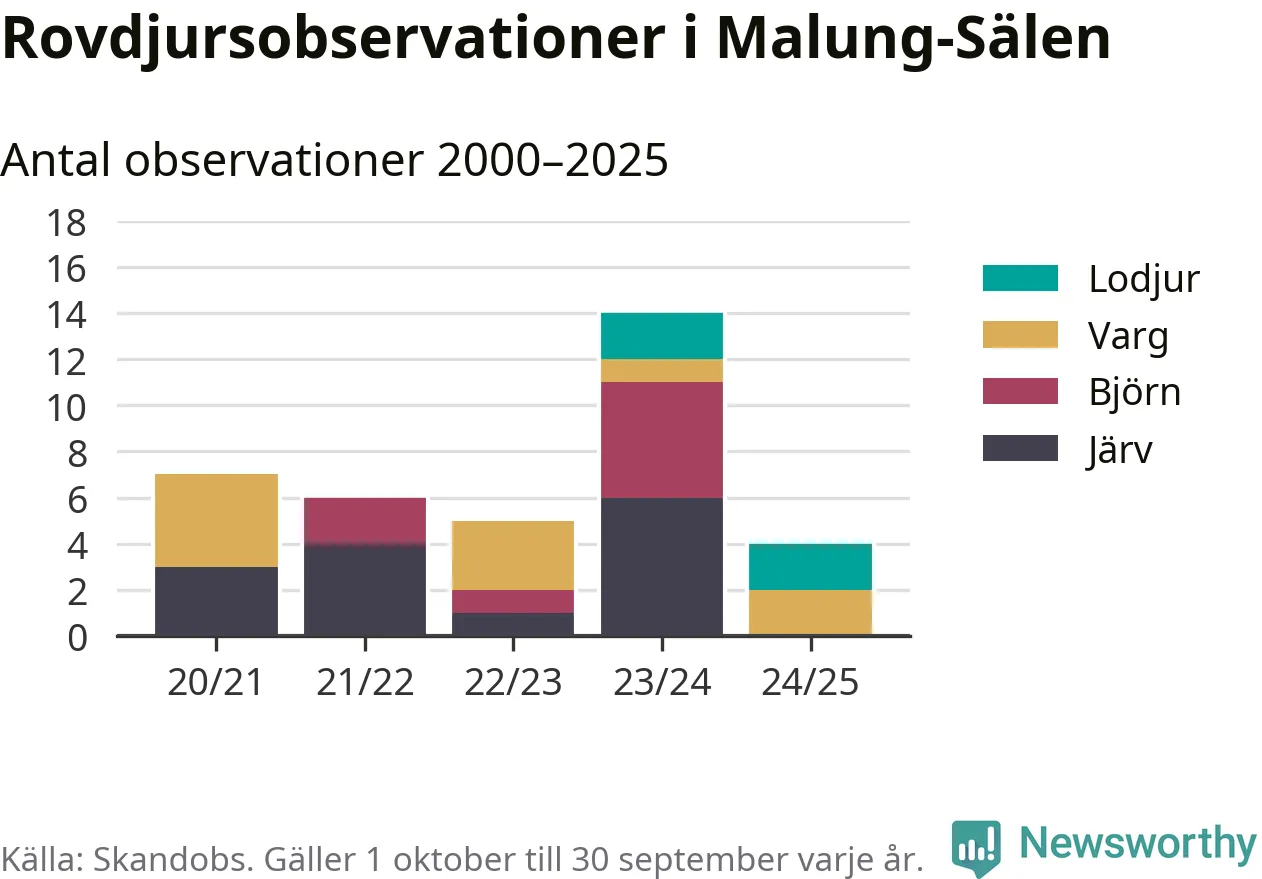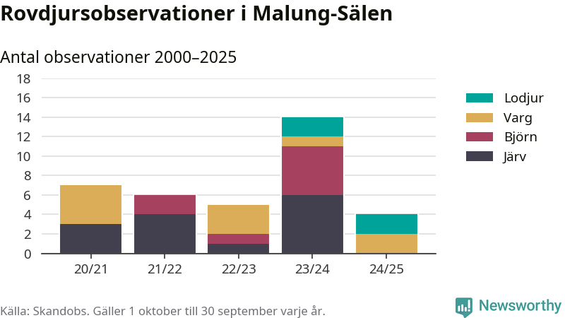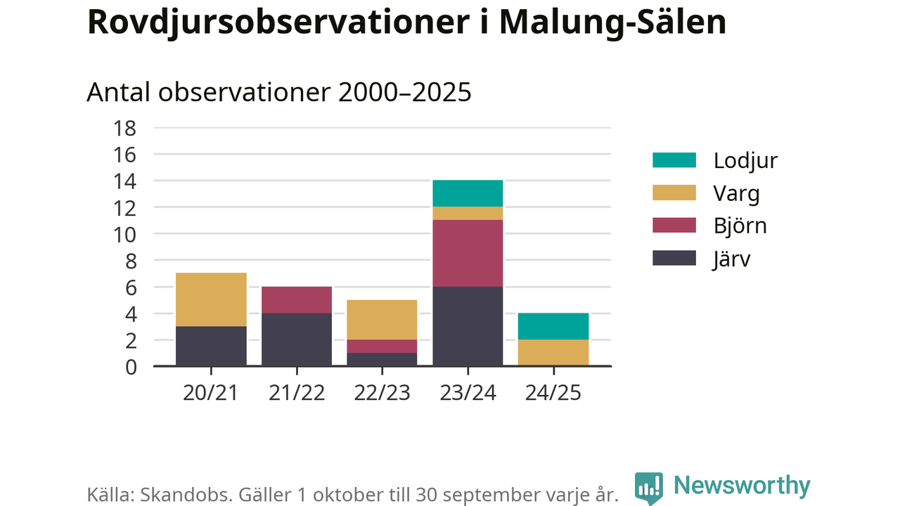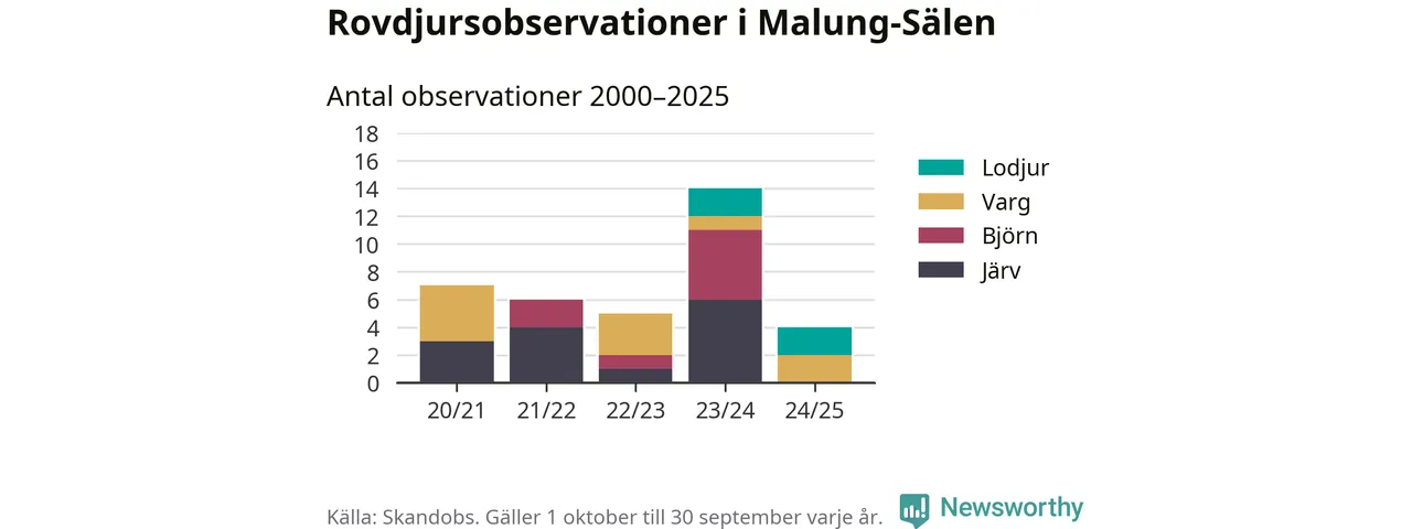 Under det senaste året har noll observationer av björn och noll observationer av järv rapporterats i Malung-Sälens kommun. Det är färre än året dessförinnan. Härifrån kommer rapporterna.