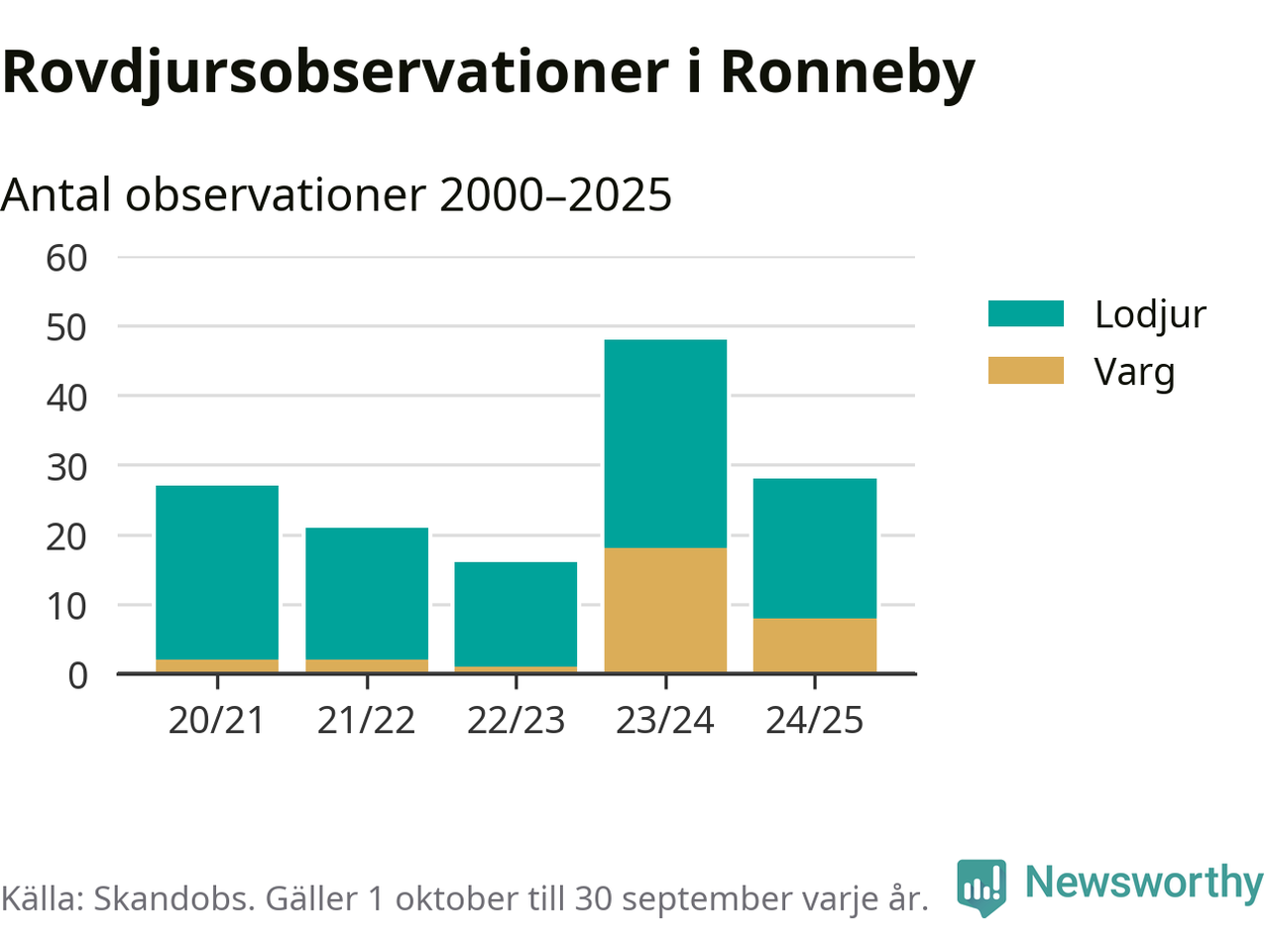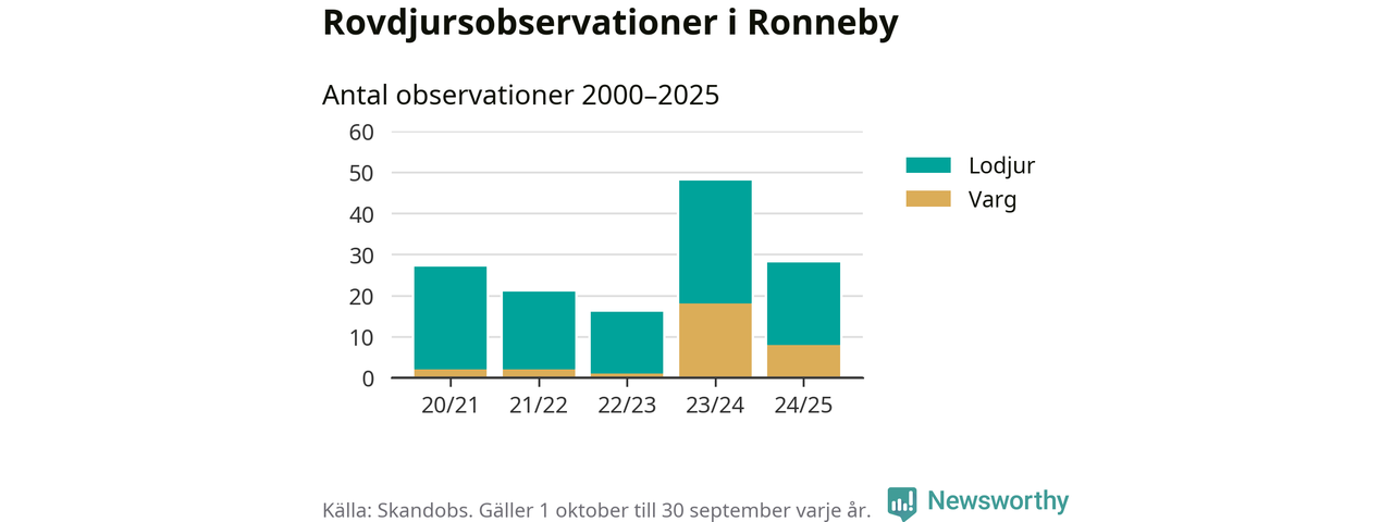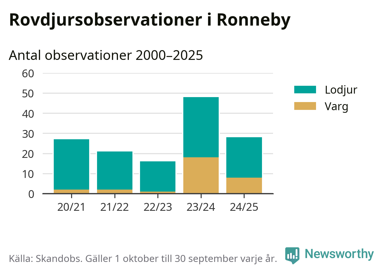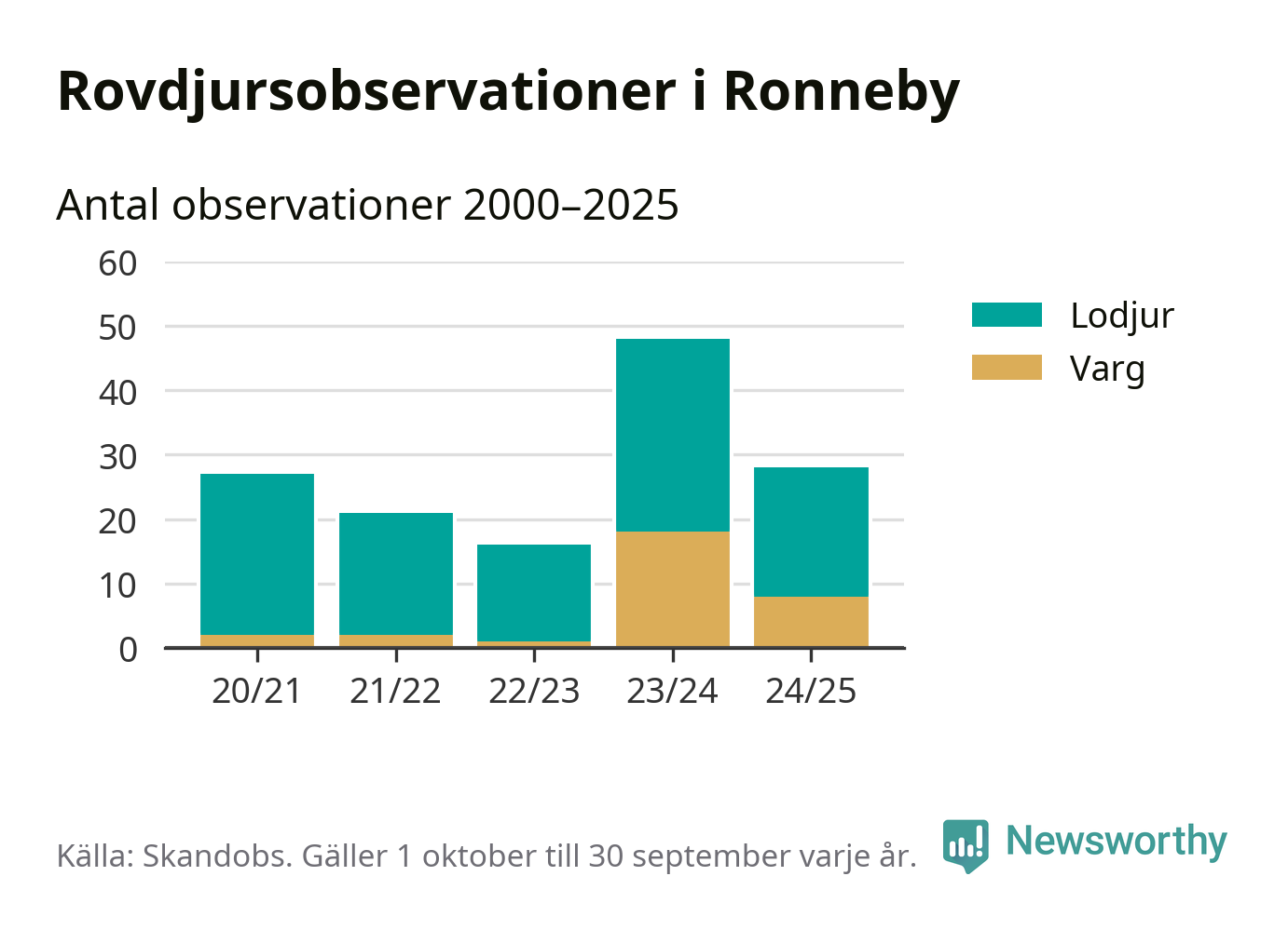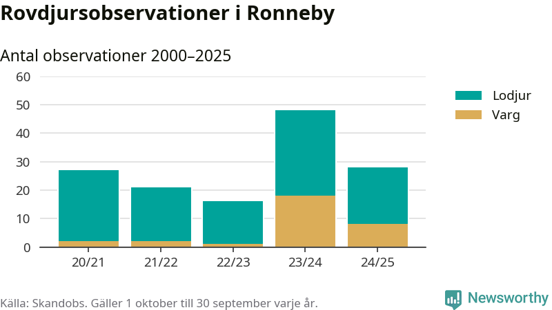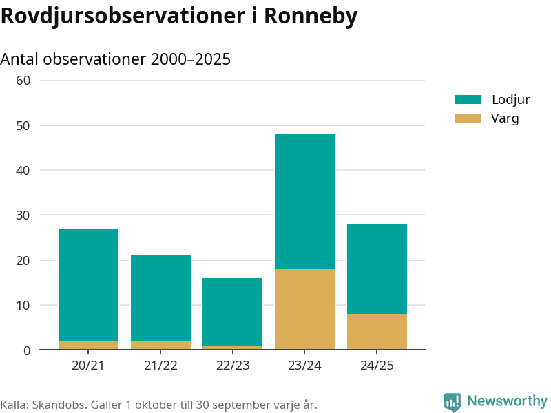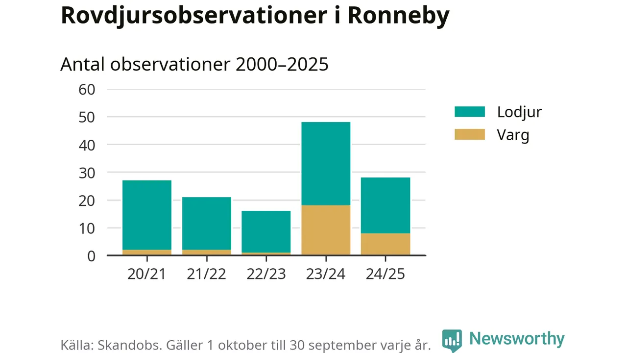 Där kan vem som helst rapportera sina observationer av de stora rovdjuren björn, varg, lodjur och järv. Mellan 1 oktober 2024 och 30 september i år har knappt 10 000 observationer registrerats i landet. Det kan vara synobservationer, foton, spår, spillning, döda bytesdjur eller andra tecken på rovdjursförekomst. I Ronneby handlar det om totalt 28 observationer av lodjur eller varg.