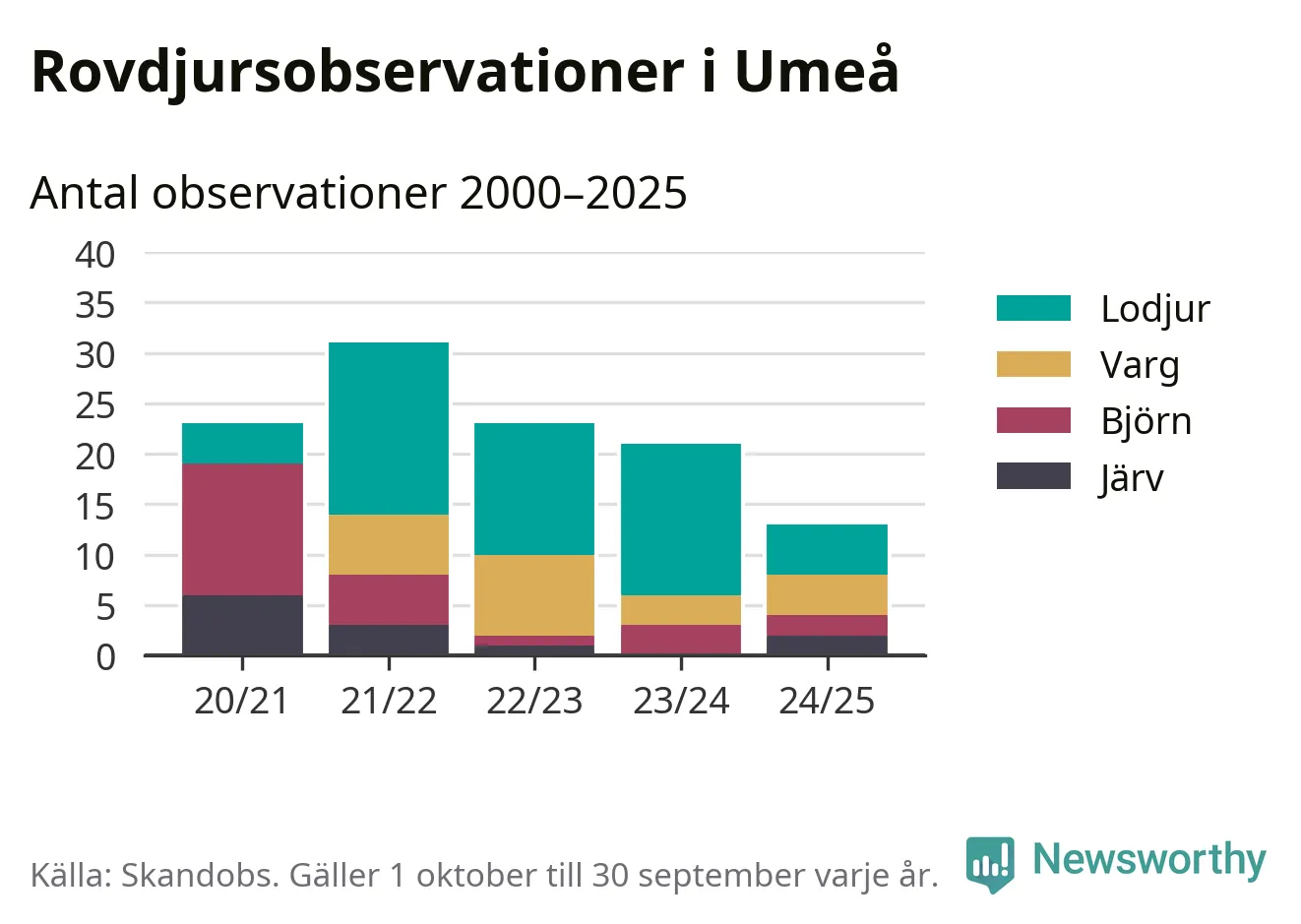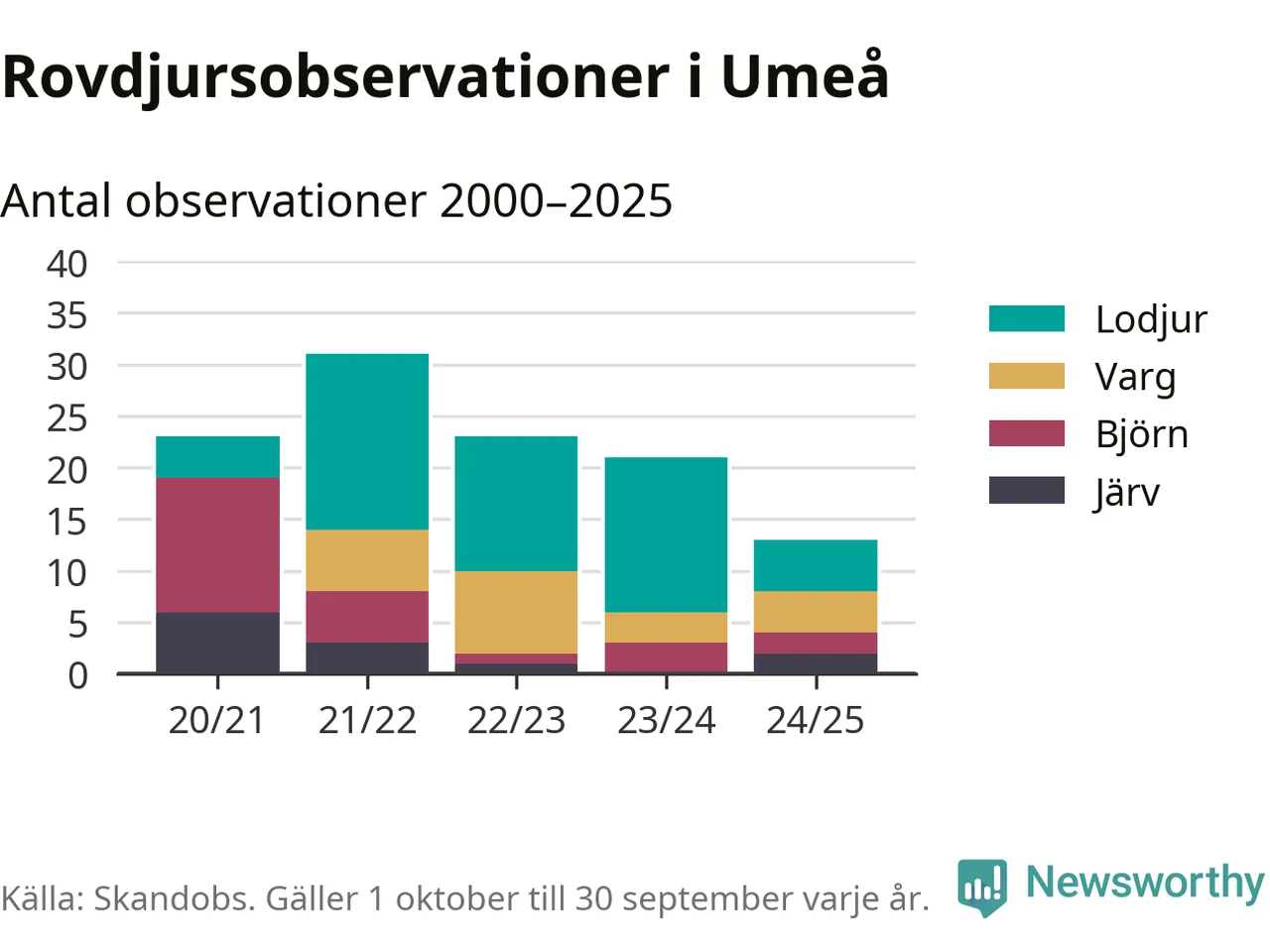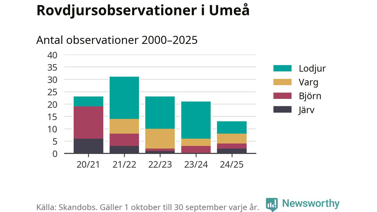 Där kan vem som helst rapportera sina observationer av de stora rovdjuren björn, varg, lodjur och järv. Mellan 1 oktober 2024 och 30 september i år har knappt 10 000 observationer registrerats i landet. Det kan vara synobservationer, foton, spår, spillning, döda bytesdjur eller andra tecken på rovdjursförekomst. I Umeå finns totalt 13 rapporter, om alla fyra rovdjur.