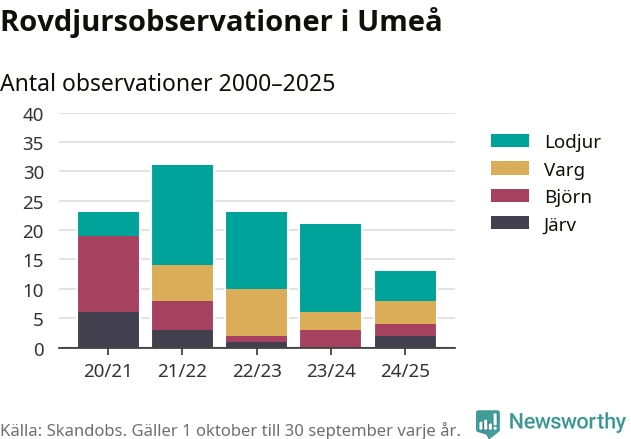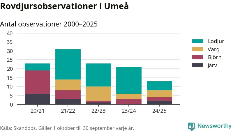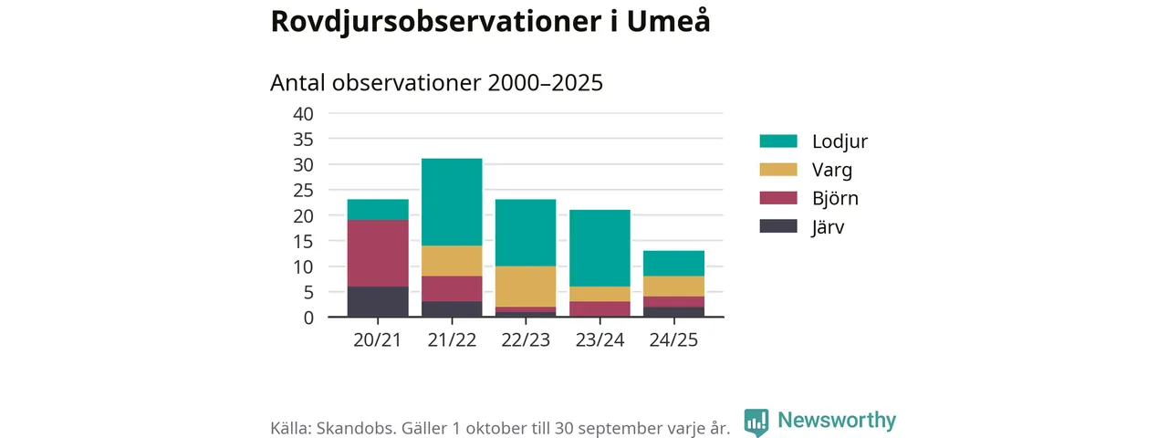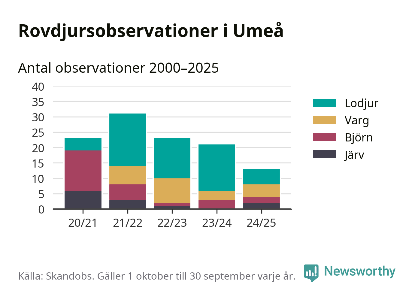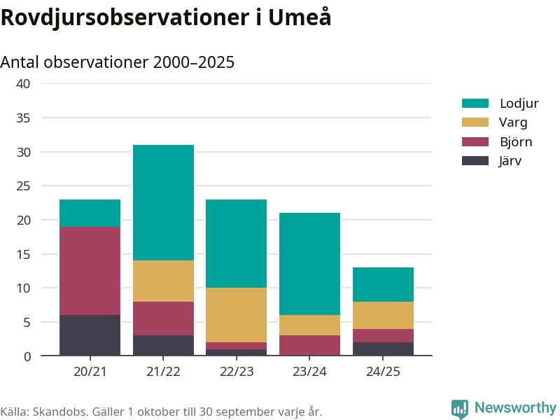 Där kan vem som helst rapportera sina observationer av de stora rovdjuren björn, varg, lodjur och järv. Mellan 1 oktober 2024 och 30 september i år har knappt 10 000 observationer registrerats i landet. Det kan vara synobservationer, foton, spår, spillning, döda bytesdjur eller andra tecken på rovdjursförekomst. I Umeå finns totalt 13 rapporter, om alla fyra rovdjur.