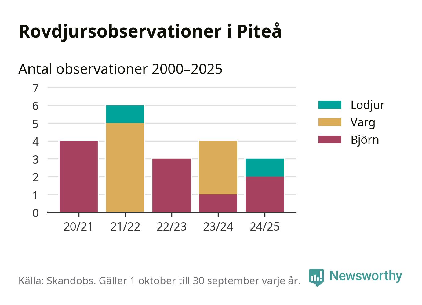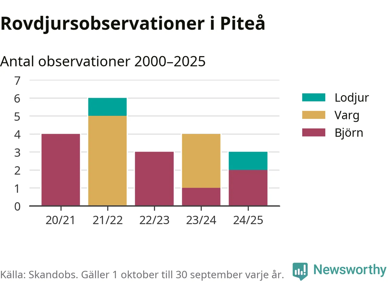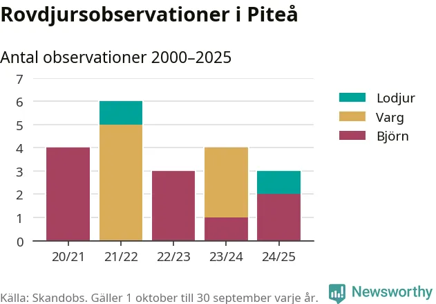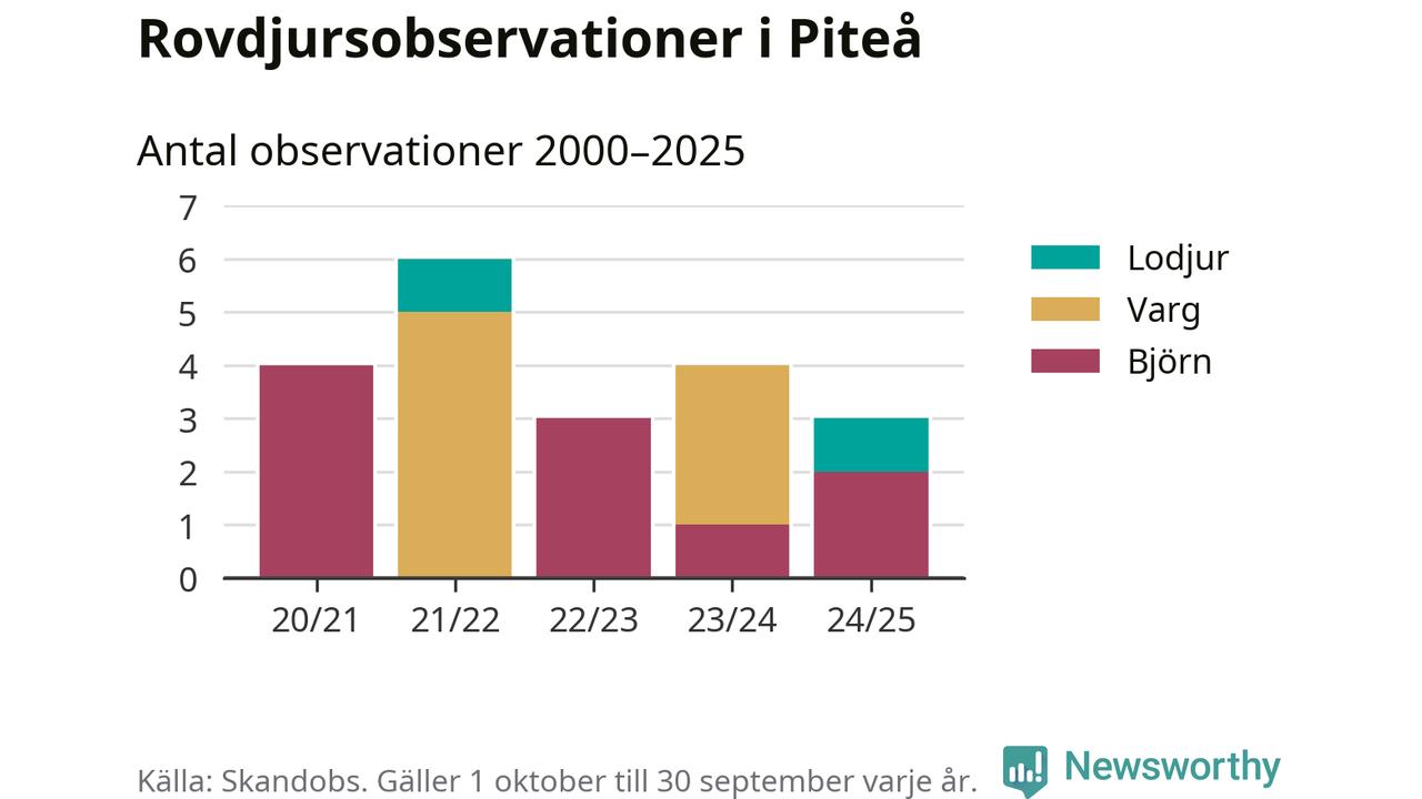 Där kan vem som helst rapportera sina observationer av de stora rovdjuren björn, varg, lodjur och järv. Mellan 1 oktober 2024 och 30 september i år har knappt 10 000 observationer registrerats i landet. Det kan vara synobservationer, foton, spår, spillning, döda bytesdjur eller andra tecken på rovdjursförekomst. I Piteå handlar det om totalt tre observationer av björn eller lodjur.
