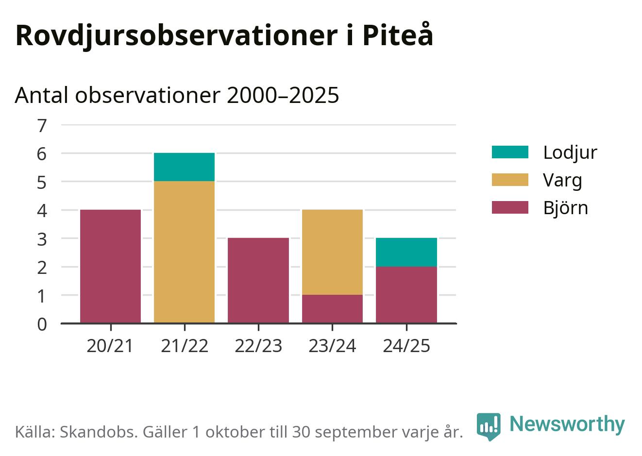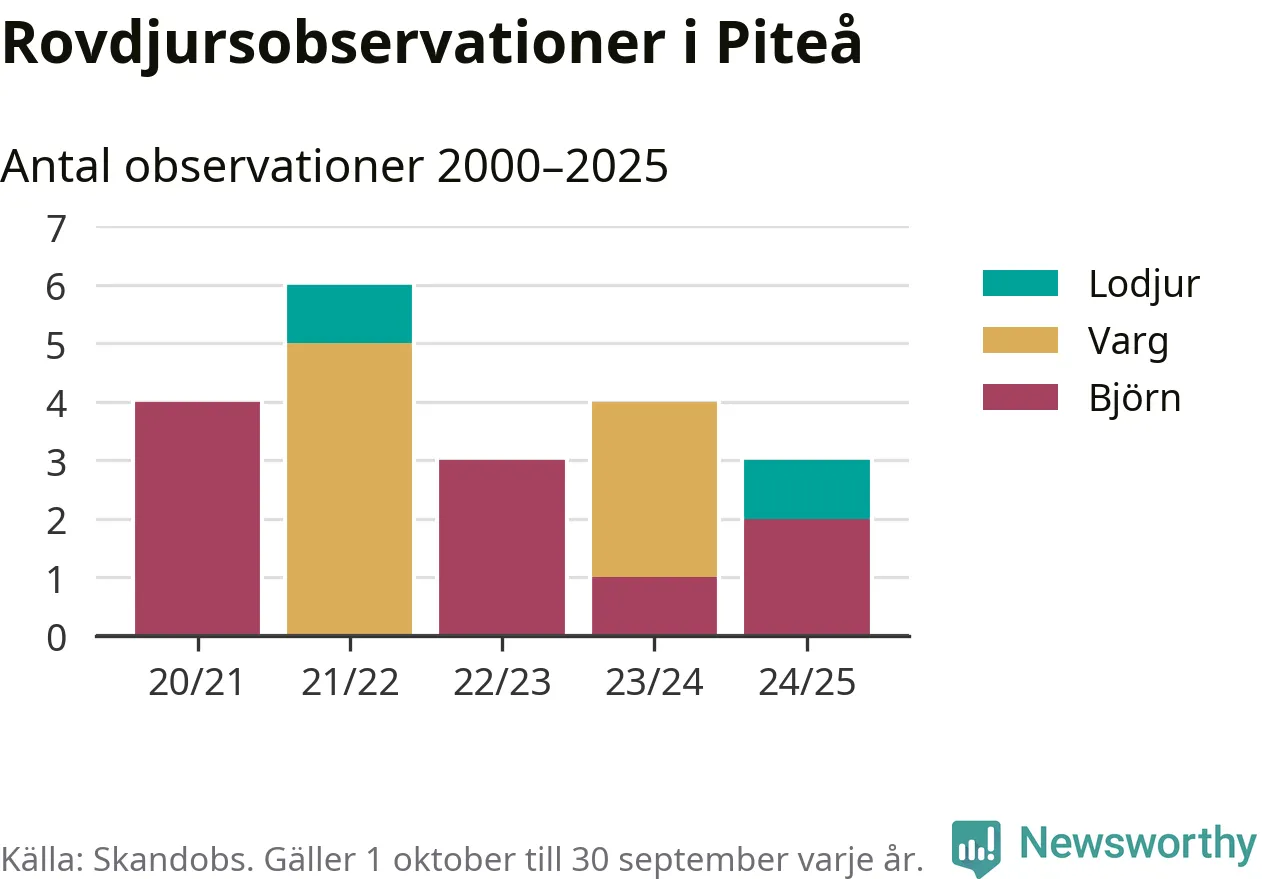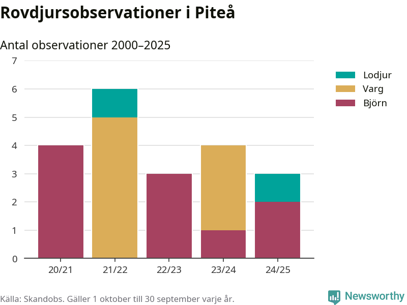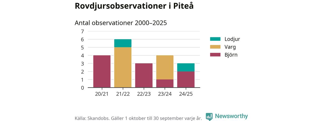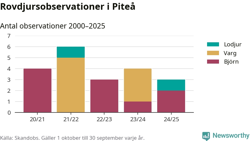 Där kan vem som helst rapportera sina observationer av de stora rovdjuren björn, varg, lodjur och järv. Mellan 1 oktober 2024 och 30 september i år har knappt 10 000 observationer registrerats i landet. Det kan vara synobservationer, foton, spår, spillning, döda bytesdjur eller andra tecken på rovdjursförekomst. I Piteå handlar det om totalt tre observationer av björn eller lodjur.