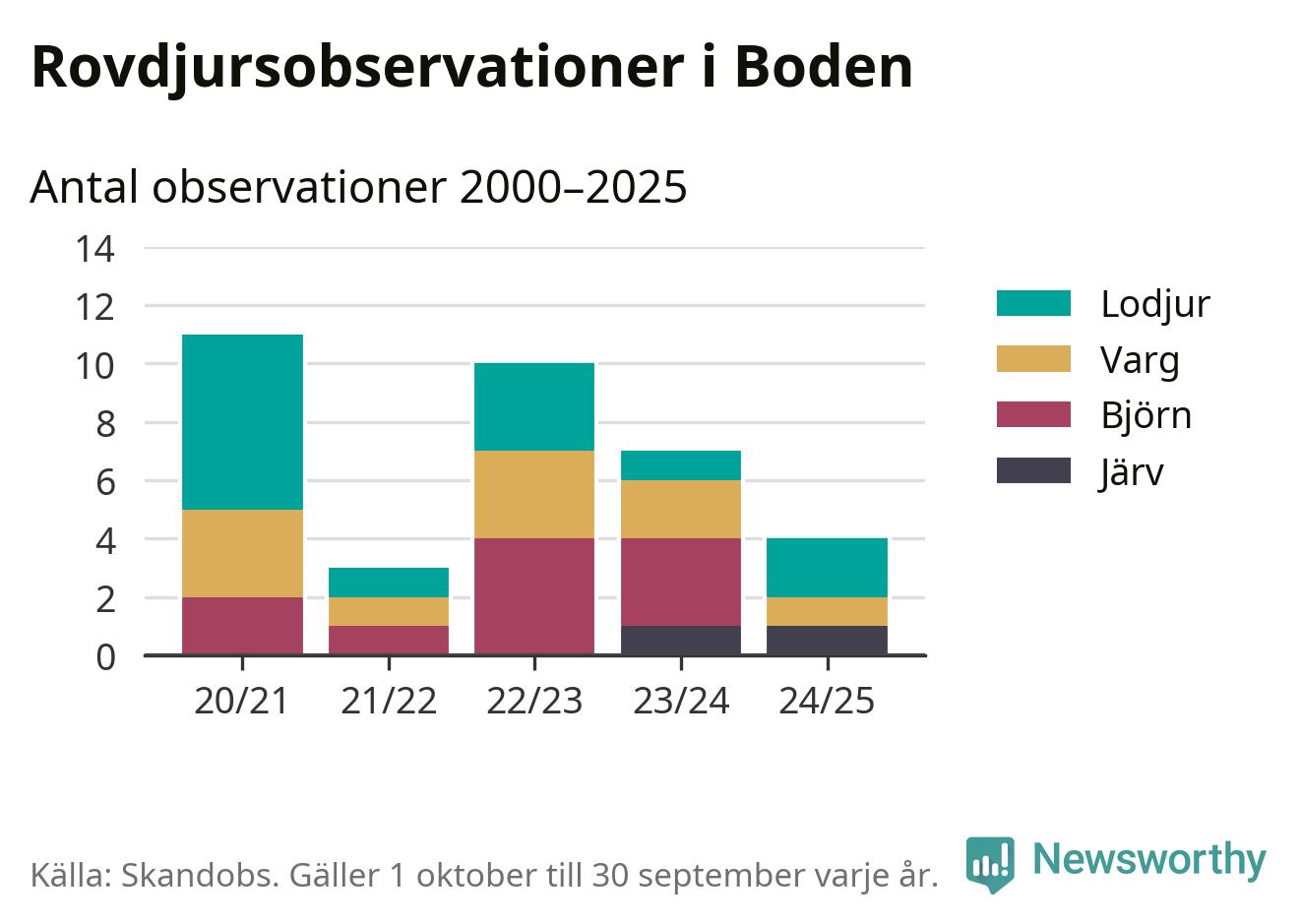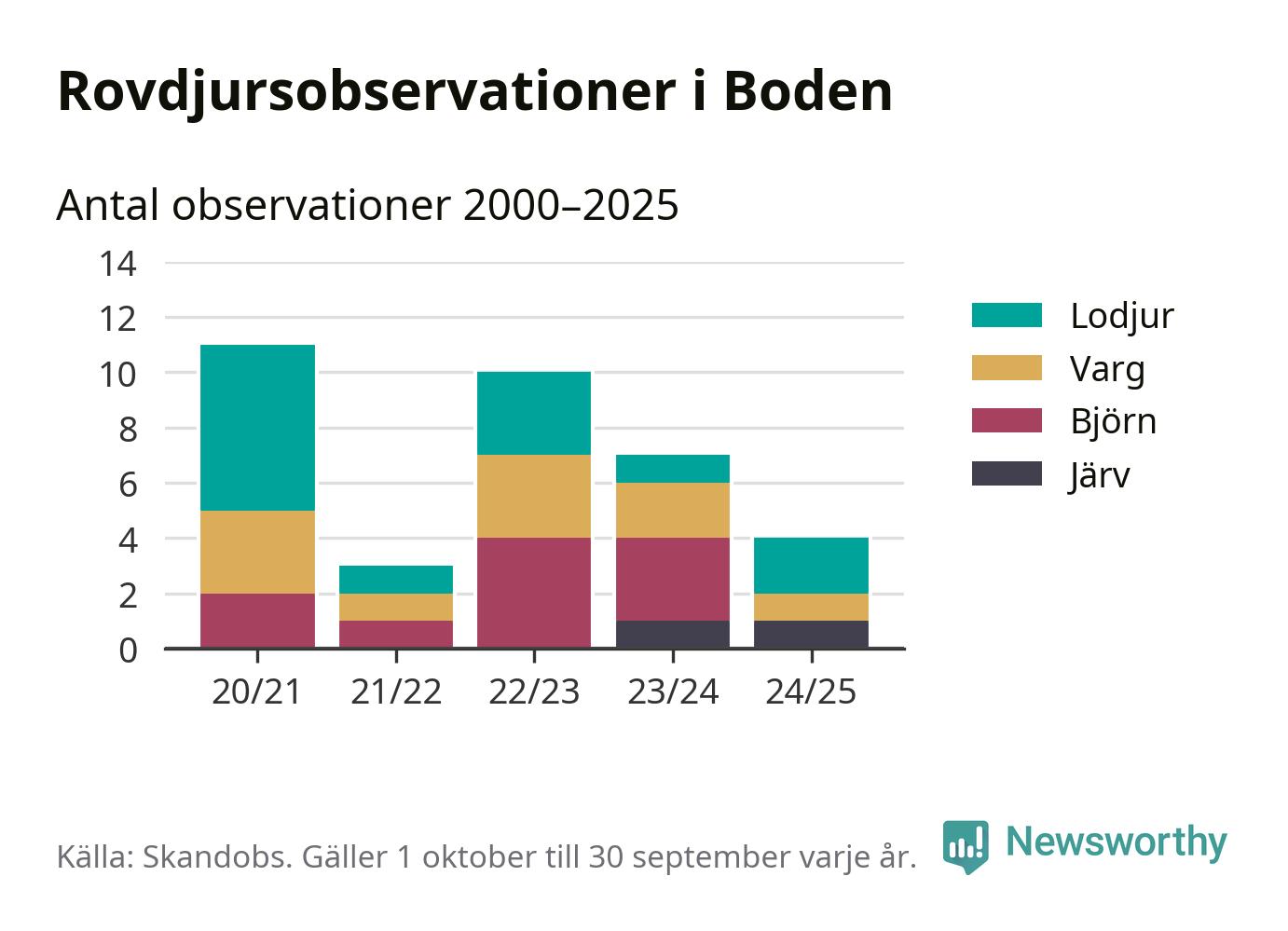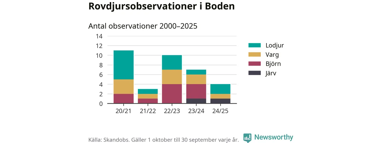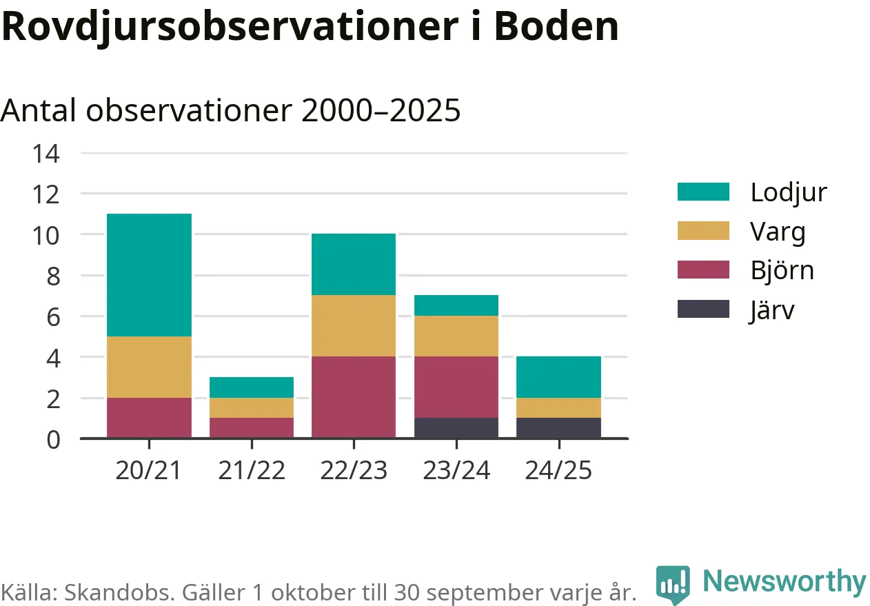 Där kan vem som helst rapportera sina observationer av de stora rovdjuren björn, varg, lodjur och järv. Mellan 1 oktober 2024 och 30 september i år har knappt 10 000 observationer registrerats i landet. Det kan vara synobservationer, foton, spår, spillning, döda bytesdjur eller andra tecken på rovdjursförekomst. I Boden handlar det om totalt fyra observationer av lodjur, järv eller varg.