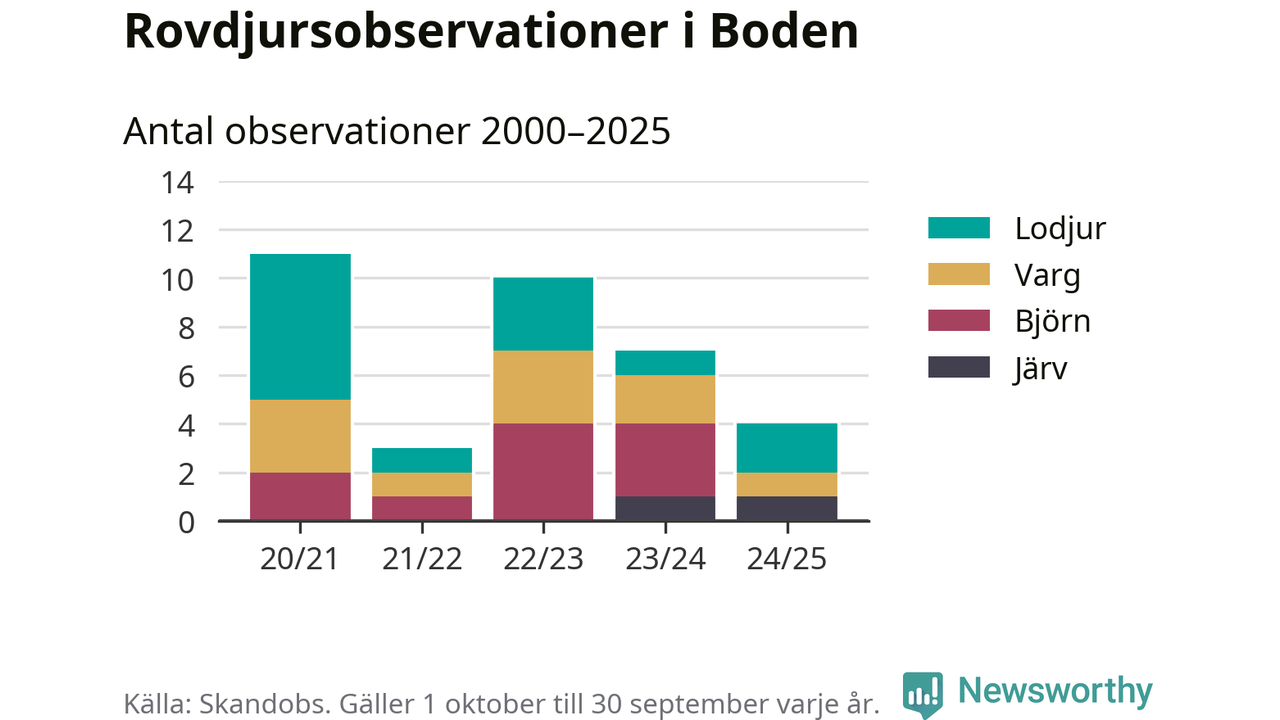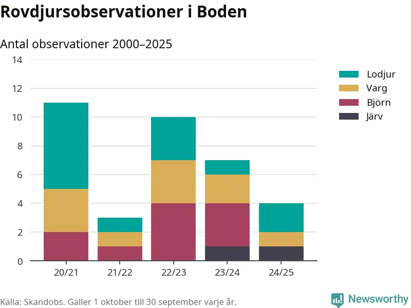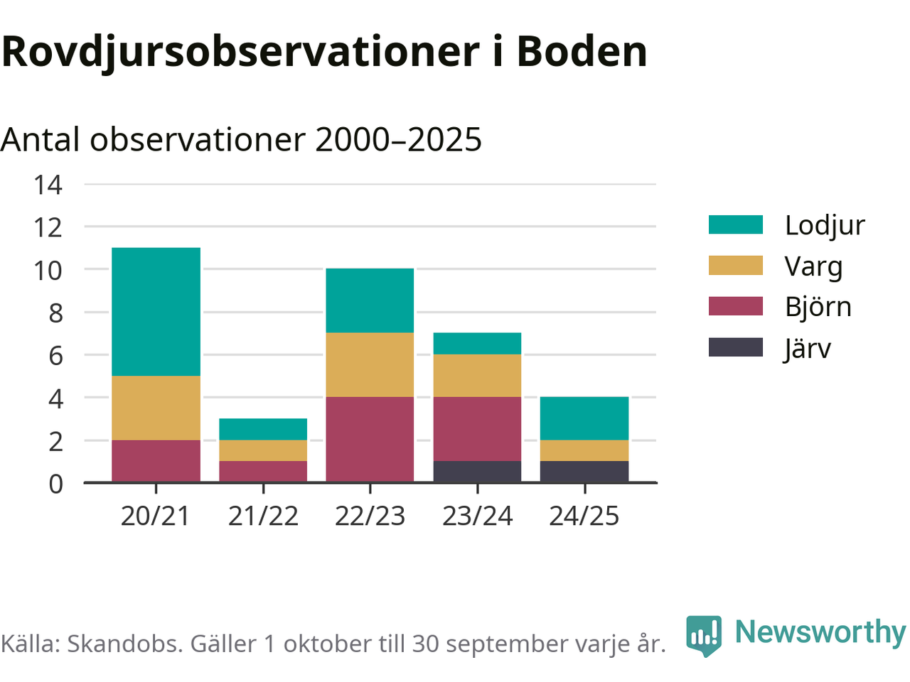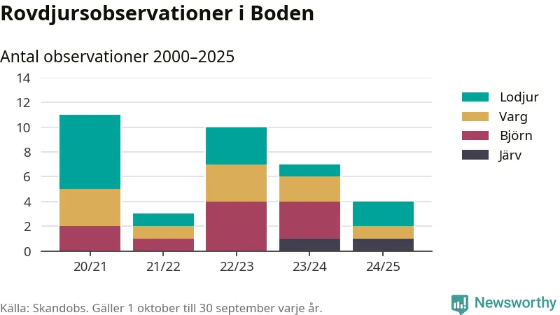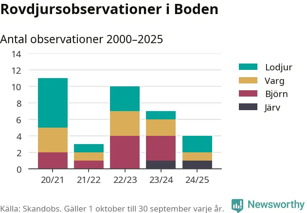 Där kan vem som helst rapportera sina observationer av de stora rovdjuren björn, varg, lodjur och järv. Mellan 1 oktober 2024 och 30 september i år har knappt 10 000 observationer registrerats i landet. Det kan vara synobservationer, foton, spår, spillning, döda bytesdjur eller andra tecken på rovdjursförekomst. I Boden handlar det om totalt fyra observationer av lodjur, järv eller varg.