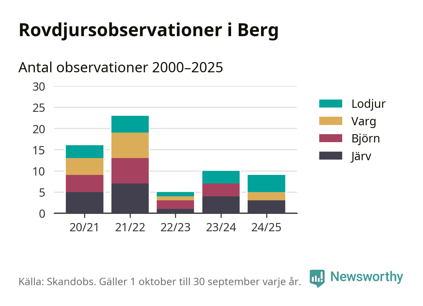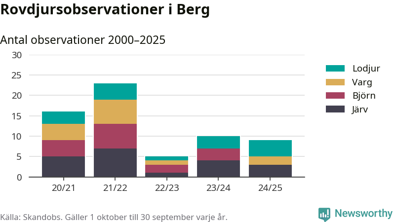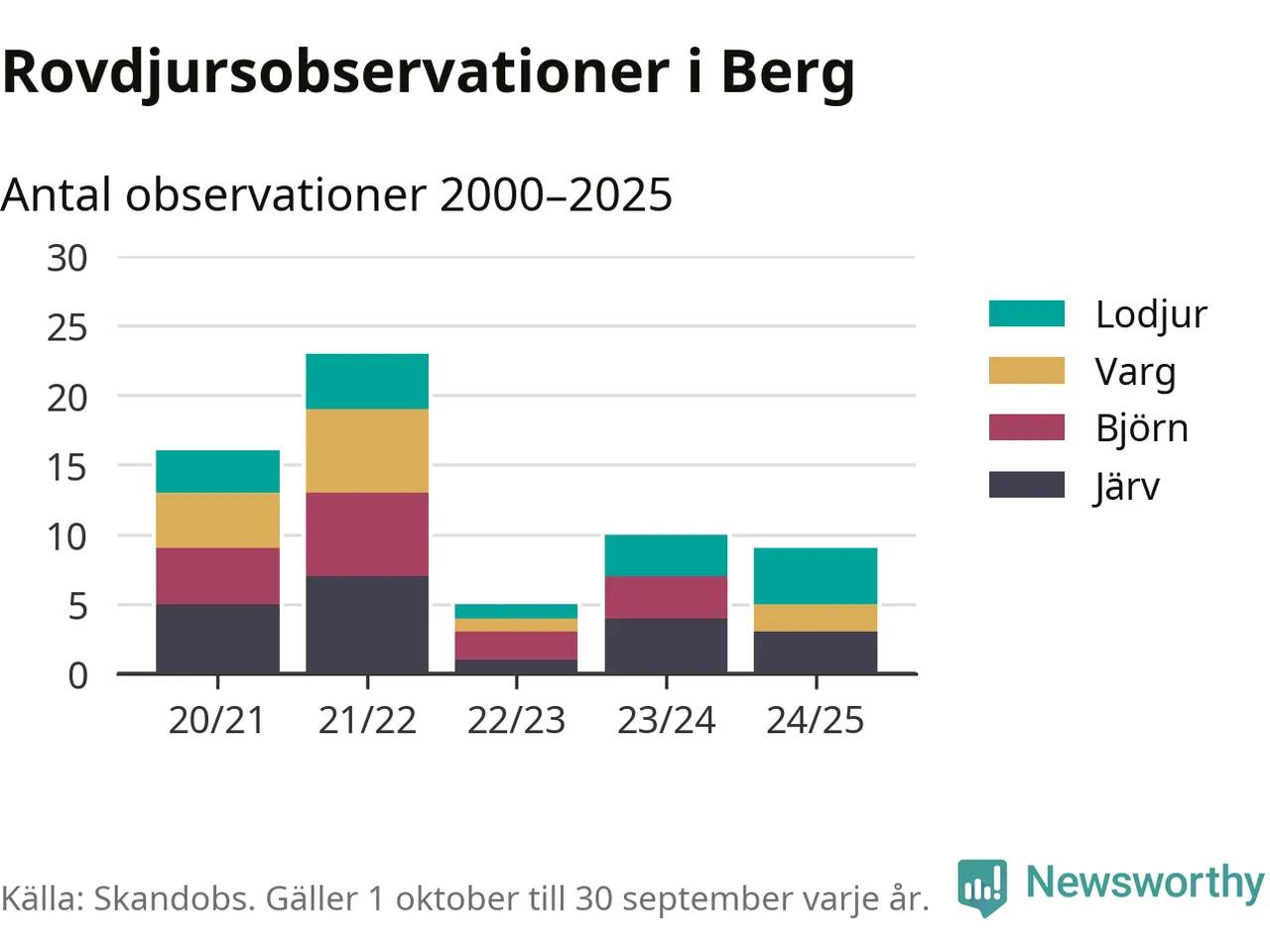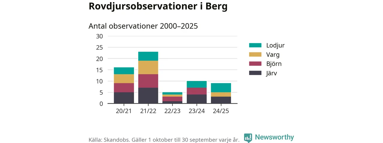 Där kan vem som helst rapportera sina observationer av de stora rovdjuren björn, varg, lodjur och järv. Mellan 1 oktober 2024 och 30 september i år har knappt 10 000 observationer registrerats i landet. Det kan vara synobservationer, foton, spår, spillning, döda bytesdjur eller andra tecken på rovdjursförekomst. I Berg handlar det om totalt nio observationer av lodjur, järv eller varg.