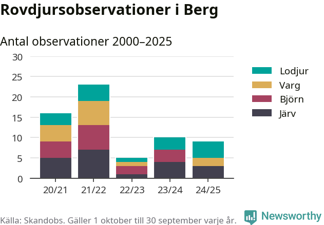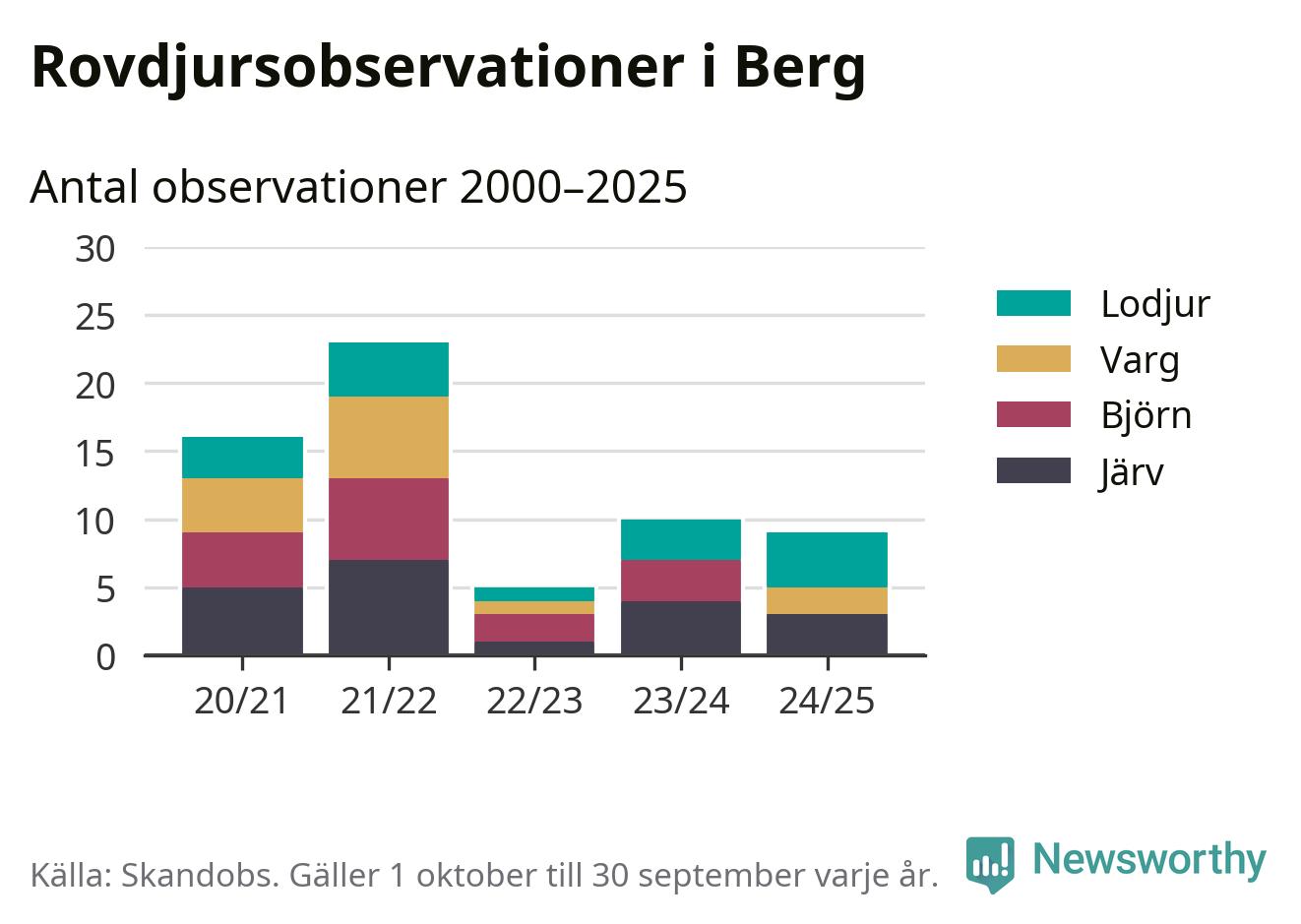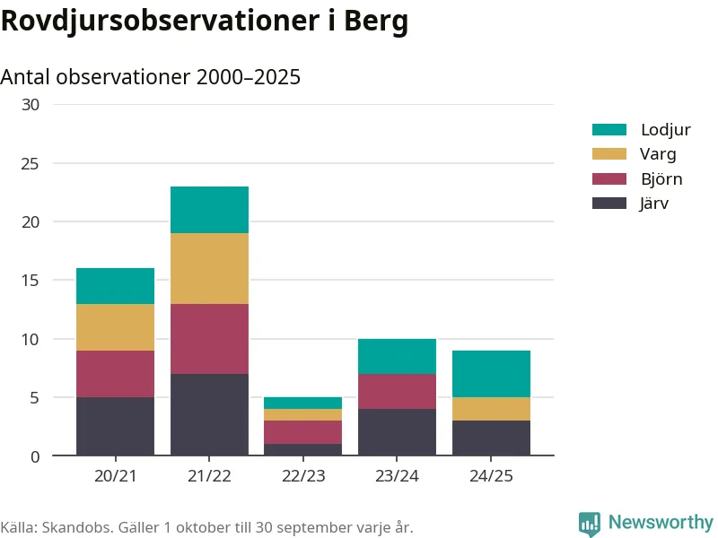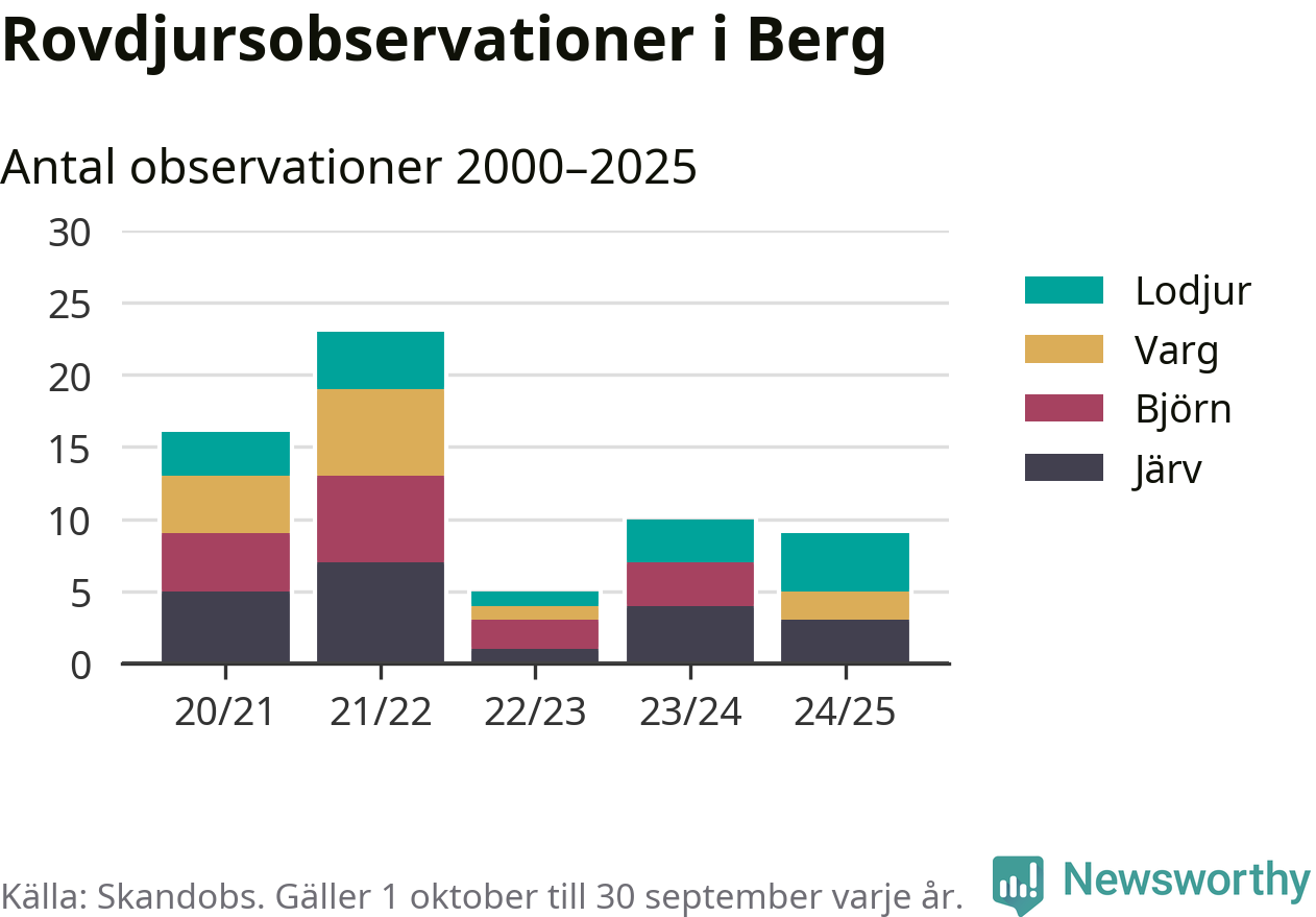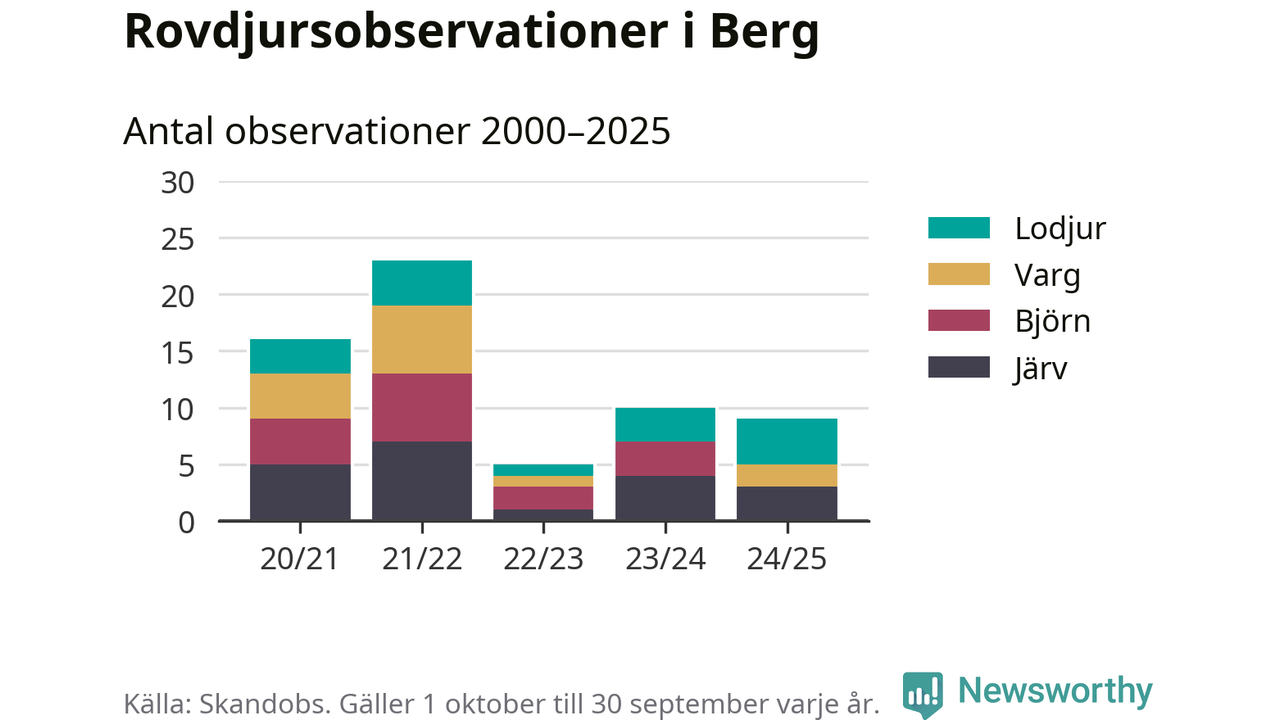 Där kan vem som helst rapportera sina observationer av de stora rovdjuren björn, varg, lodjur och järv. Mellan 1 oktober 2024 och 30 september i år har knappt 10 000 observationer registrerats i landet. Det kan vara synobservationer, foton, spår, spillning, döda bytesdjur eller andra tecken på rovdjursförekomst. I Berg handlar det om totalt nio observationer av lodjur, järv eller varg.