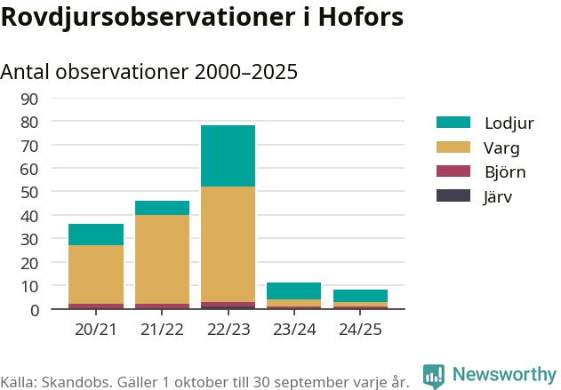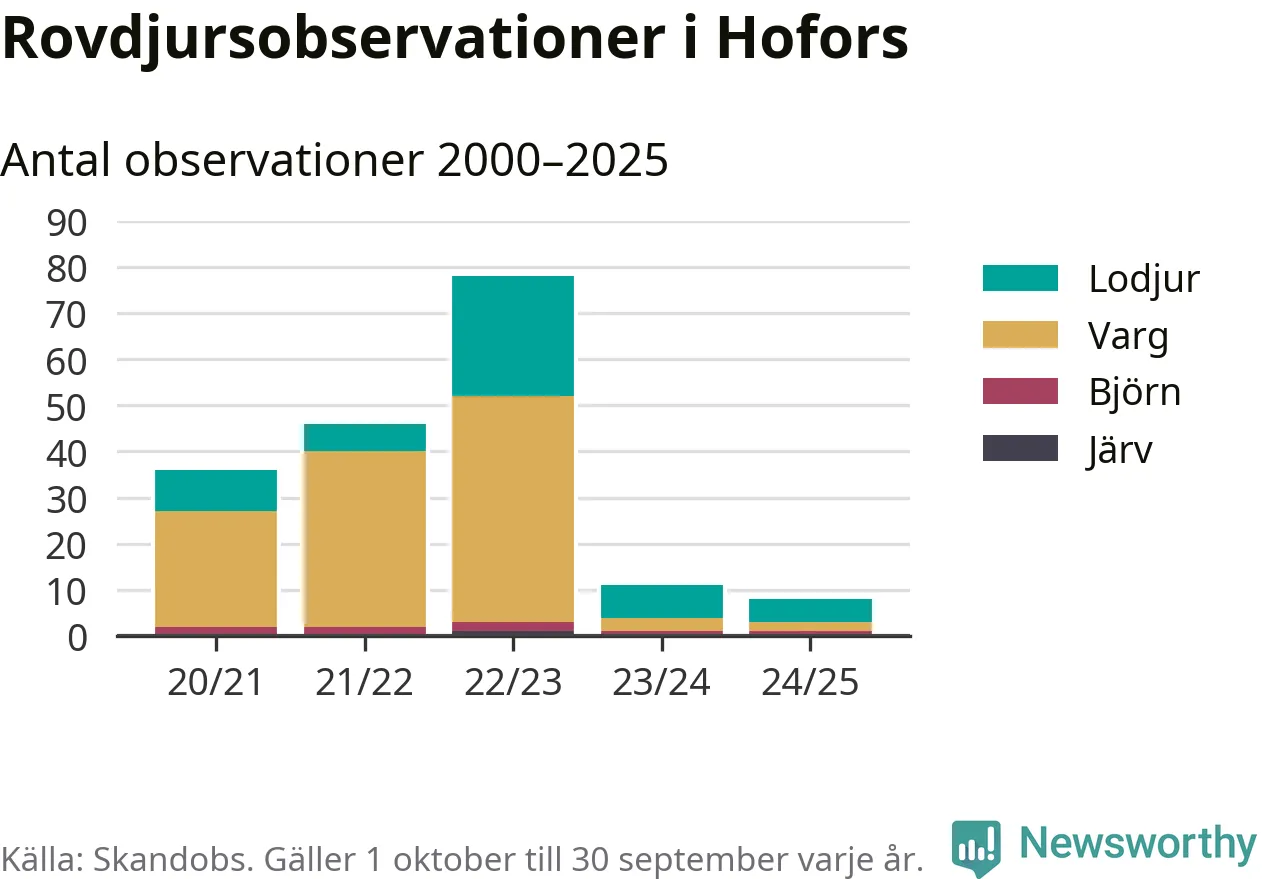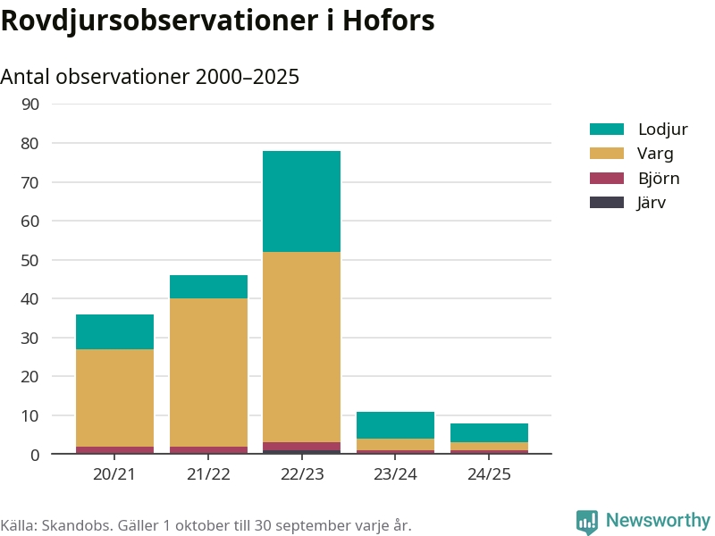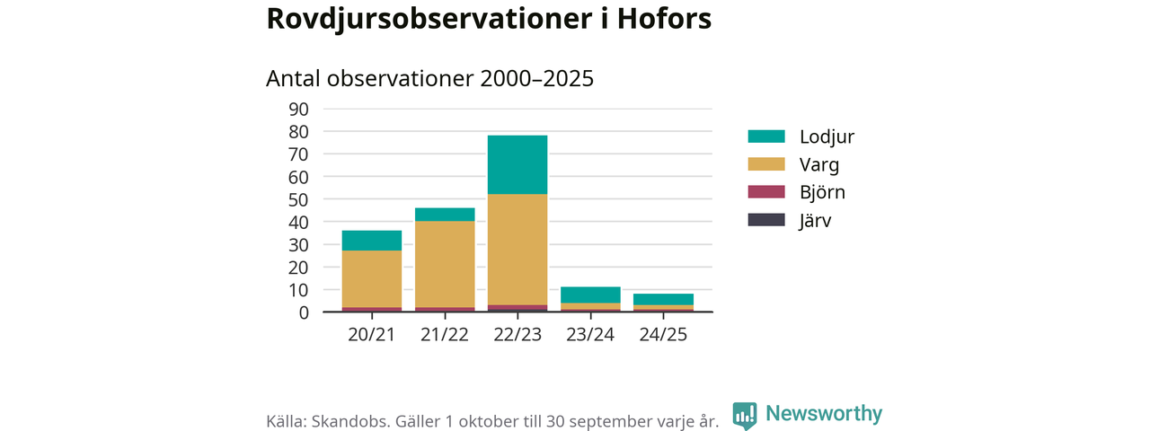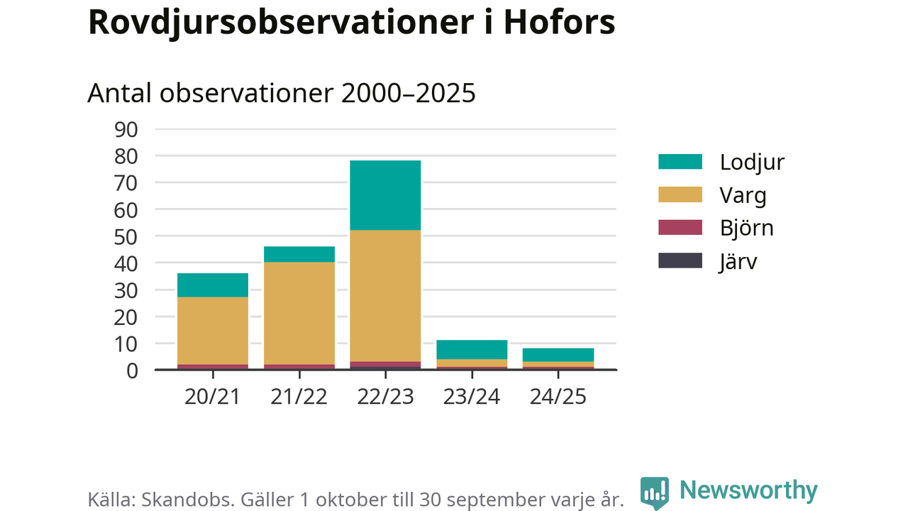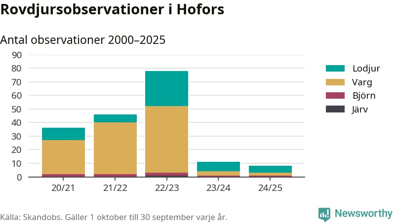 Där kan vem som helst rapportera sina observationer av de stora rovdjuren björn, varg, lodjur och järv. Mellan 1 oktober 2024 och 30 september i år har knappt 10 000 observationer registrerats i landet. Det kan vara synobservationer, foton, spår, spillning, döda bytesdjur eller andra tecken på rovdjursförekomst. I Hofors handlar det om totalt åtta observationer av lodjur, varg eller björn.