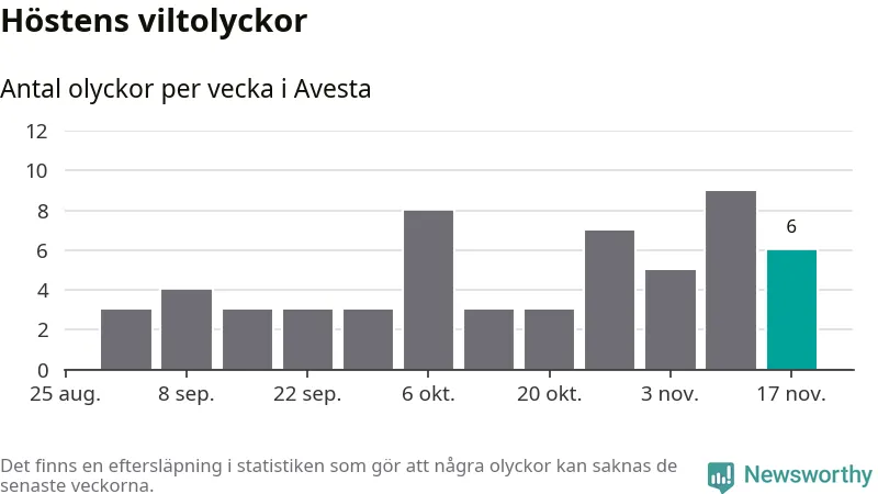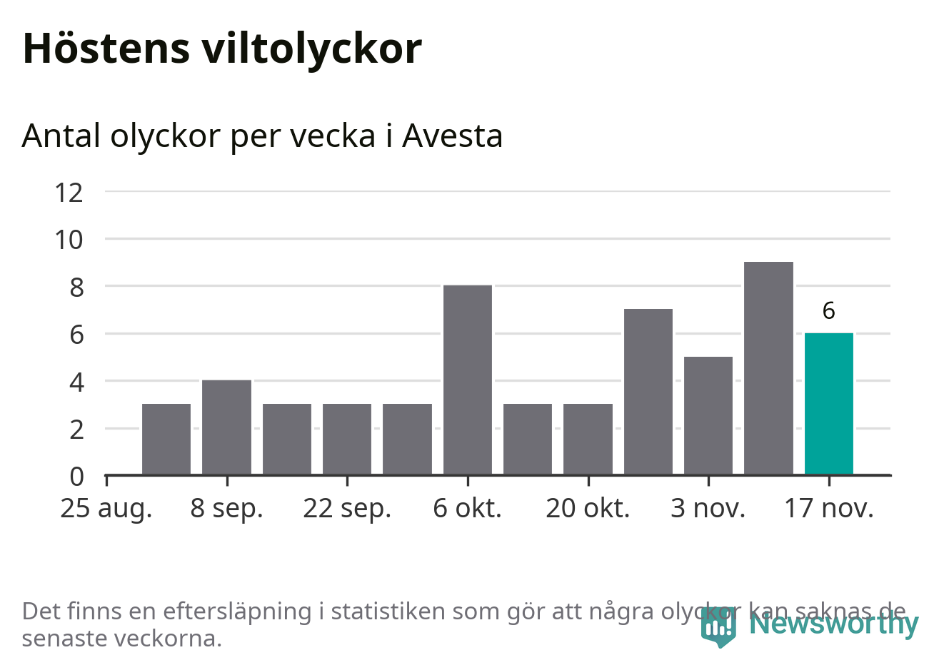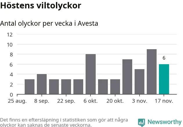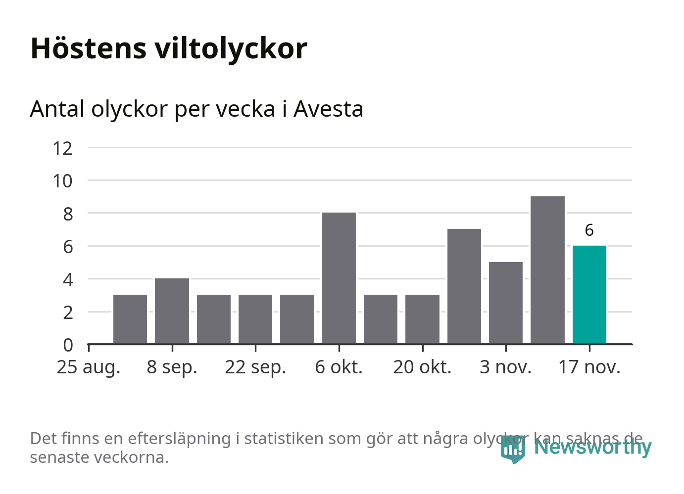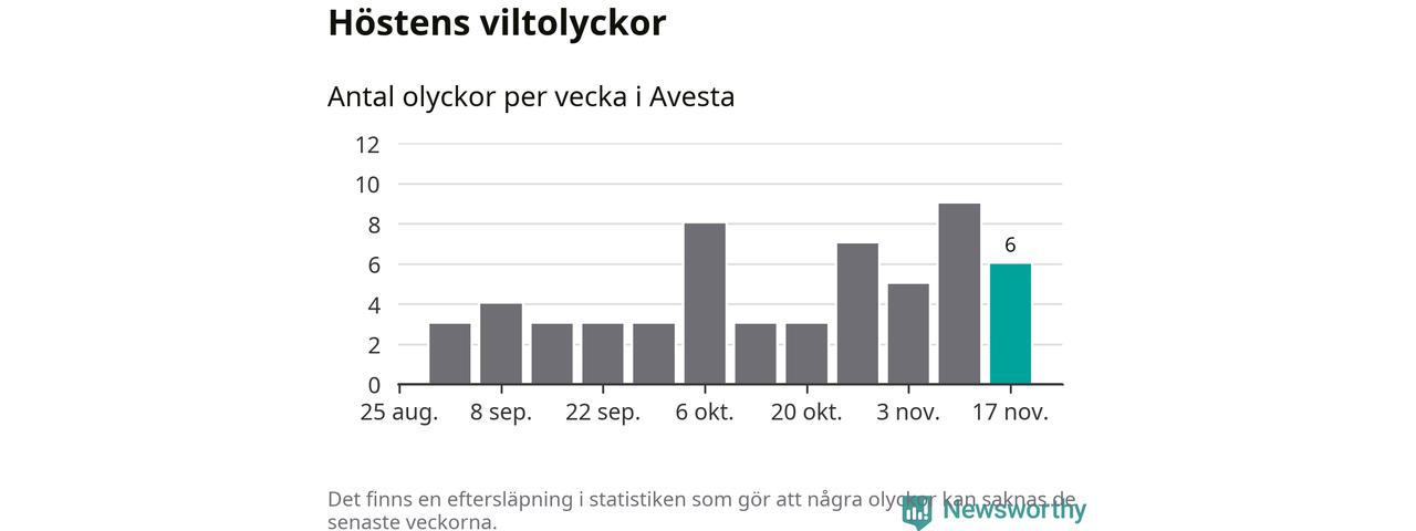 Hittills har sex viltolyckor rapporterats in i Avesta kommun från vecka 47. Se listan här.
