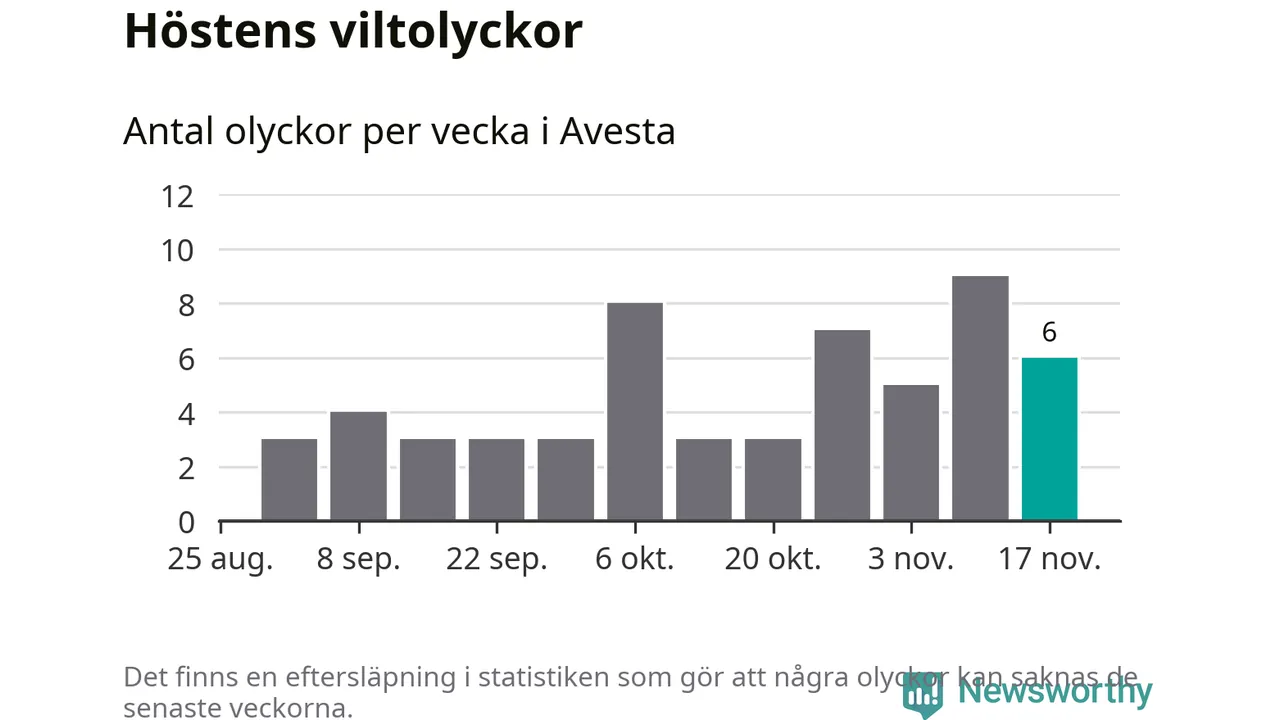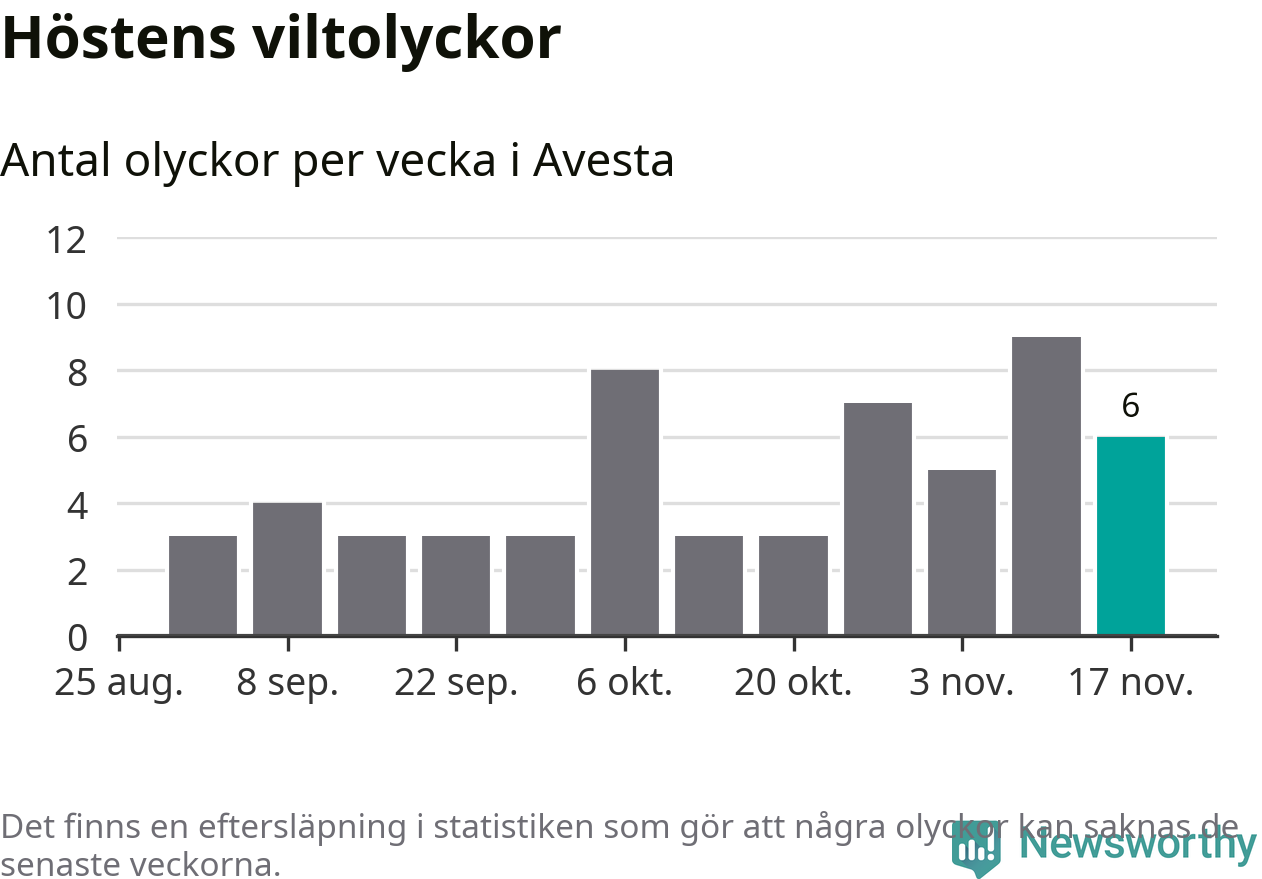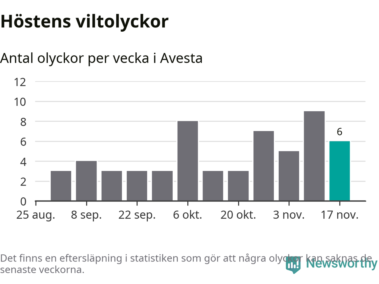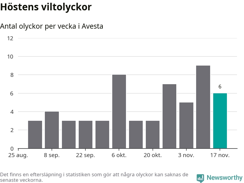 Hittills har sex viltolyckor rapporterats in i Avesta kommun från vecka 47. Se listan här.