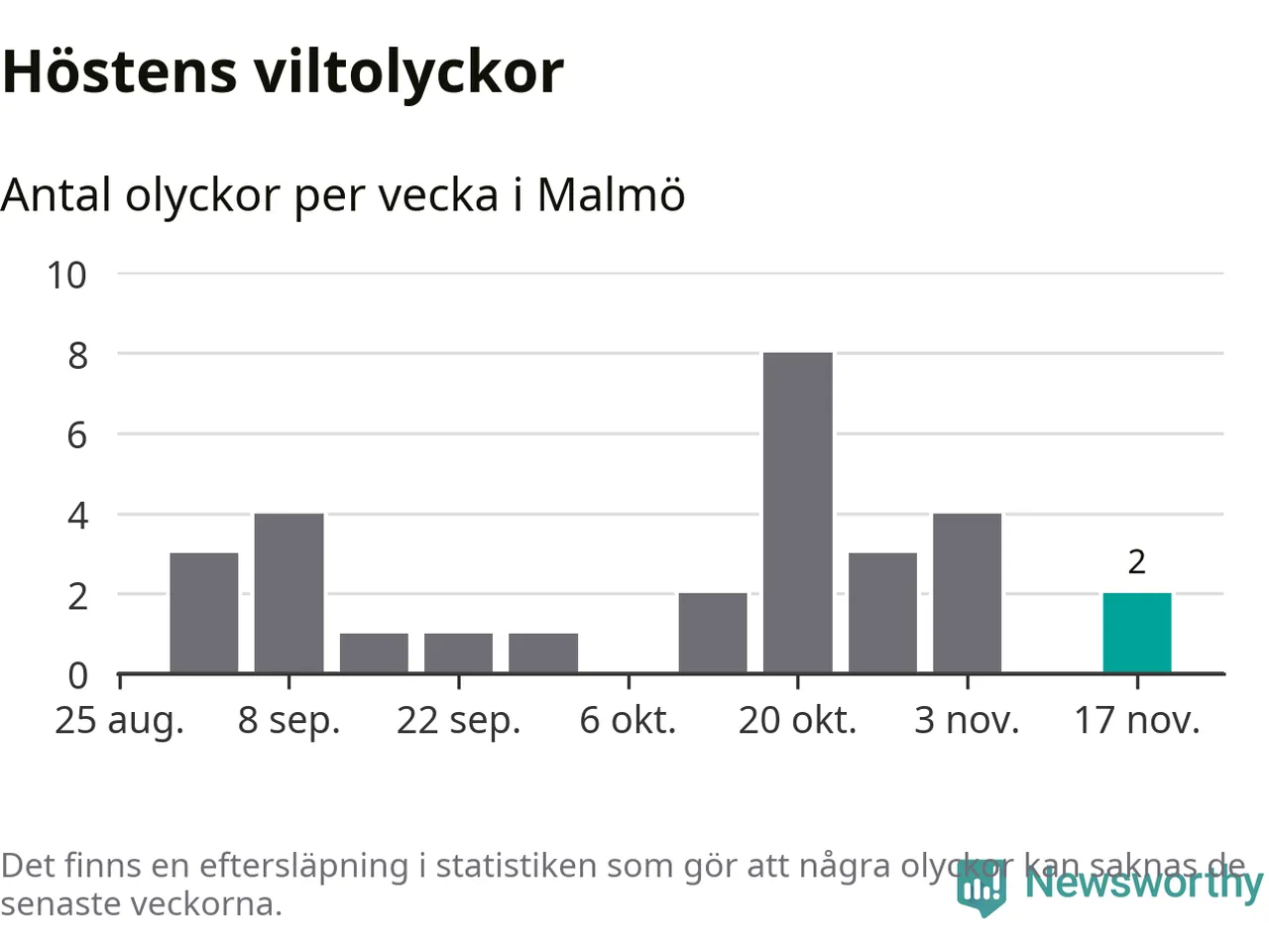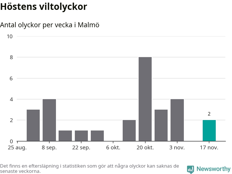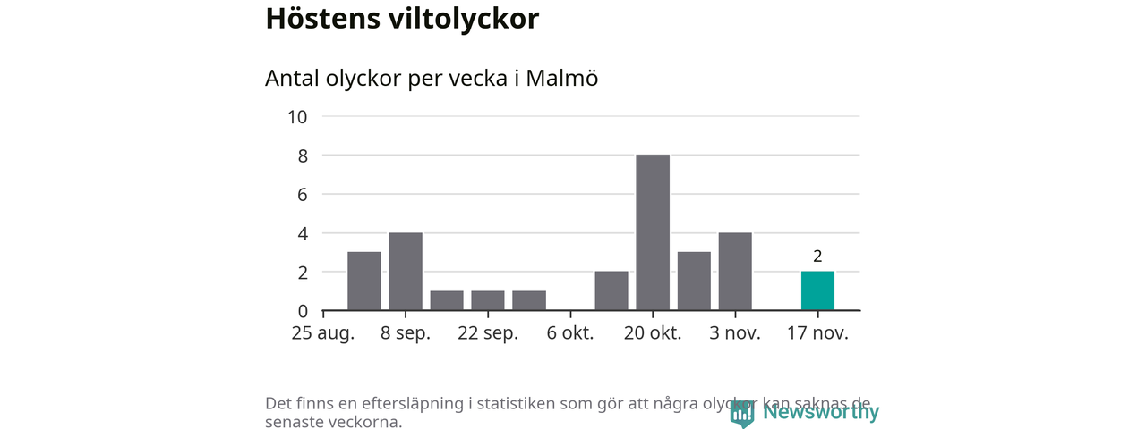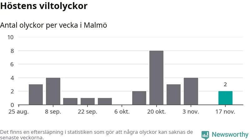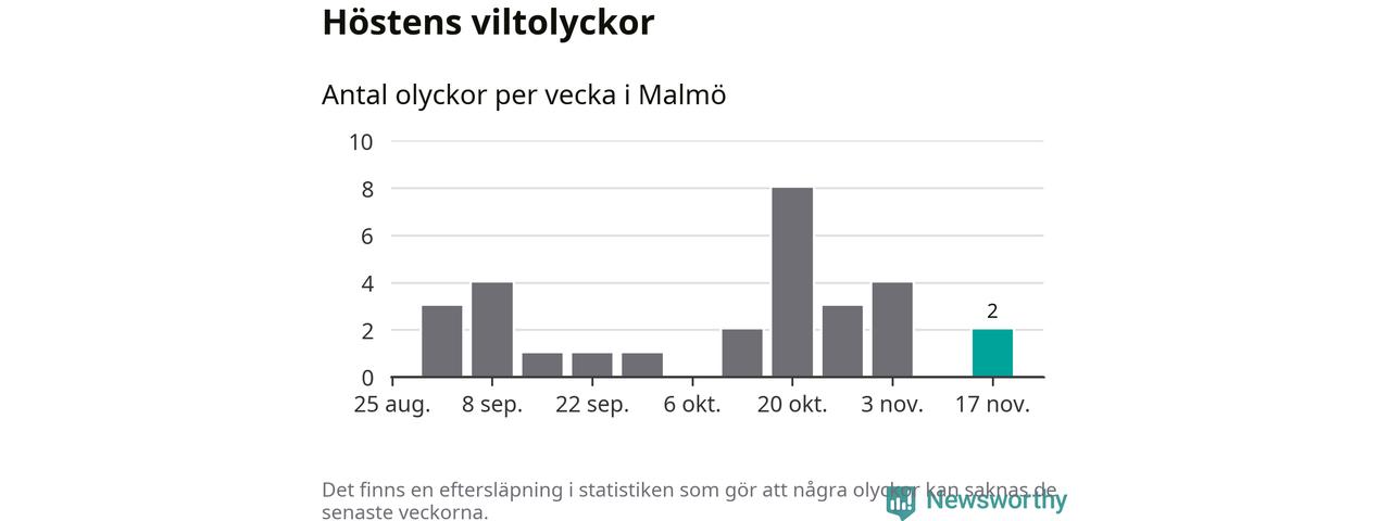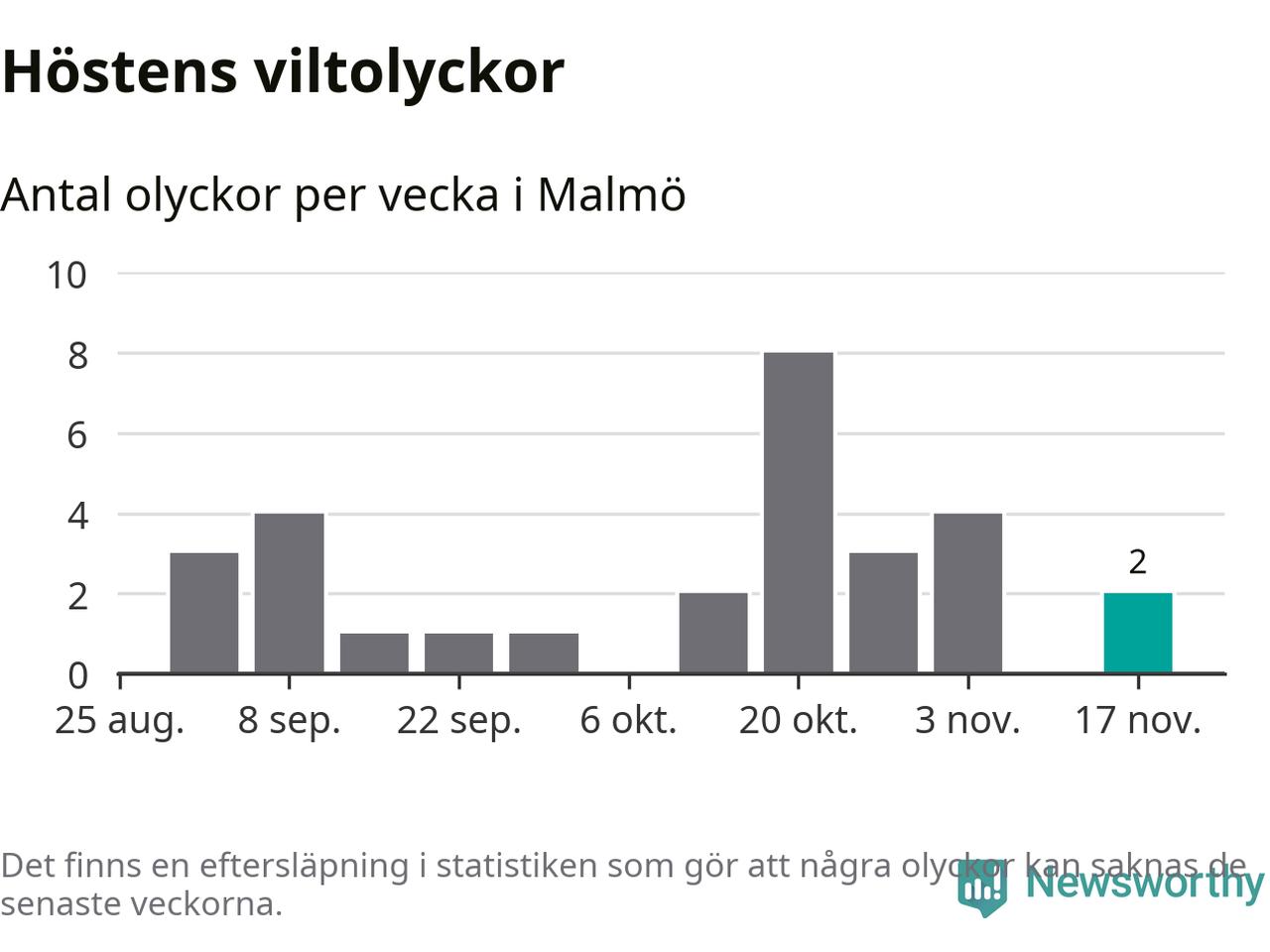 Hittills har två viltolyckor rapporterats in i Malmö kommun från vecka 47. Se listan här.
