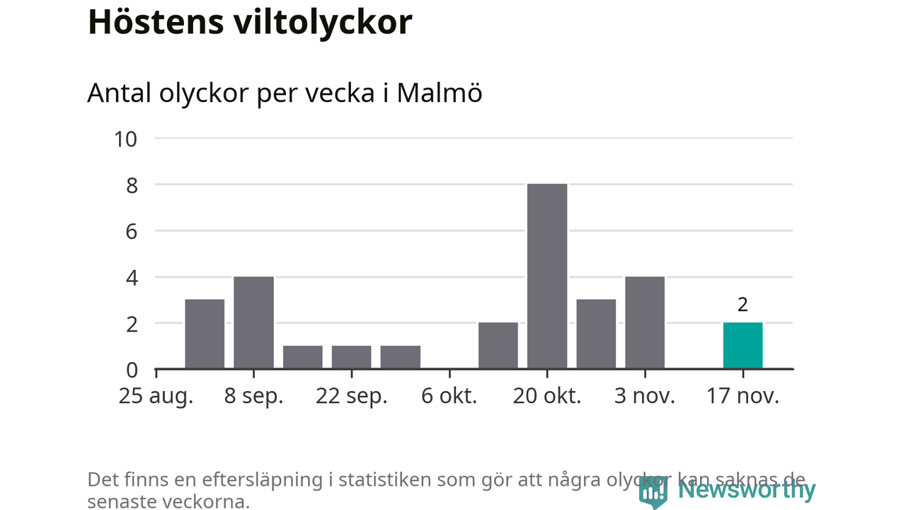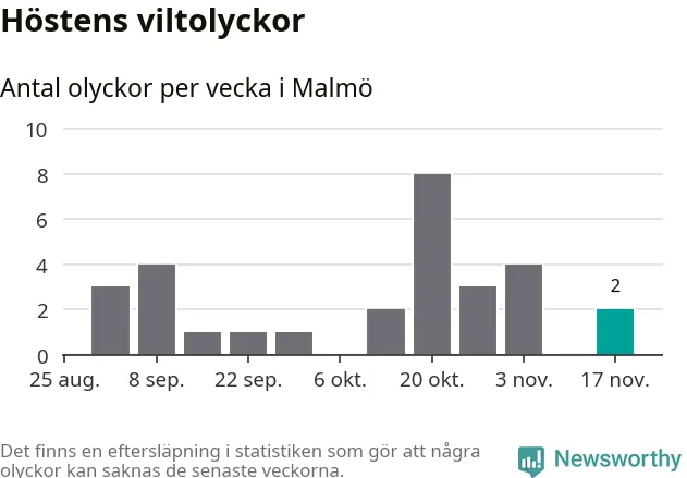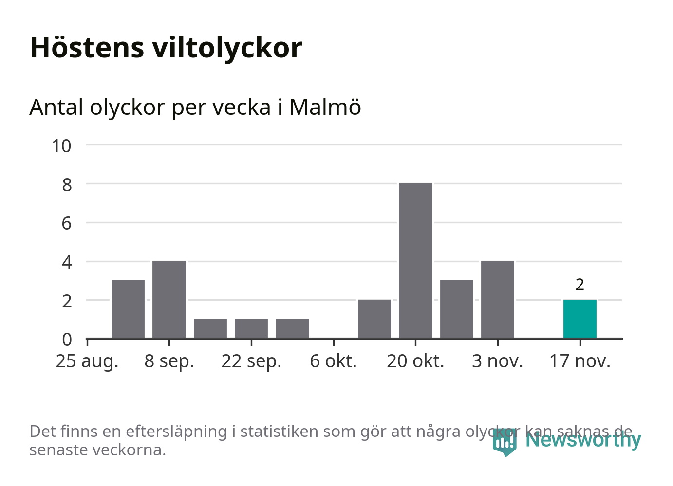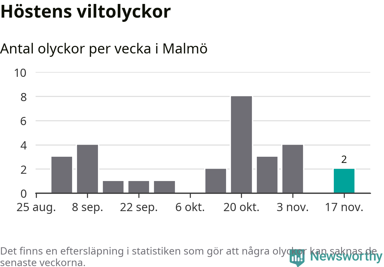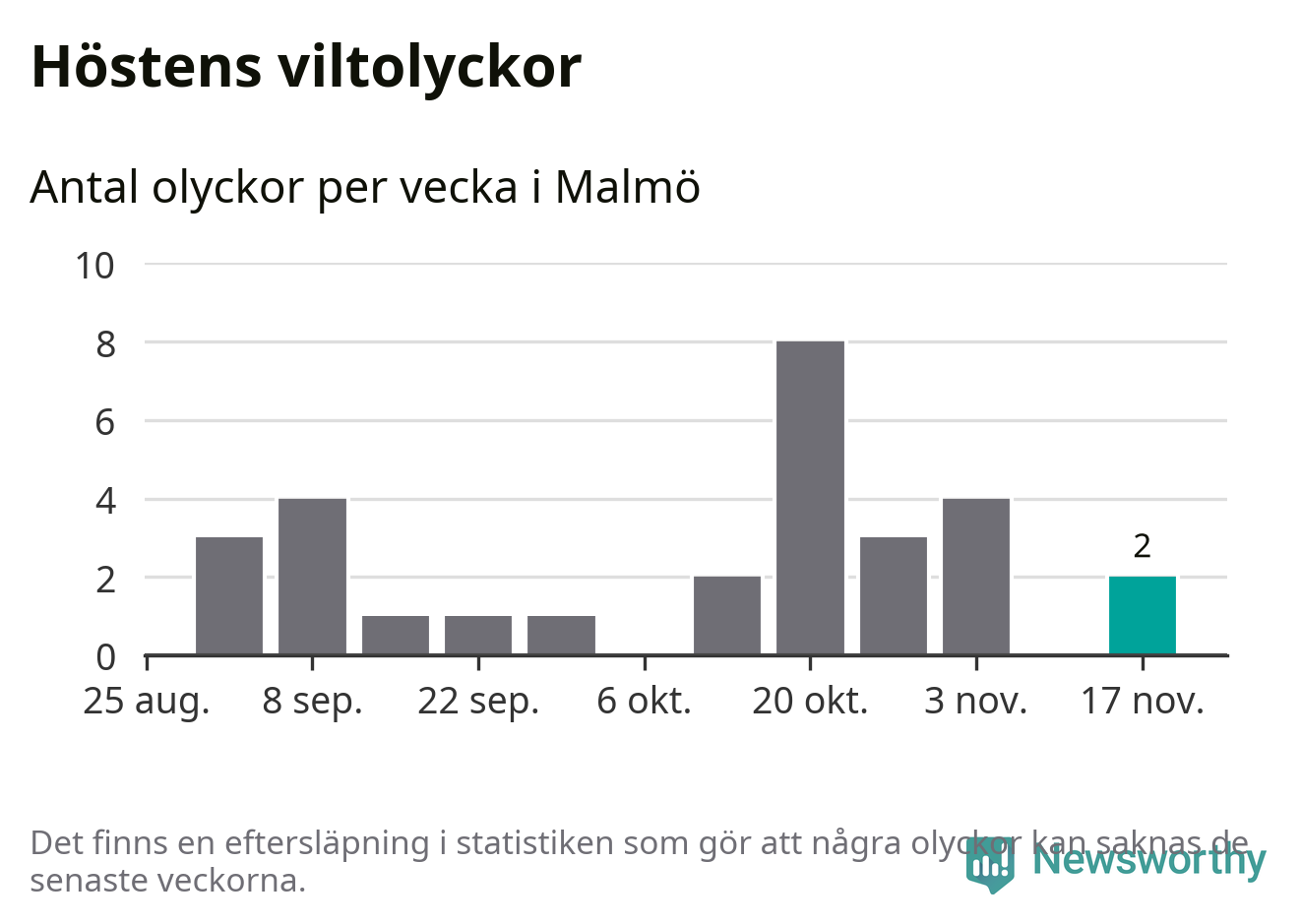 Hittills har två viltolyckor rapporterats in i Malmö kommun från vecka 47. Se listan här.