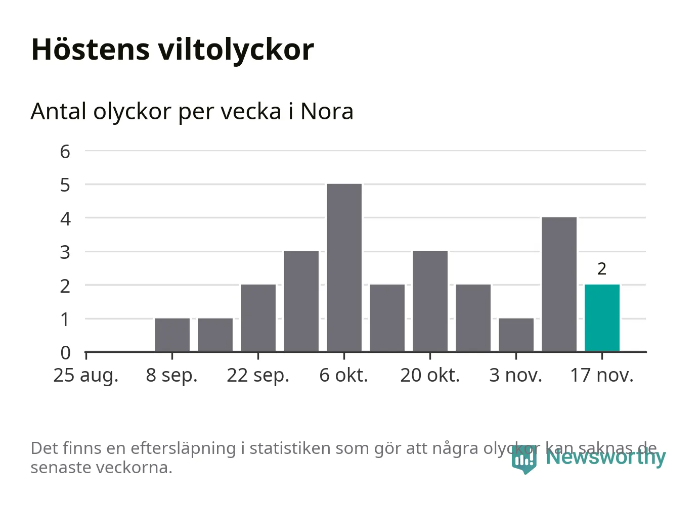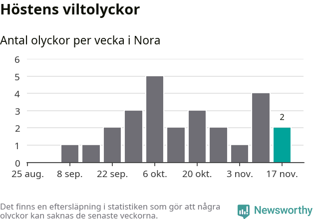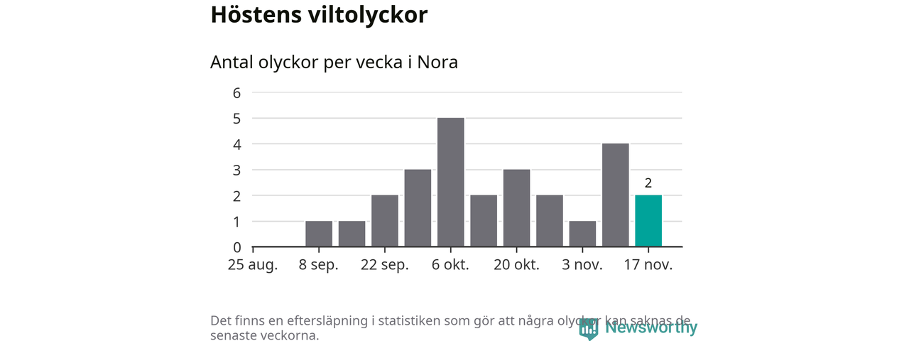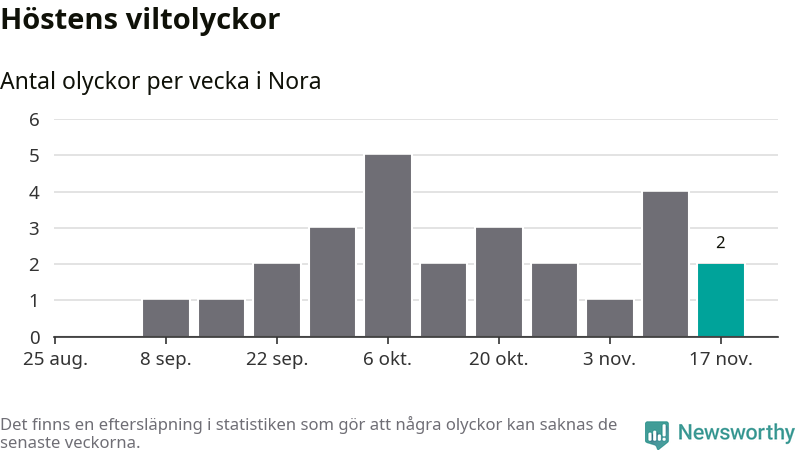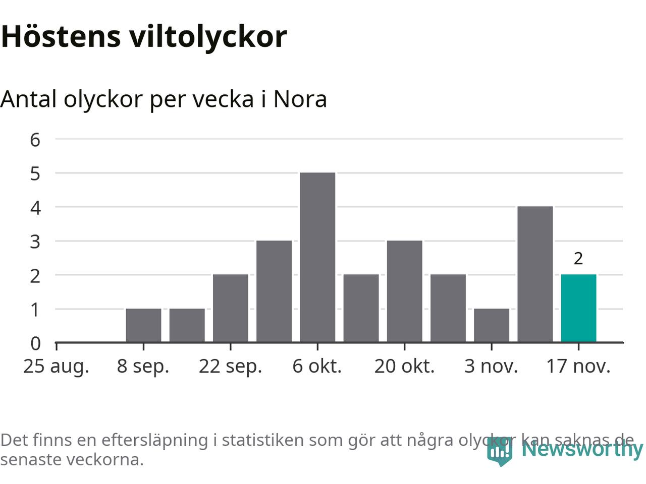 Hittills har två viltolyckor rapporterats in i Nora kommun från vecka 47. Se listan här.
