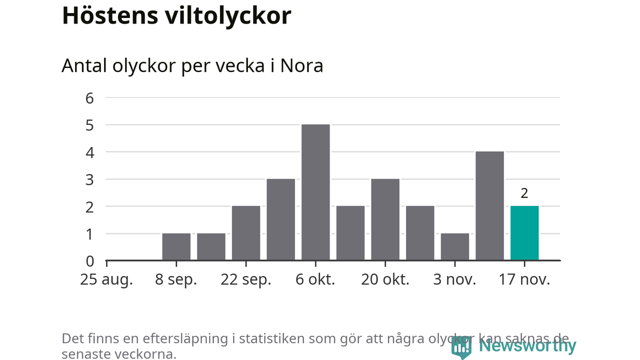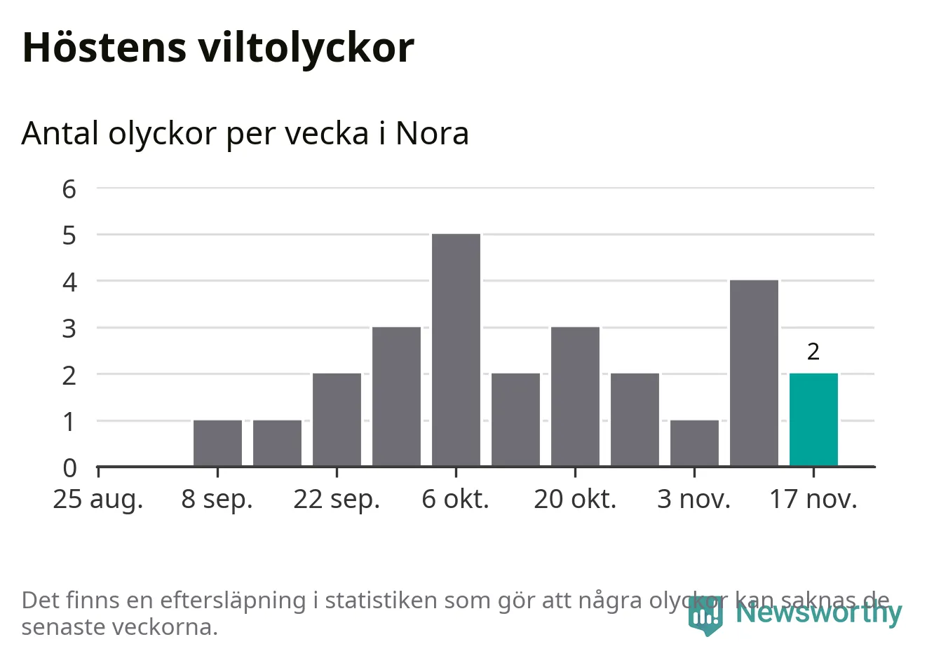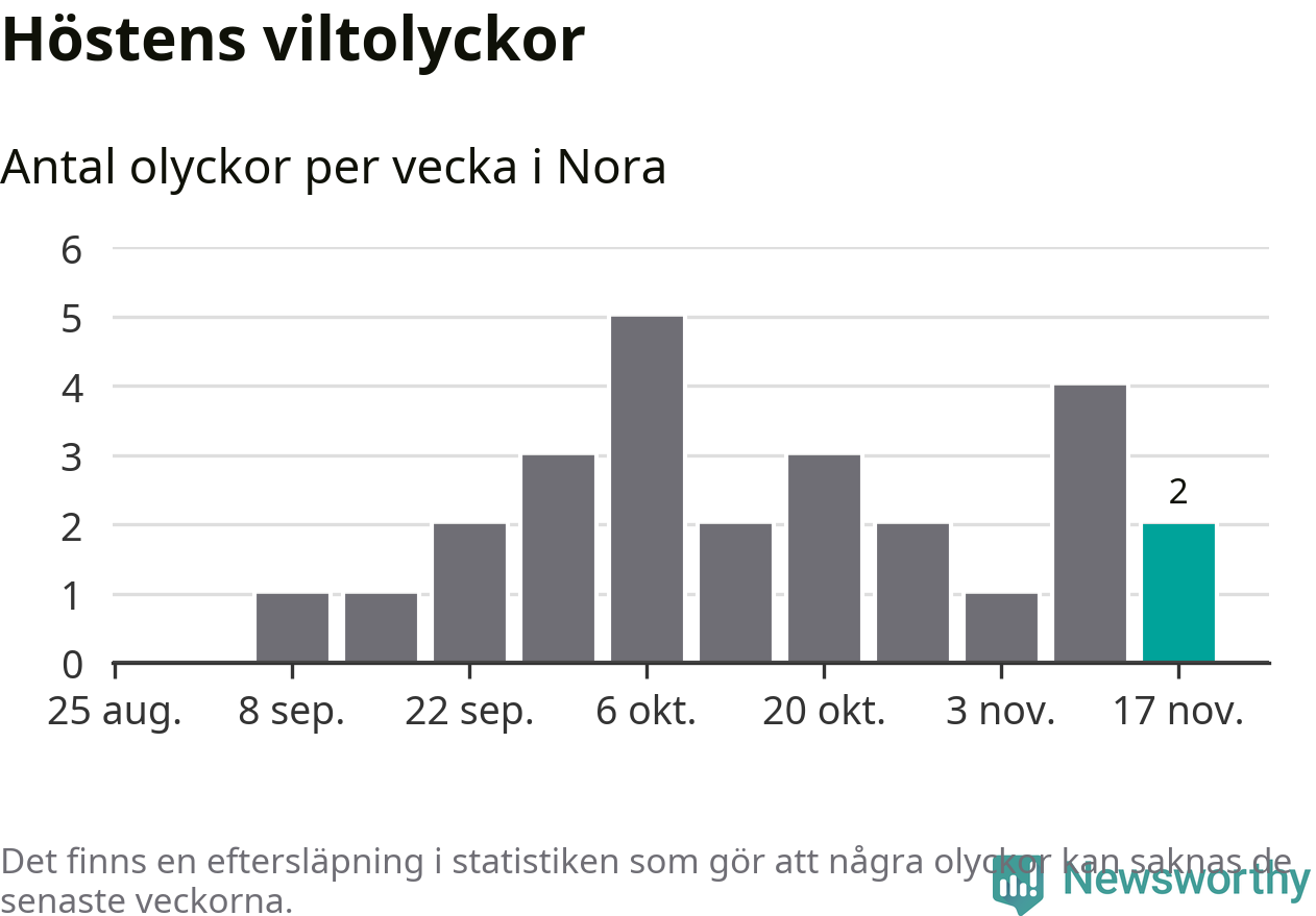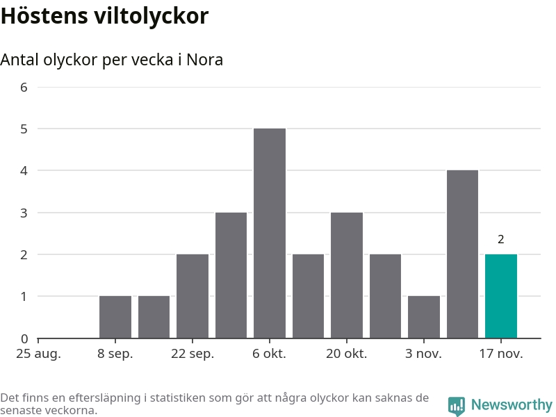 Hittills har två viltolyckor rapporterats in i Nora kommun från vecka 47. Se listan här.