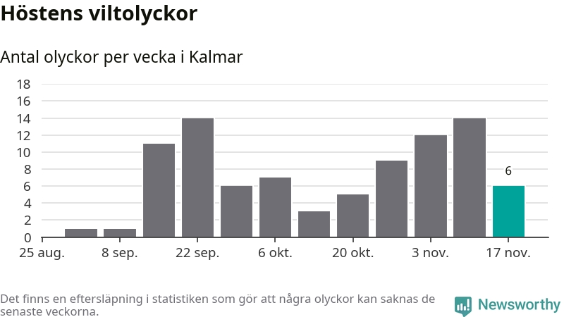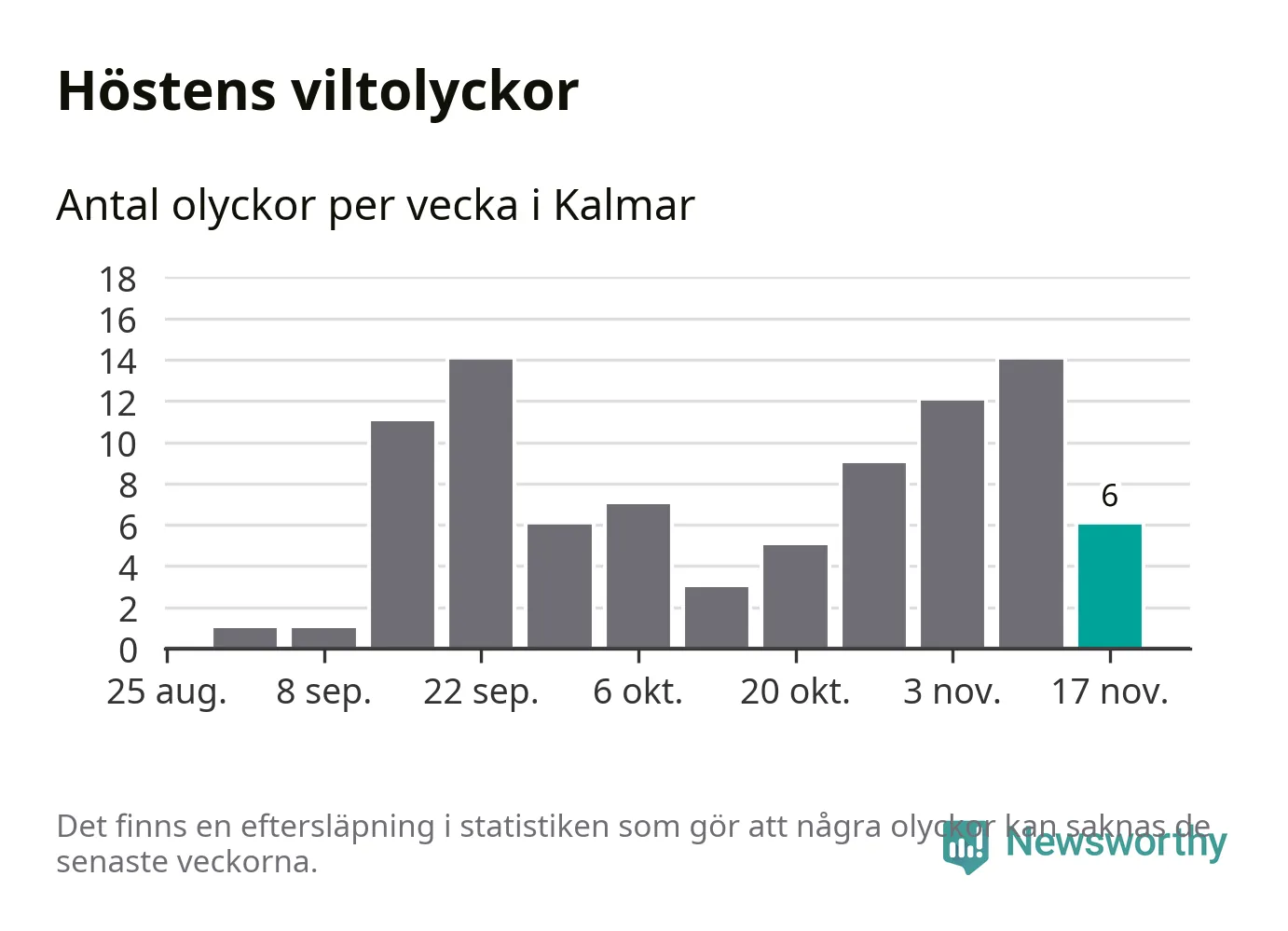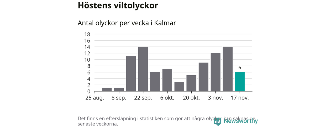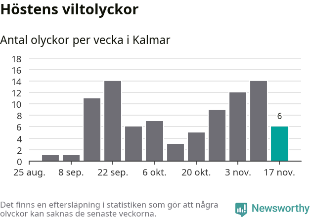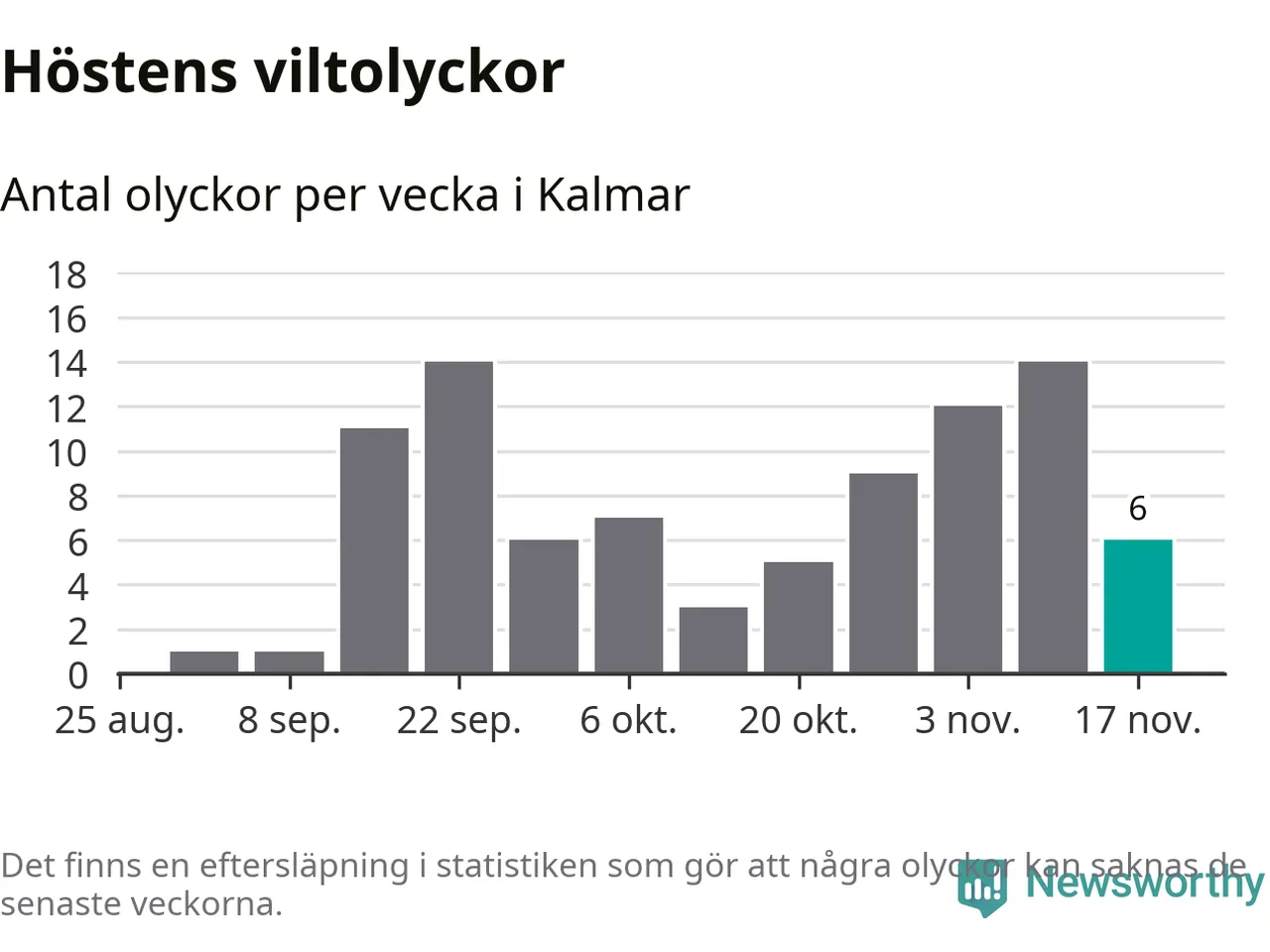 Hittills har sex viltolyckor rapporterats in i Kalmar kommun från vecka 47. Se listan här.