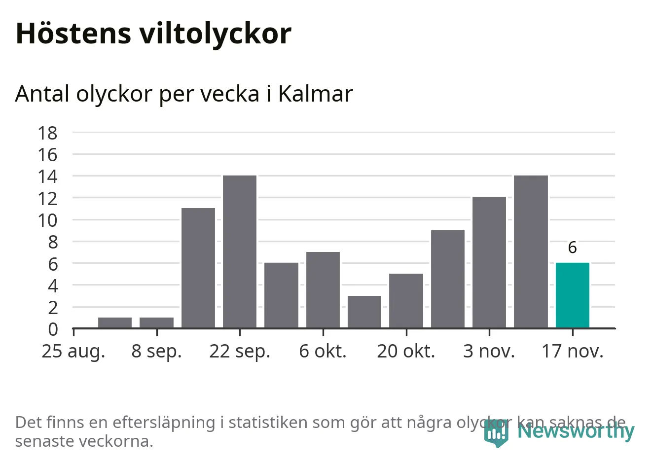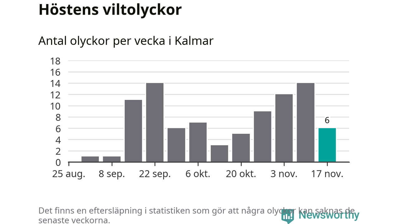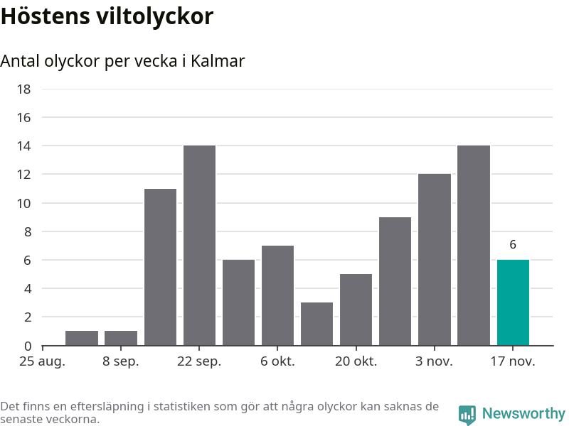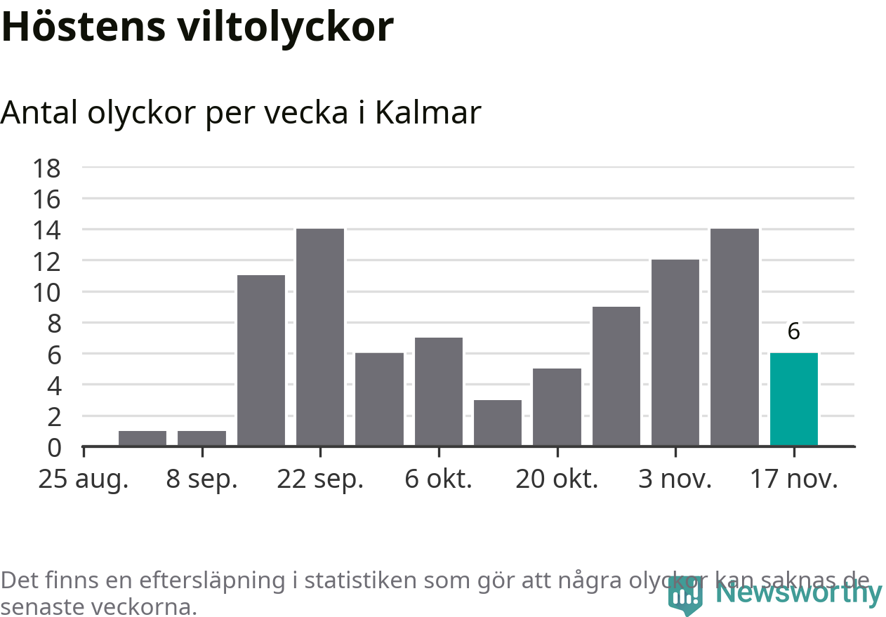 Hittills har sex viltolyckor rapporterats in i Kalmar kommun från vecka 47. Se listan här.