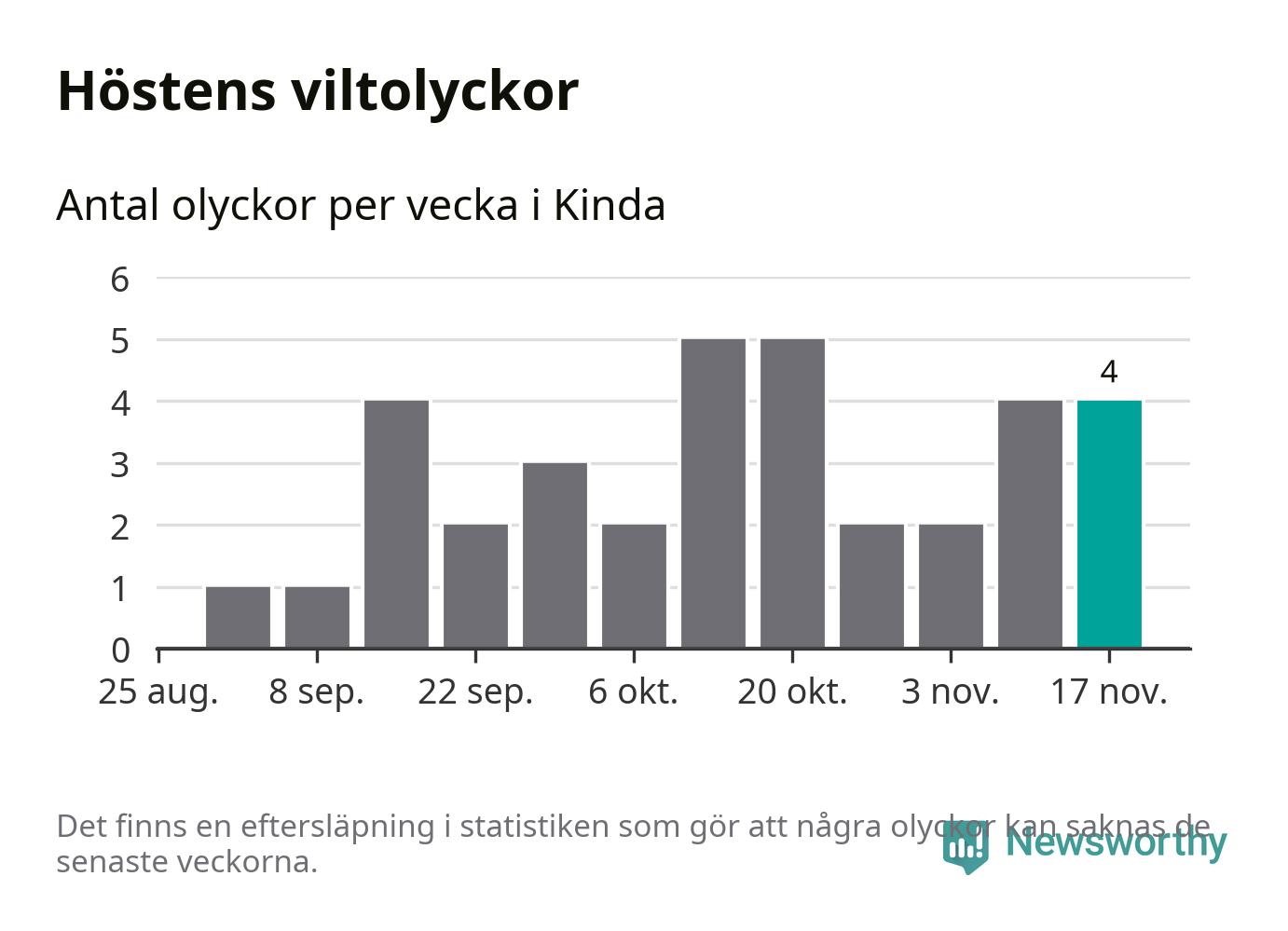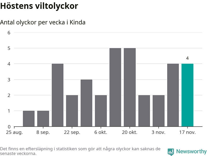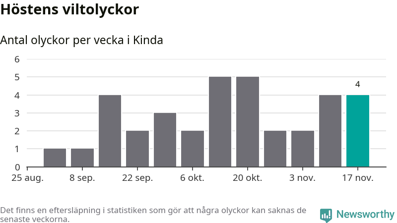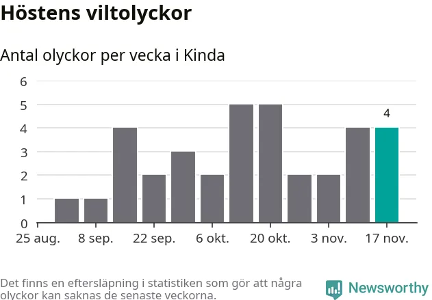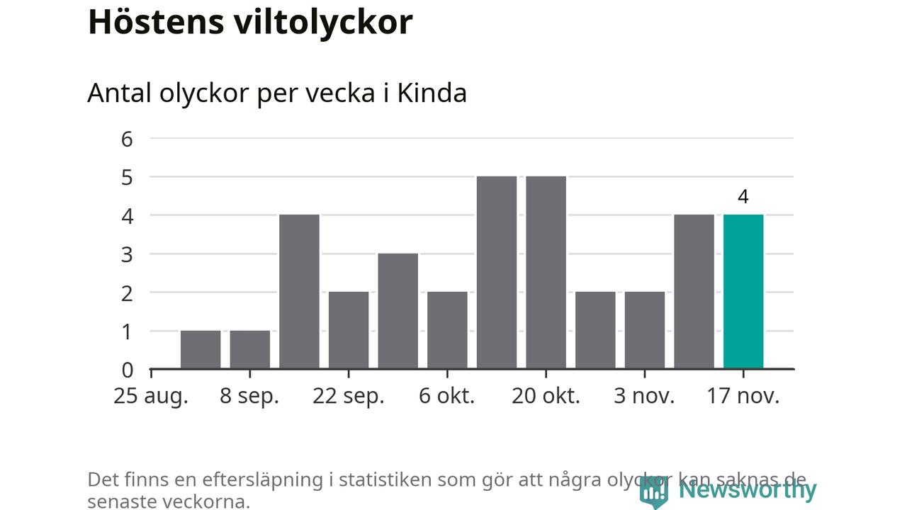Hittills har fyra viltolyckor rapporterats in i Kinda kommun från vecka 47. Se listan här.
