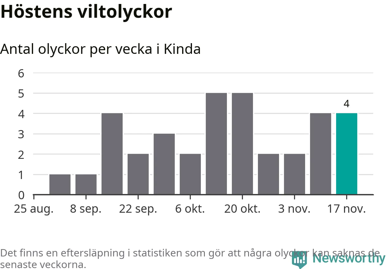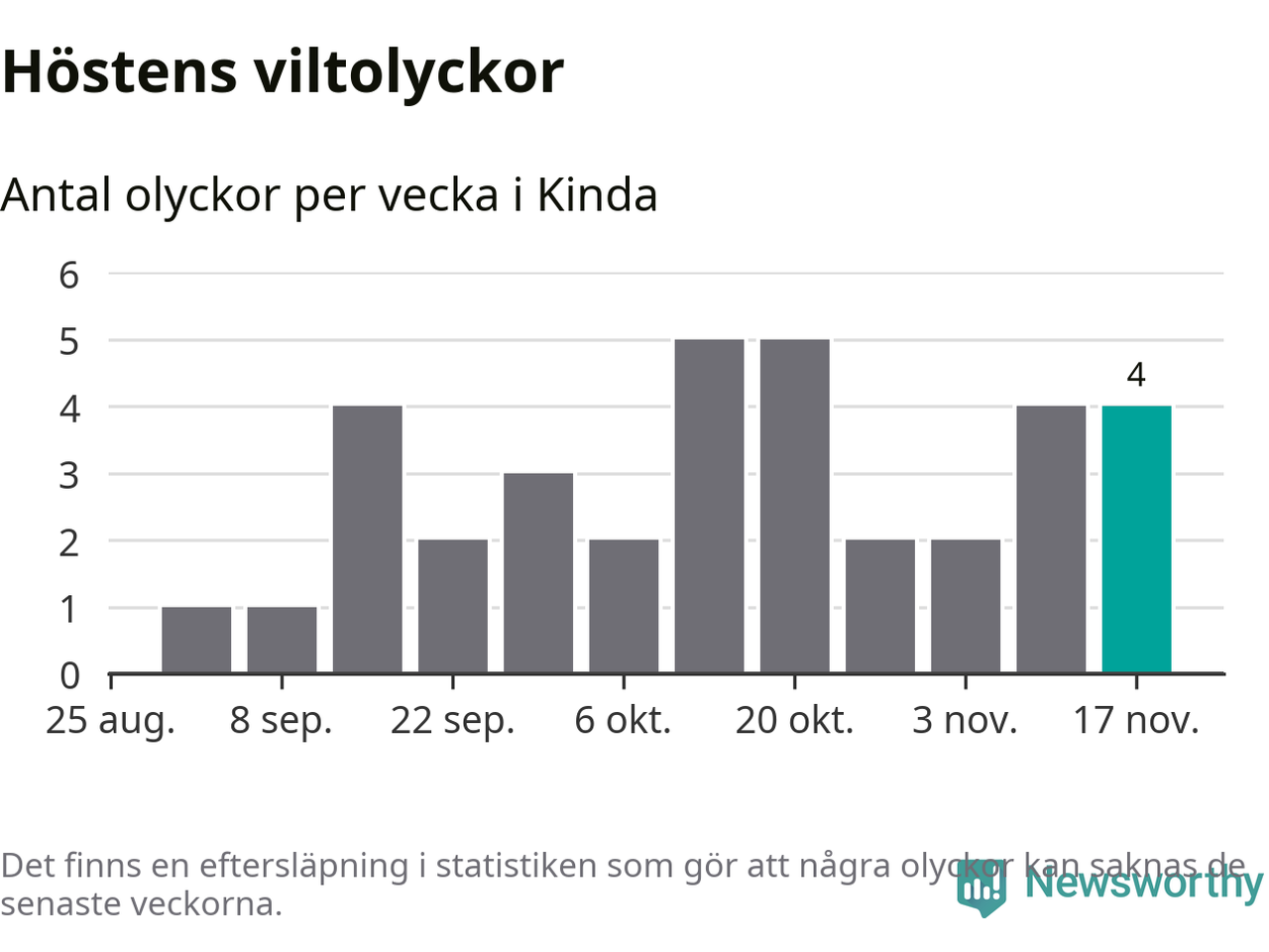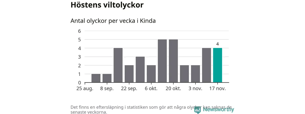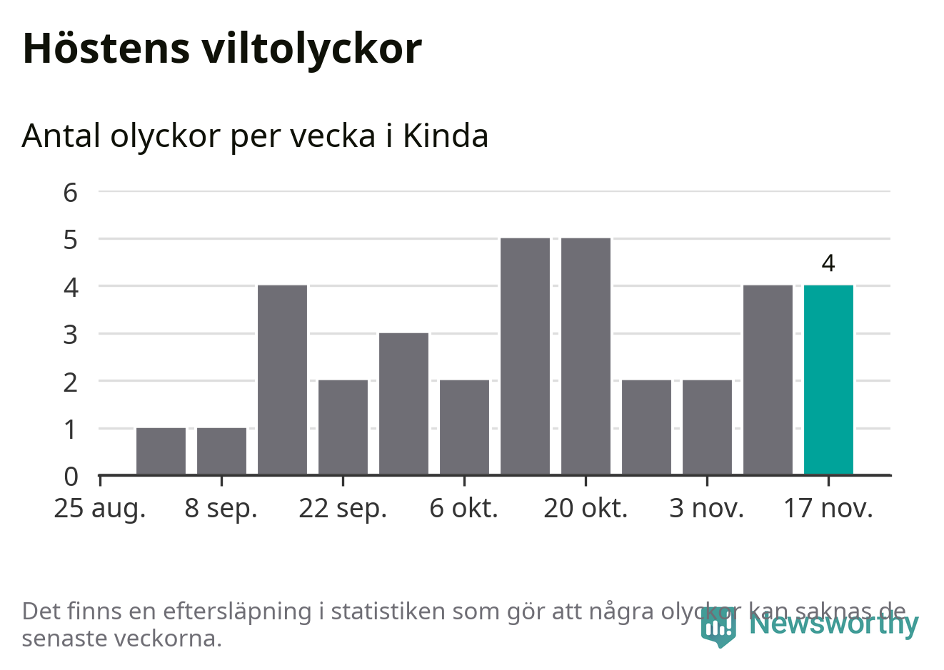 Hittills har fyra viltolyckor rapporterats in i Kinda kommun från vecka 47. Se listan här.