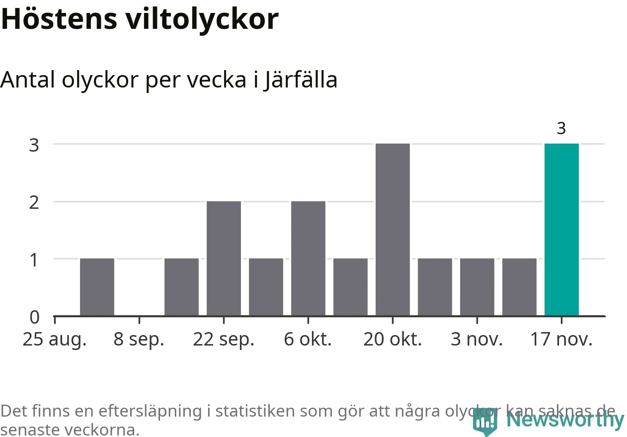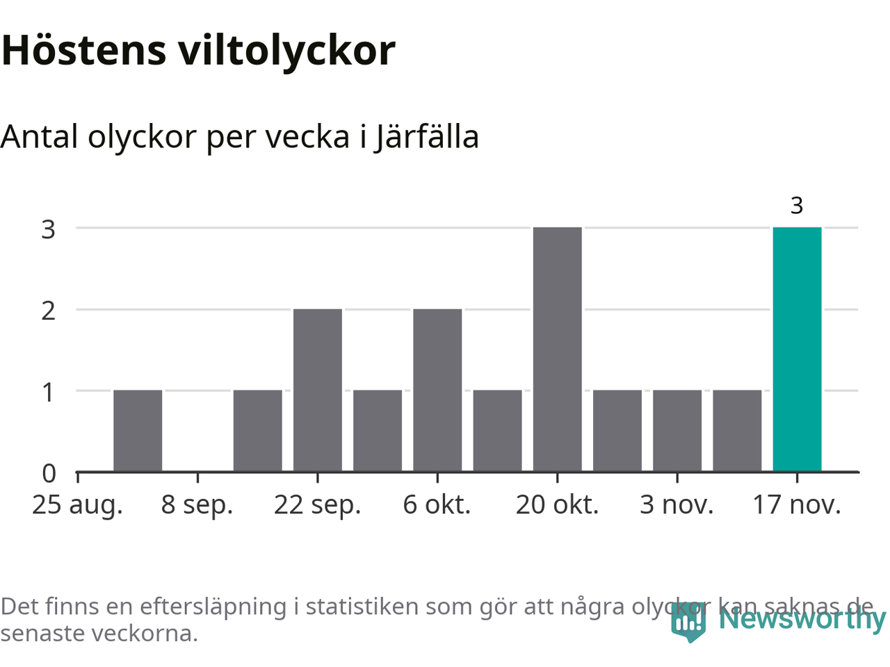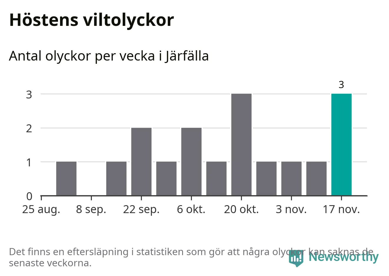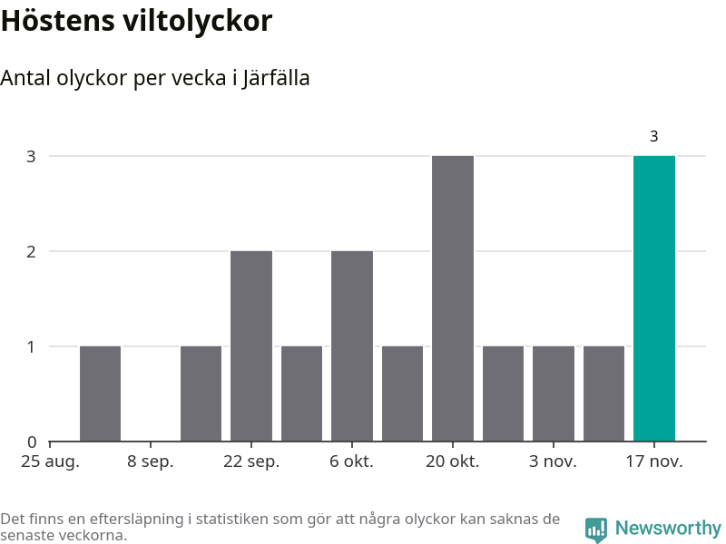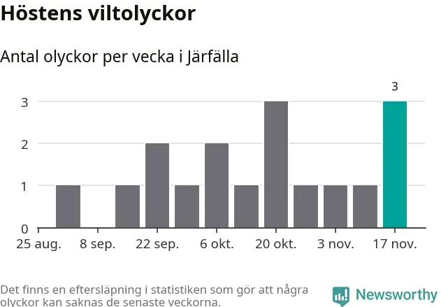 Hittills har tre viltolyckor rapporterats in i Järfälla kommun från vecka 47. Se listan här.