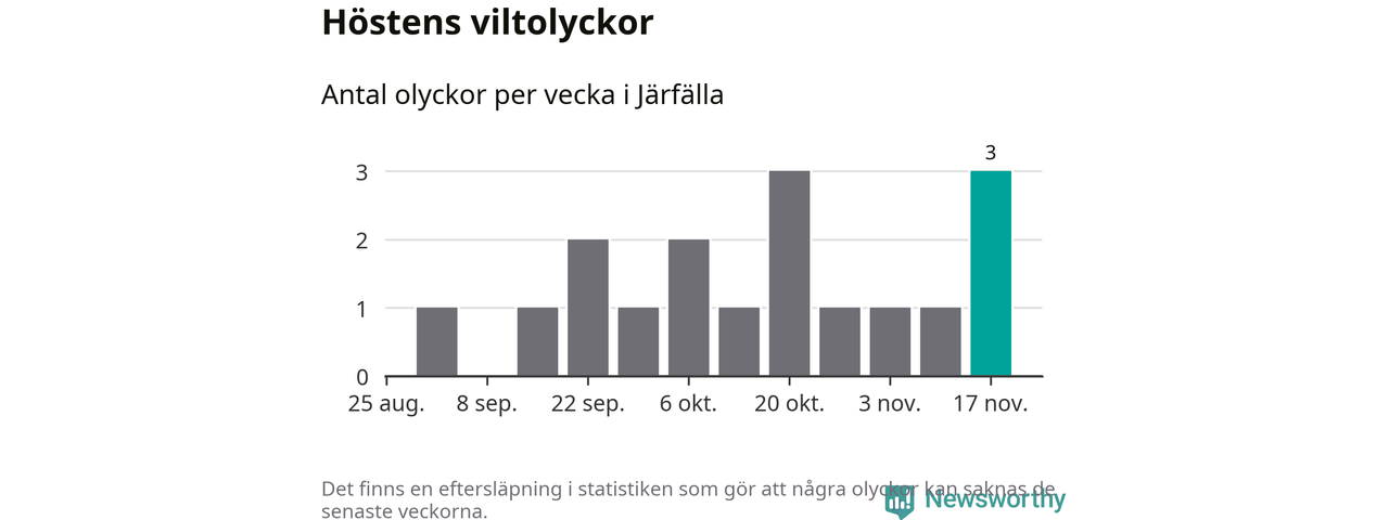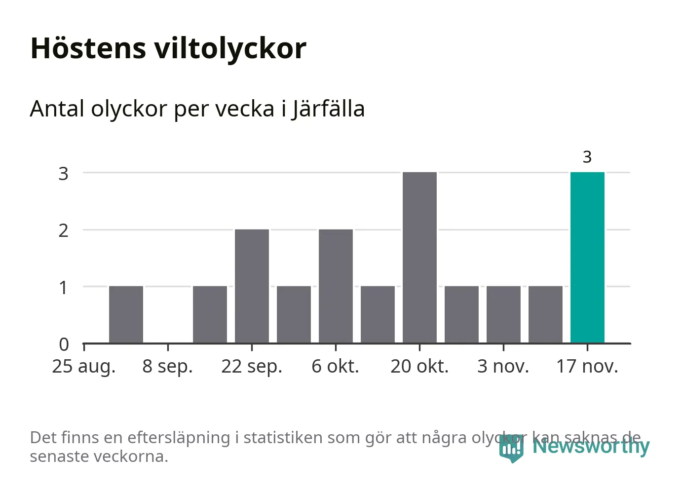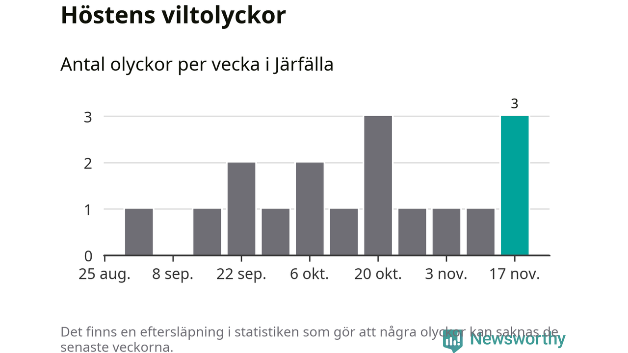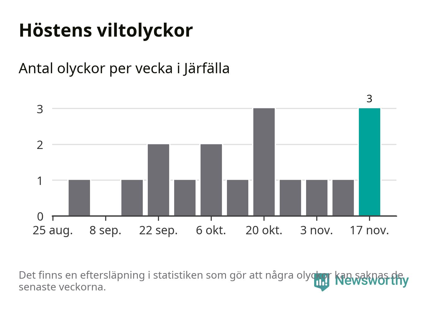 Hittills har tre viltolyckor rapporterats in i Järfälla kommun från vecka 47. Se listan här.
