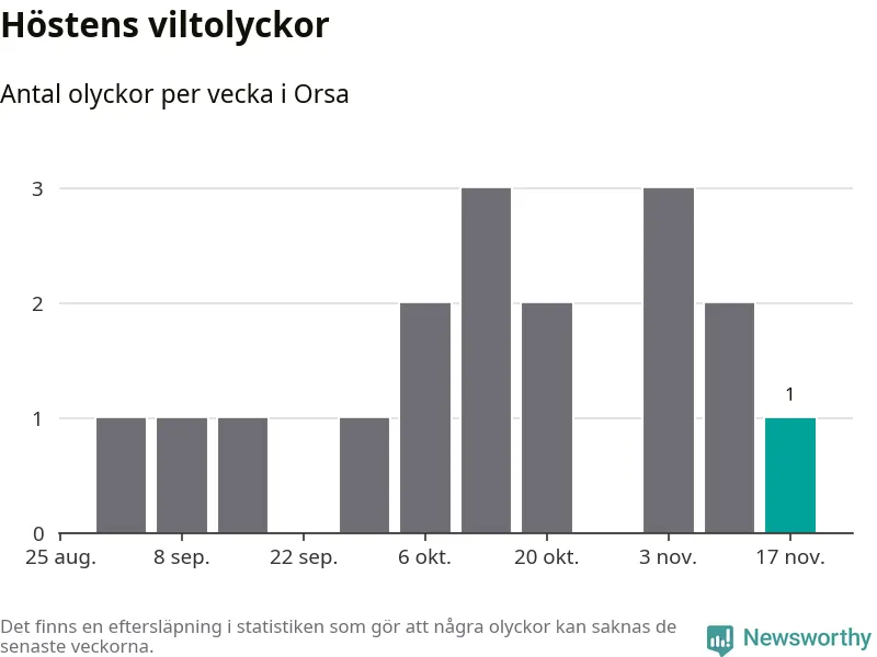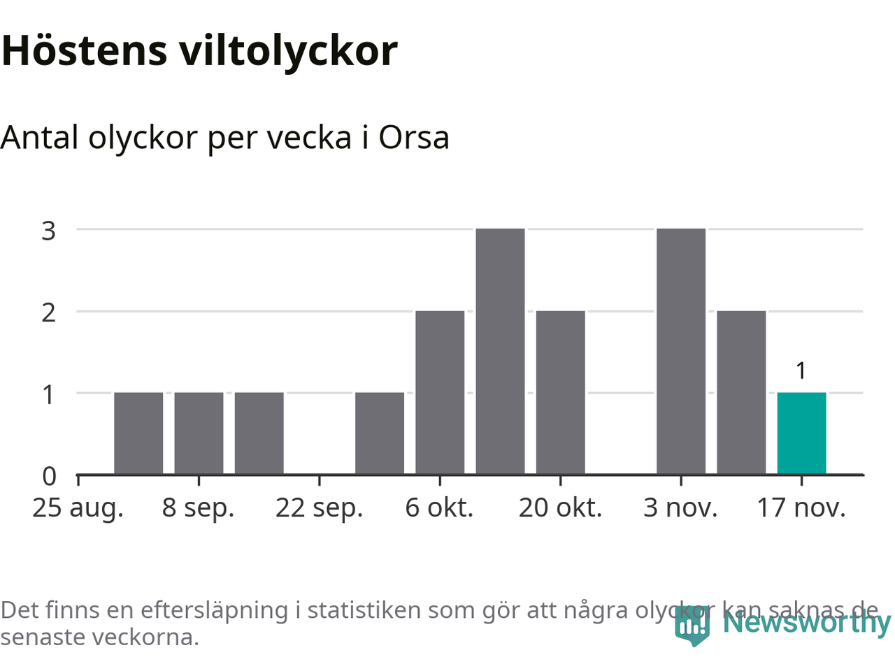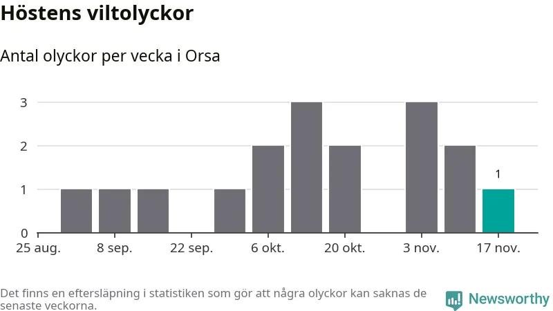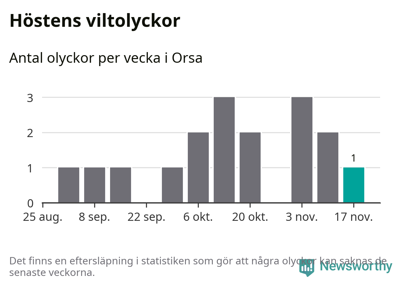 Från förra veckan (vecka 47) har hittills en viltolycka rapporterats in i Orsa kommun.