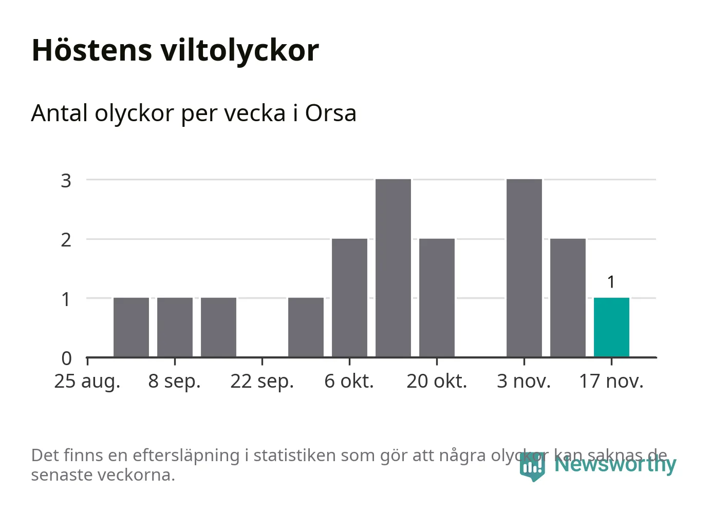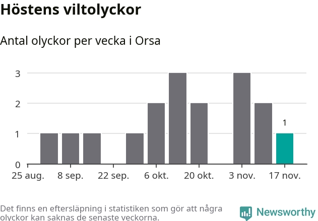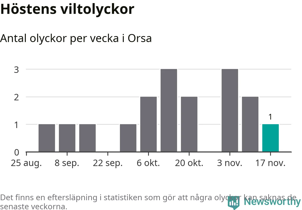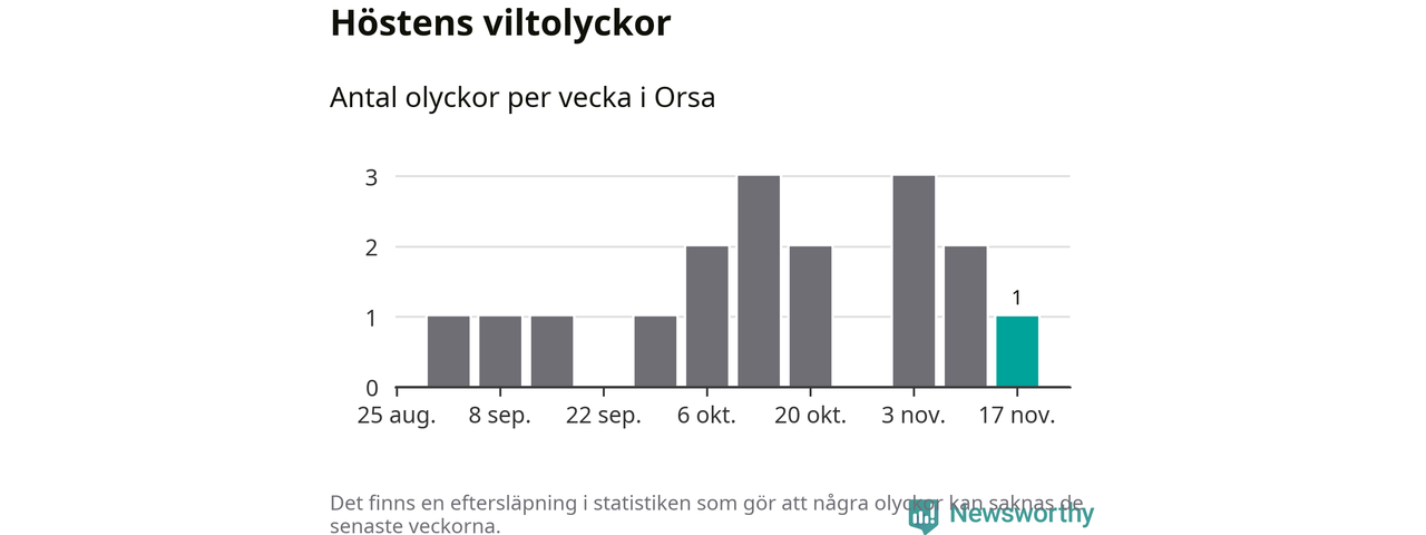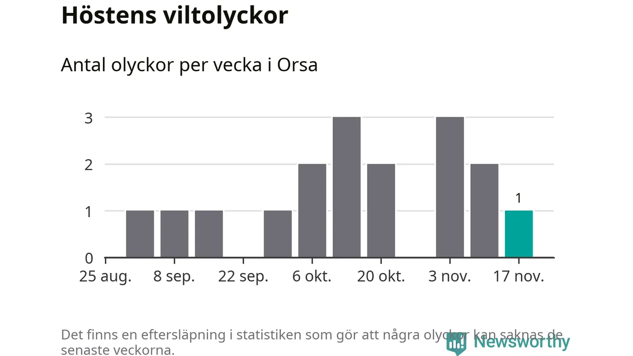 Från förra veckan (vecka 47) har hittills en viltolycka rapporterats in i Orsa kommun.