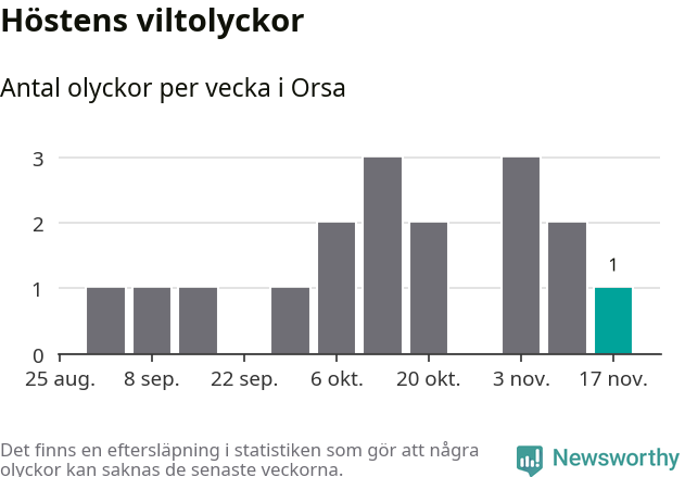Totalt den här hösten har det inträffat 17 viltolyckor i kommunen. Det är mindre än genomsnittet för motsvarande period (omkring 26) de senaste tio åren.