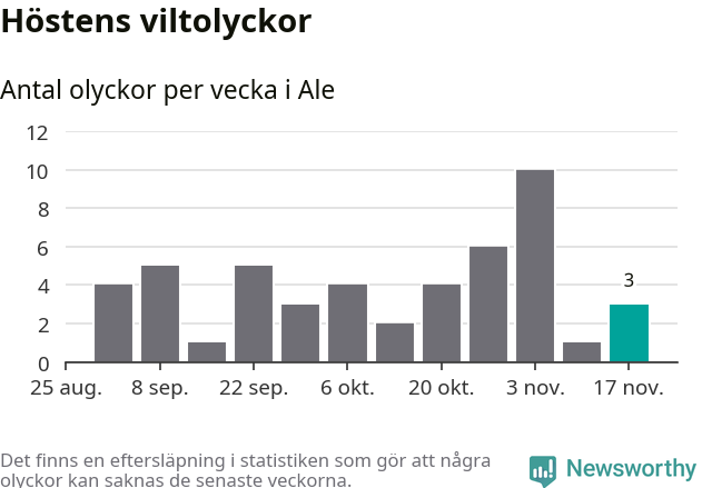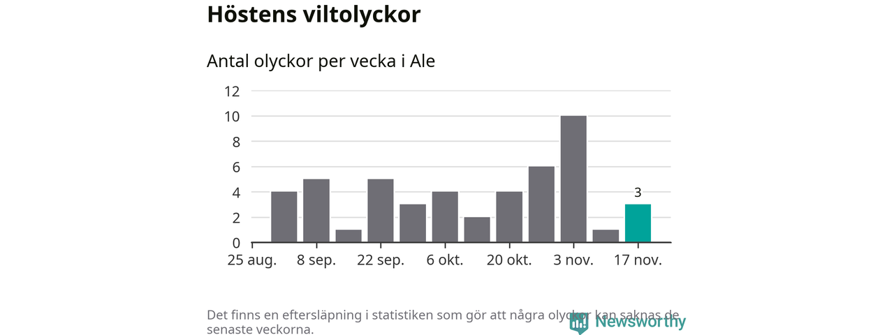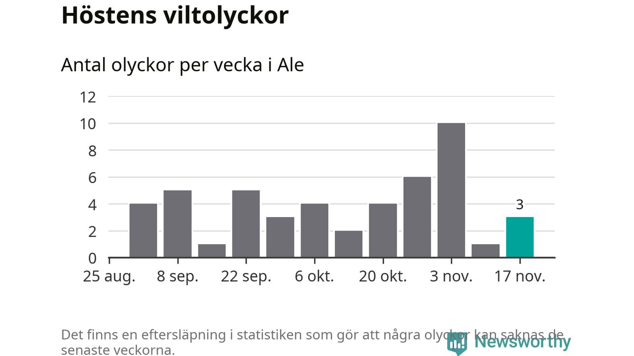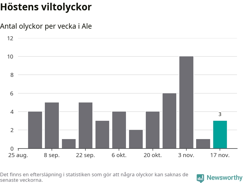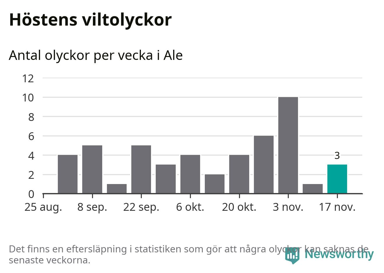 Hittills har tre viltolyckor rapporterats in i Ale kommun från vecka 47. Se listan här.