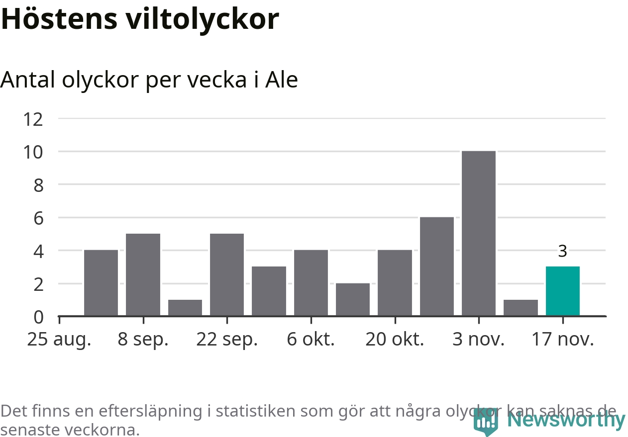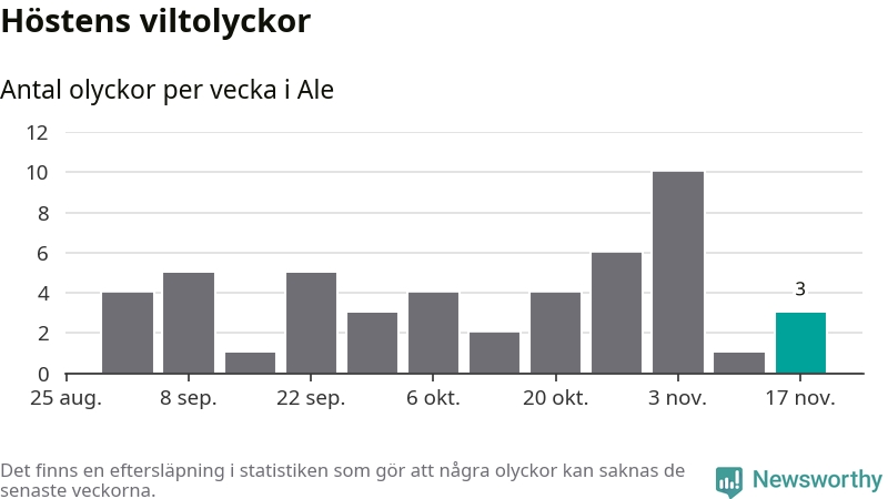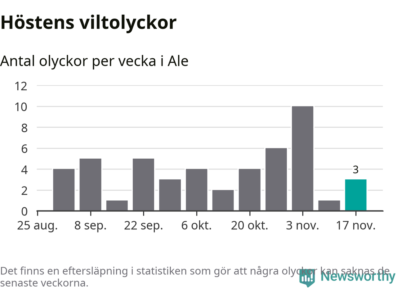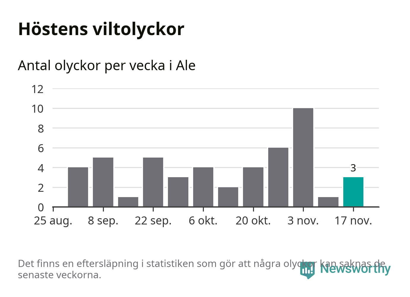 Hittills har tre viltolyckor rapporterats in i Ale kommun från vecka 47. Se listan här.