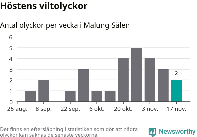 Totalt den här hösten har det inträffat 27 viltolyckor i kommunen. Det är mindre än genomsnittet för motsvarande period (omkring 40) de senaste tio åren.