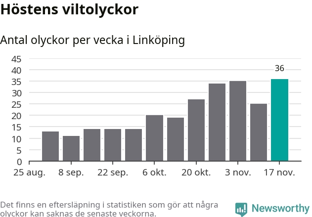 Under vecka 47 rapporterades 36 viltolyckor in i Linköpings kommun. Det är det största antalet på en vecka den här hösten.