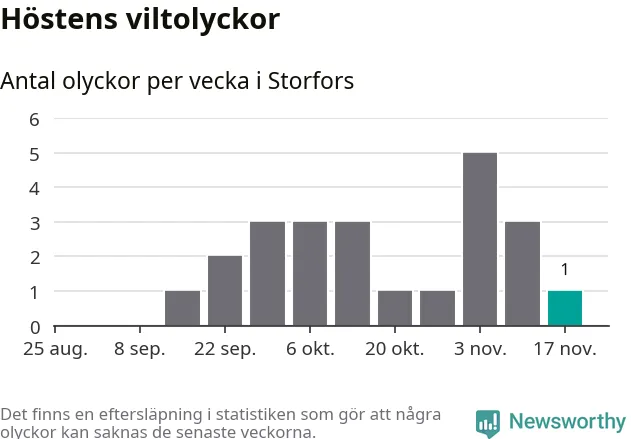 Från förra veckan (vecka 47) har hittills en viltolycka rapporterats in i Storfors kommun.