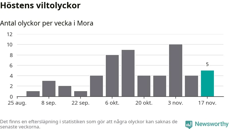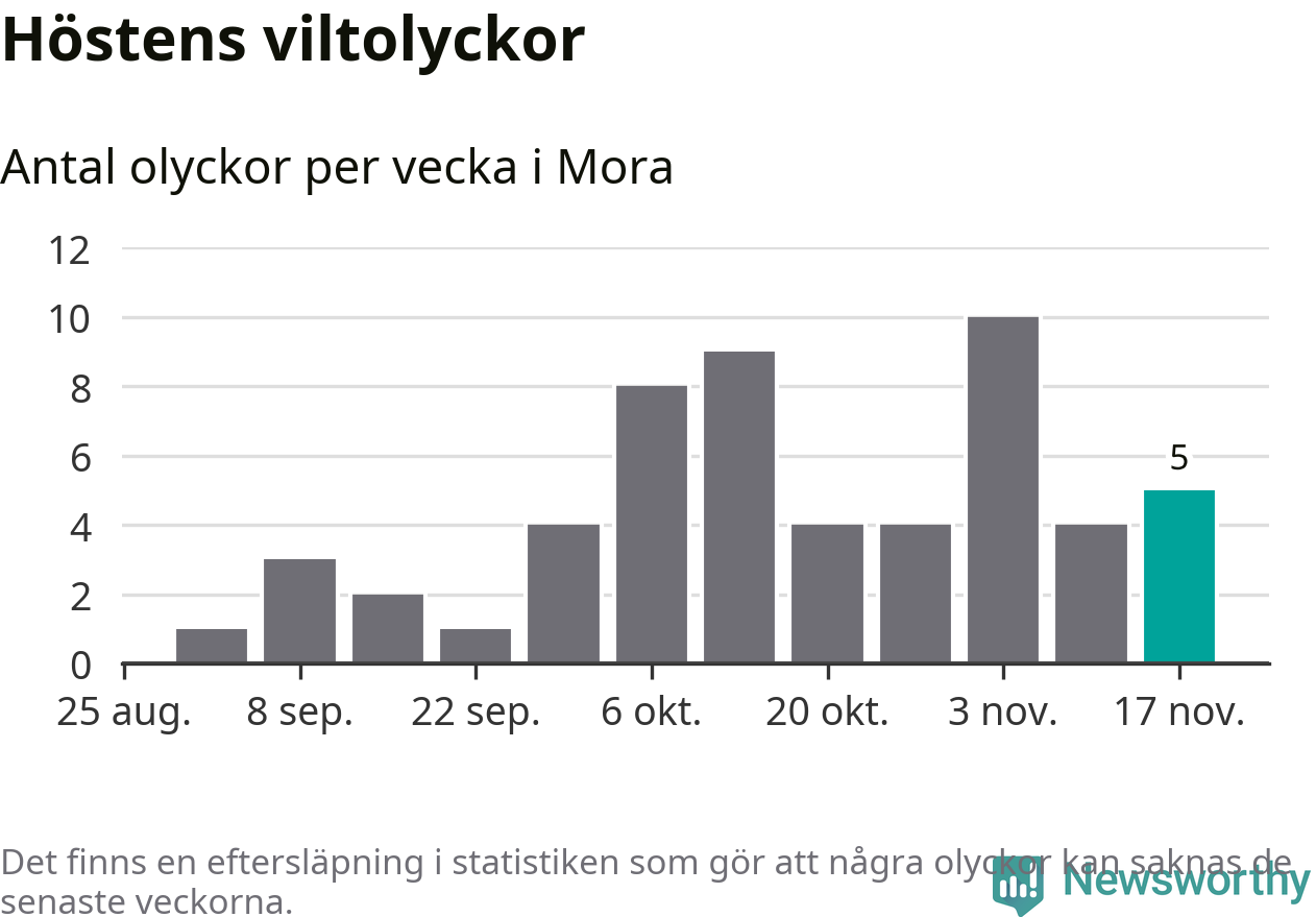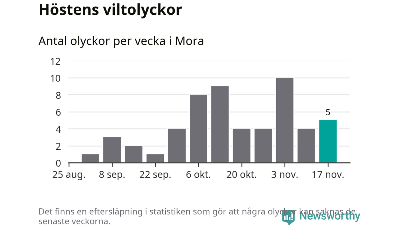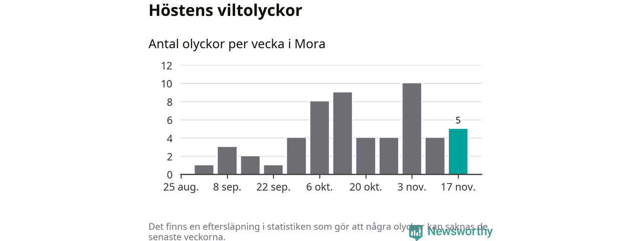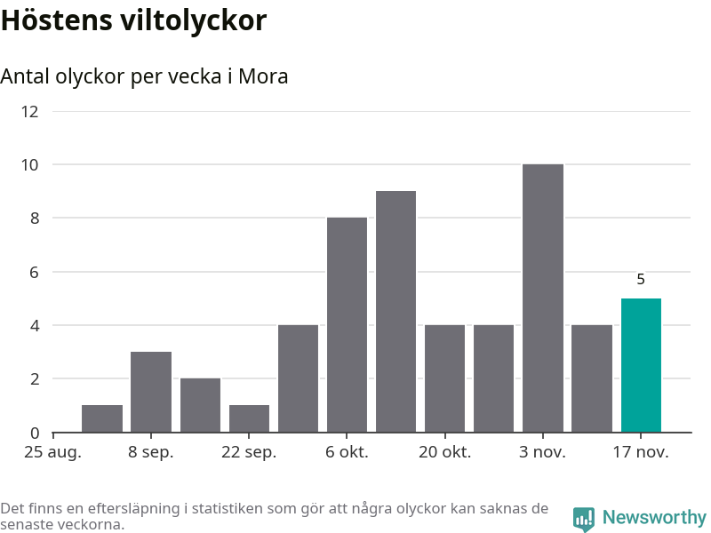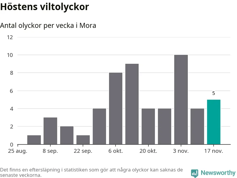 Hittills har fem viltolyckor rapporterats in i Mora kommun från vecka 47. Se listan här.