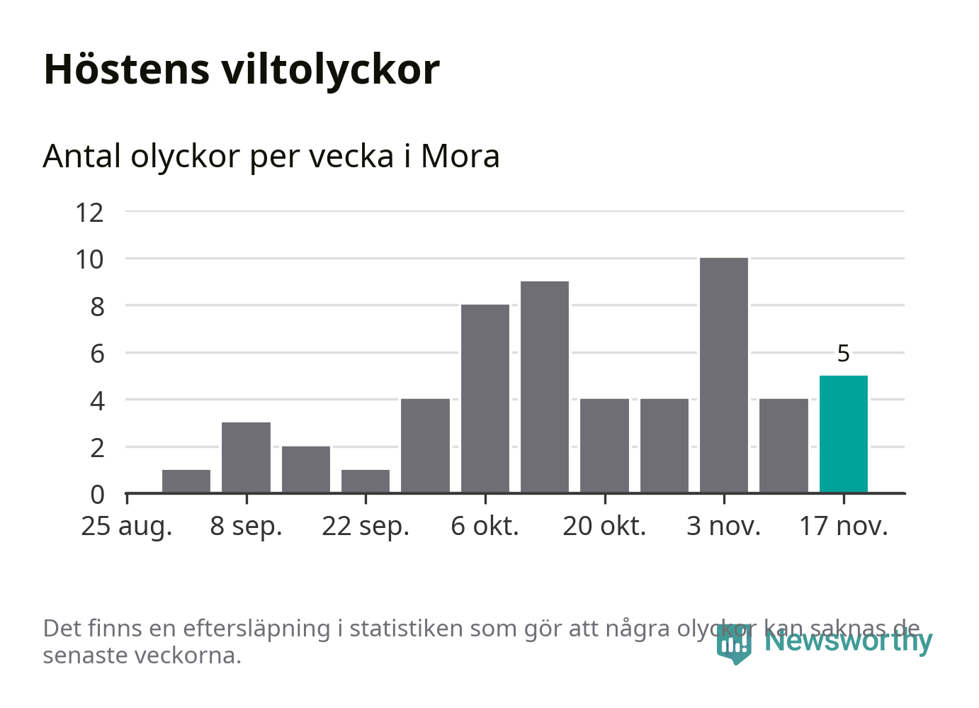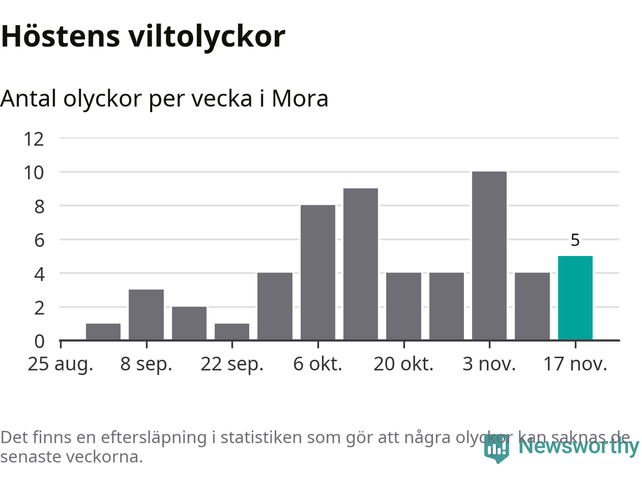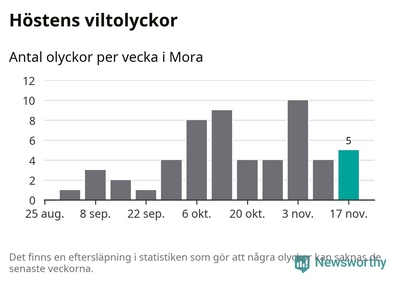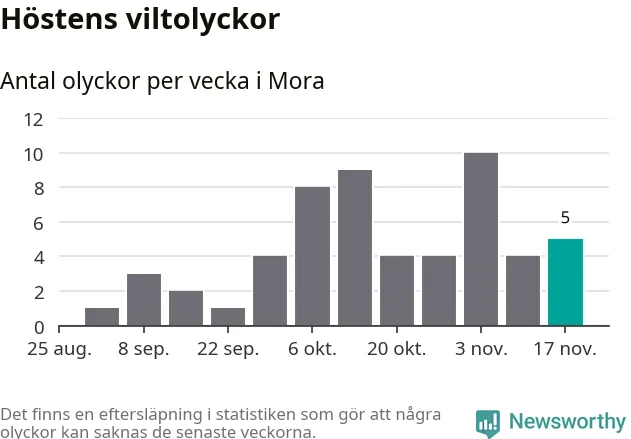 Hittills har fem viltolyckor rapporterats in i Mora kommun från vecka 47. Se listan här.
