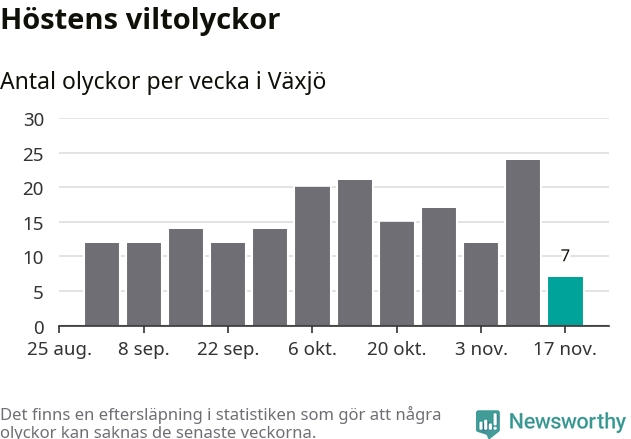 Hittills har sju viltolyckor rapporterats in i Växjö kommun från vecka 47. Se listan här.