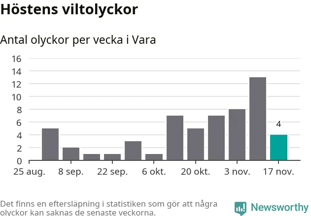 Hittills har fyra viltolyckor rapporterats in i Vara kommun från vecka 47. Se listan här.