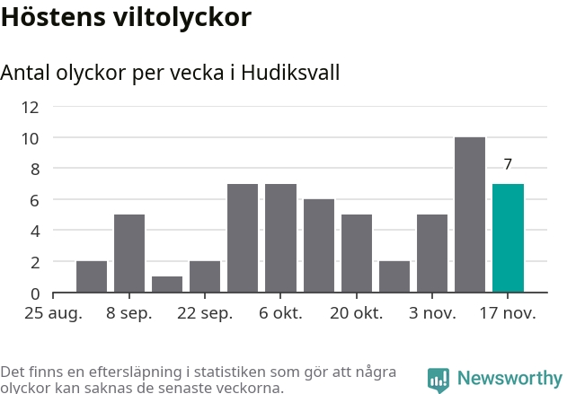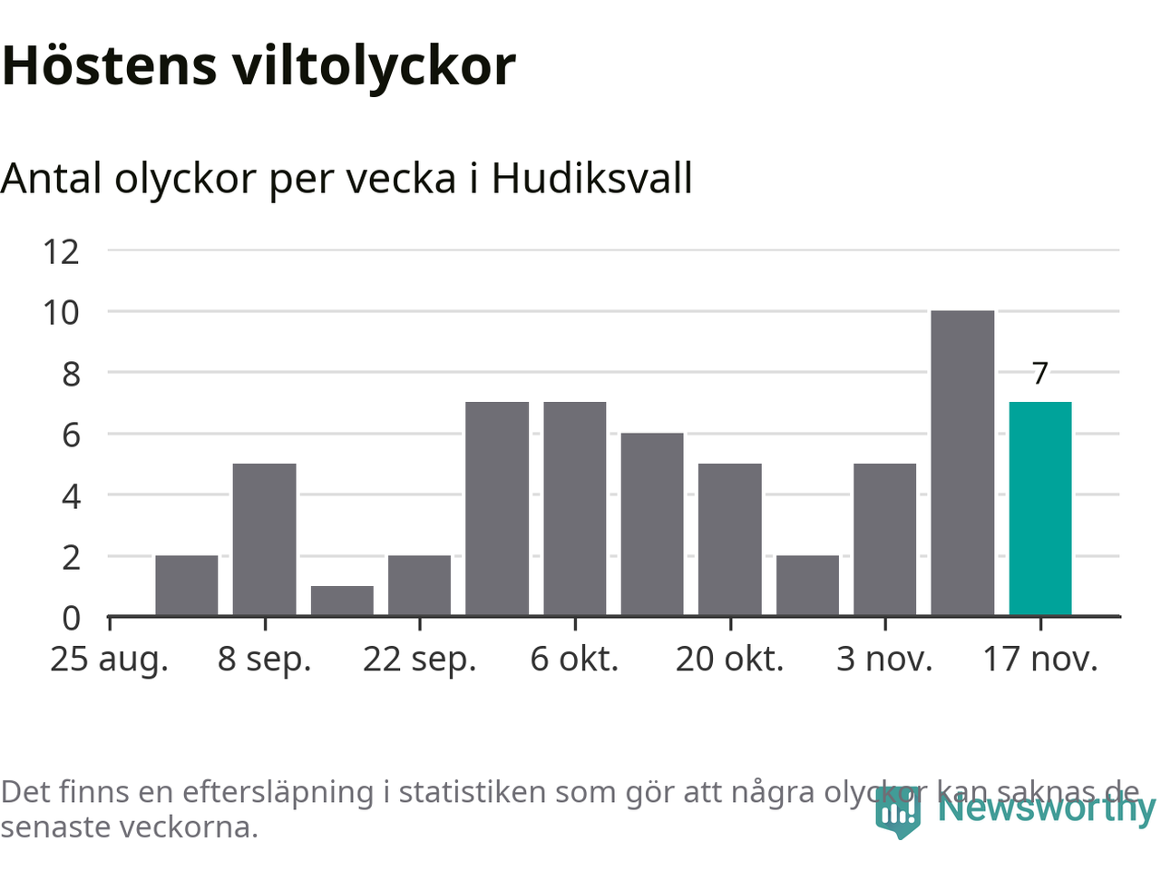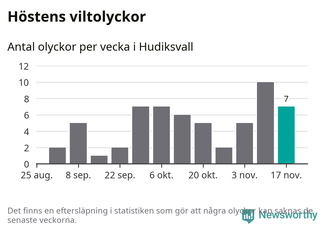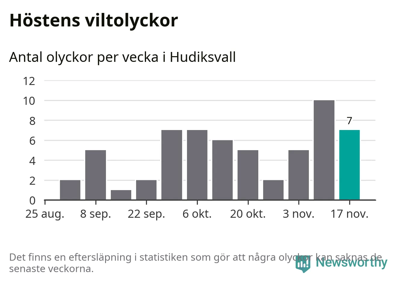 Hittills har sju viltolyckor rapporterats in i Hudiksvalls kommun från vecka 47. Se listan här.