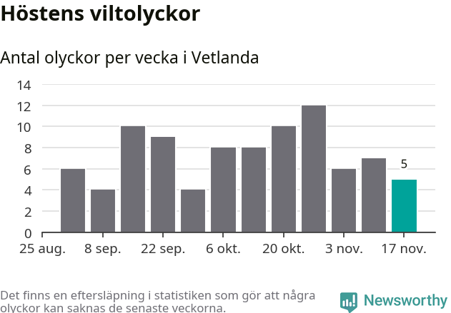 Hittills har fem viltolyckor rapporterats in i Vetlanda kommun från vecka 47. Se listan här.