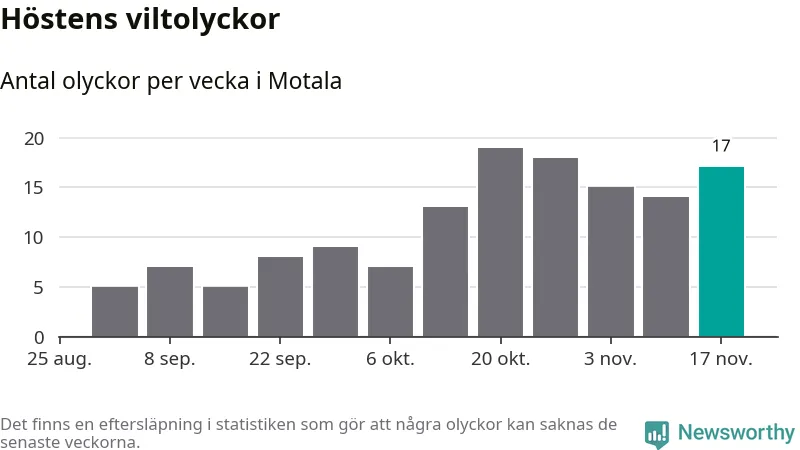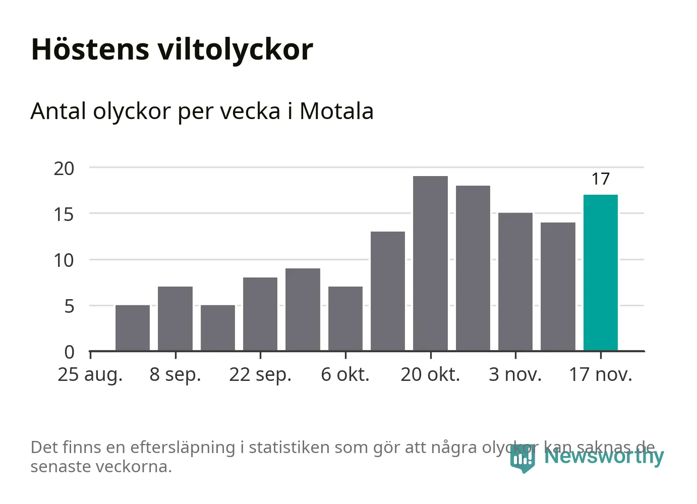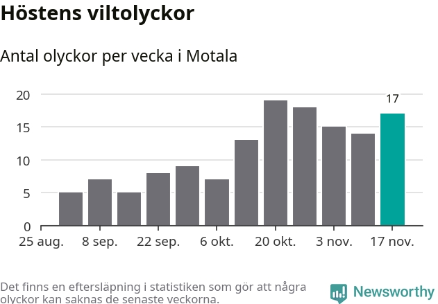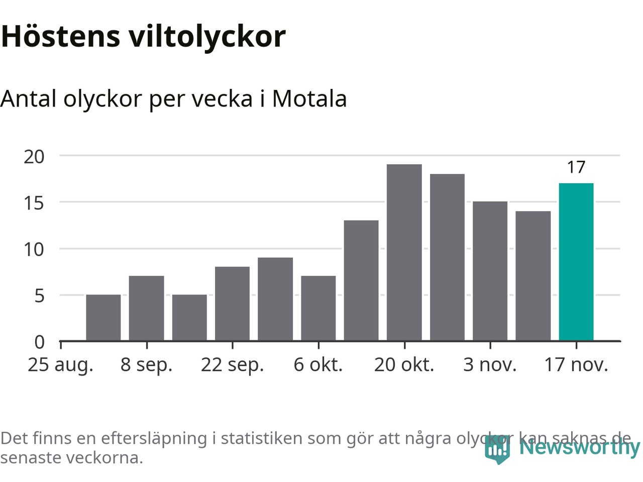 17 olyckor på en enda vecka är också ovanligt många. Bara sju gånger tidigare sedan 2015 har det skett så många viltolyckor på en vecka i Motala kommun, senast för fyra veckor sedan.