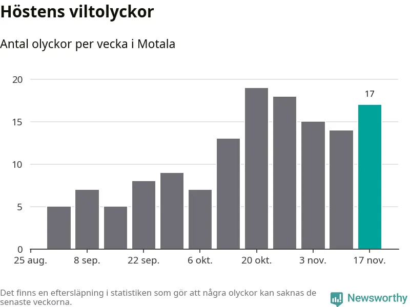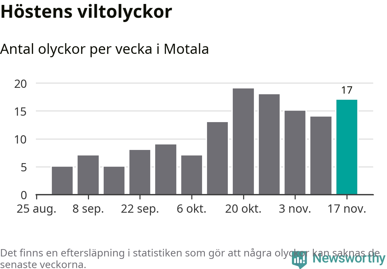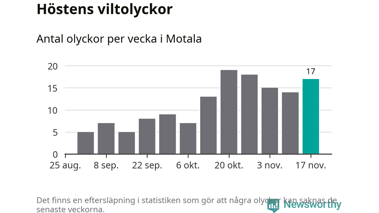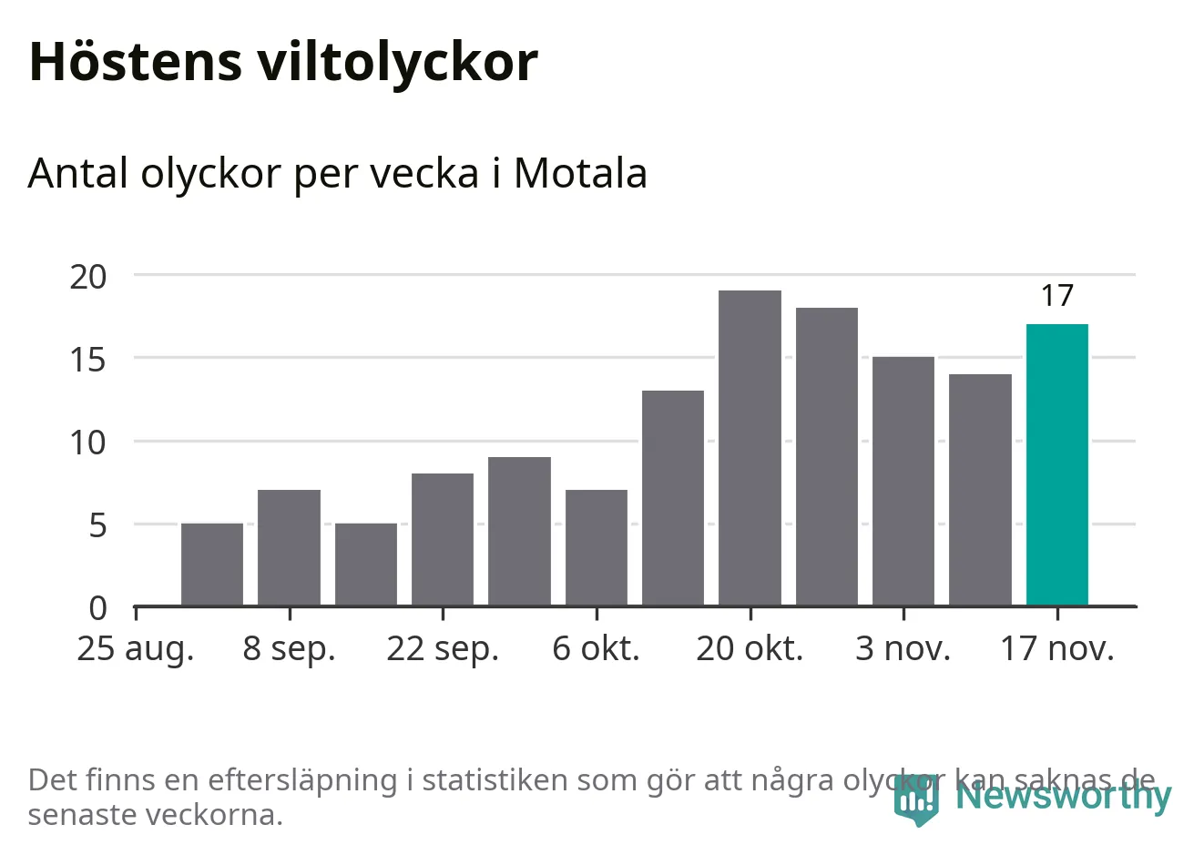 17 olyckor på en enda vecka är också ovanligt många. Bara sju gånger tidigare sedan 2015 har det skett så många viltolyckor på en vecka i Motala kommun, senast för fyra veckor sedan.