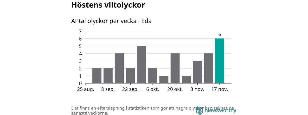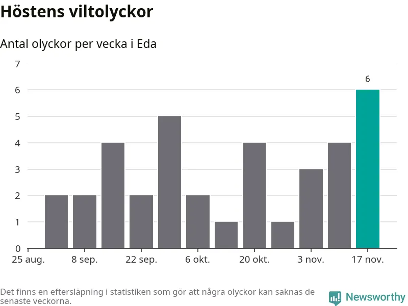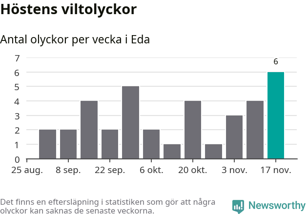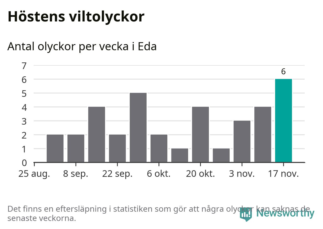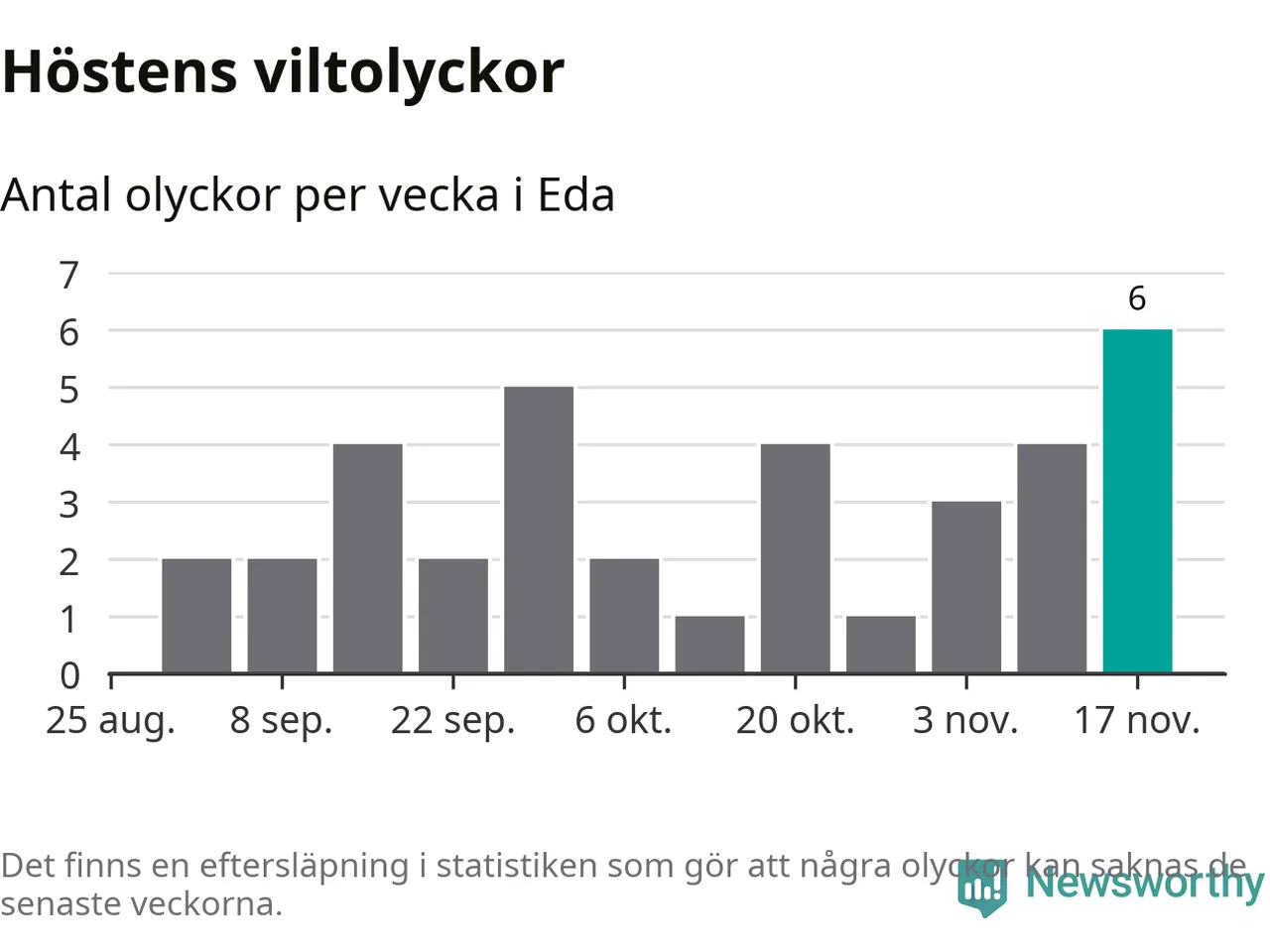Hittills har sex viltolyckor rapporterats in i Eda kommun från vecka 47. Se listan här.
