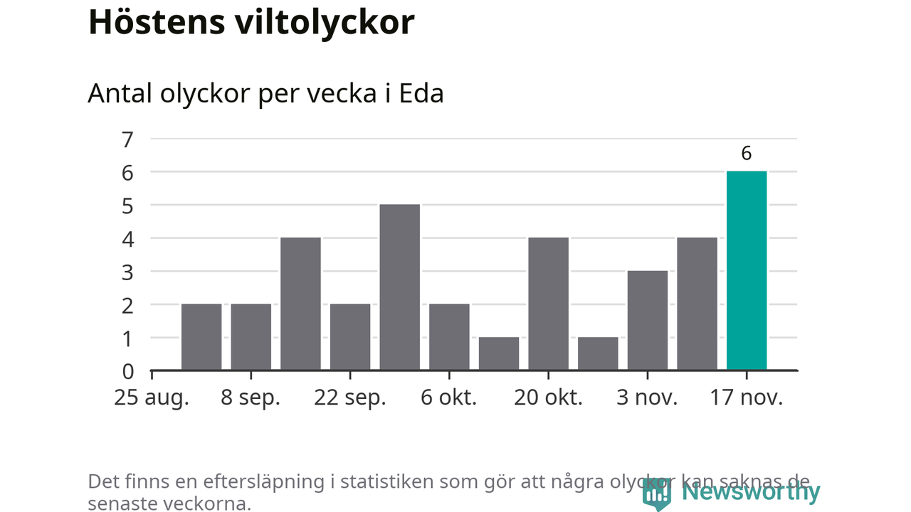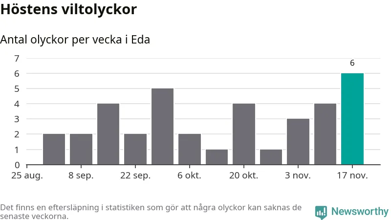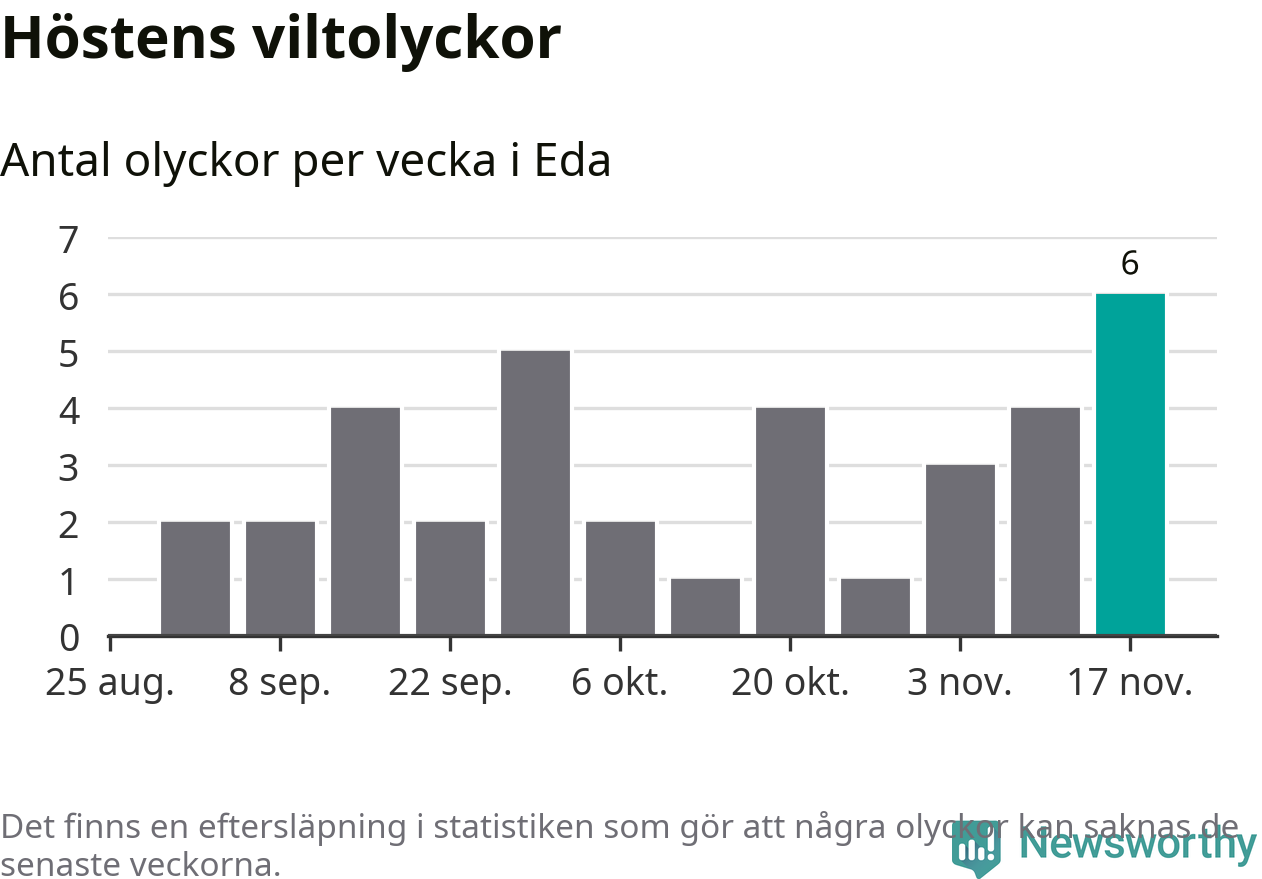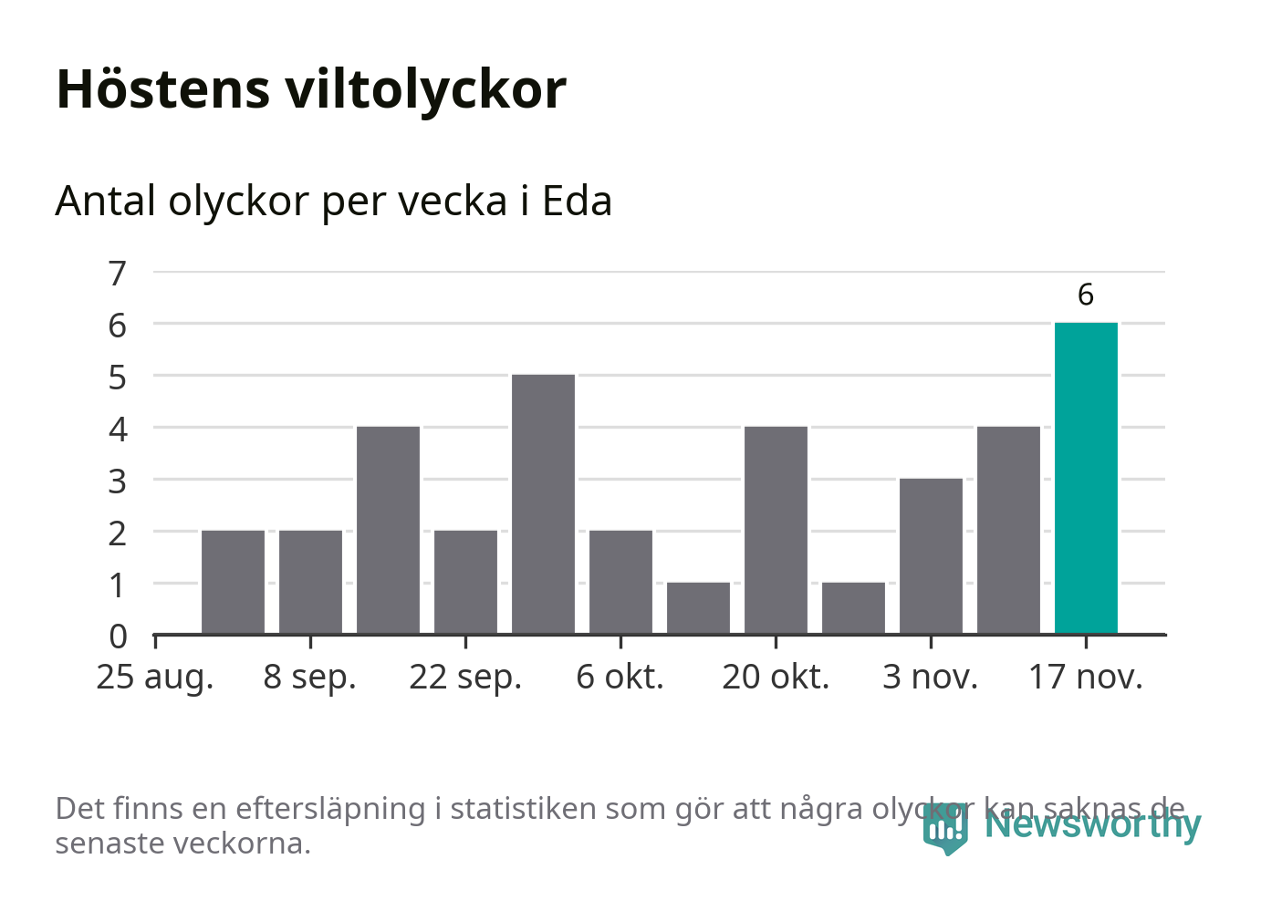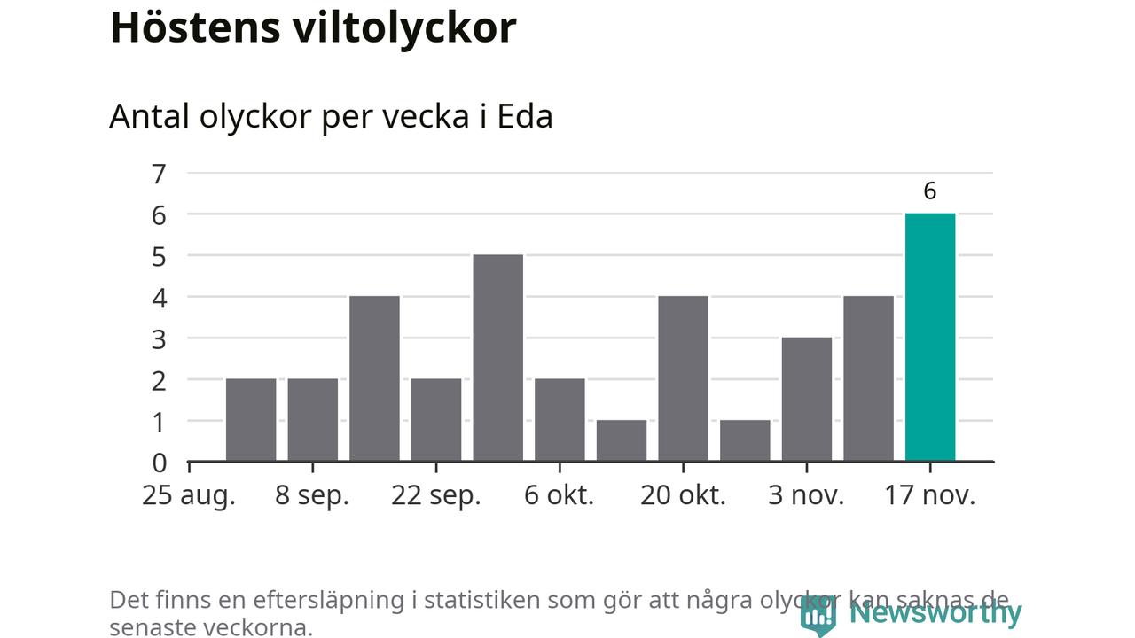 Hittills har sex viltolyckor rapporterats in i Eda kommun från vecka 47. Se listan här.