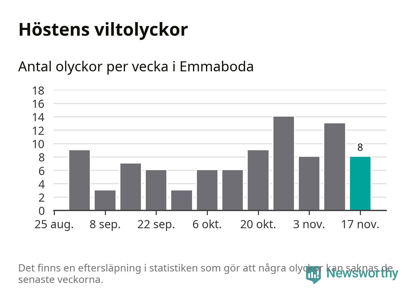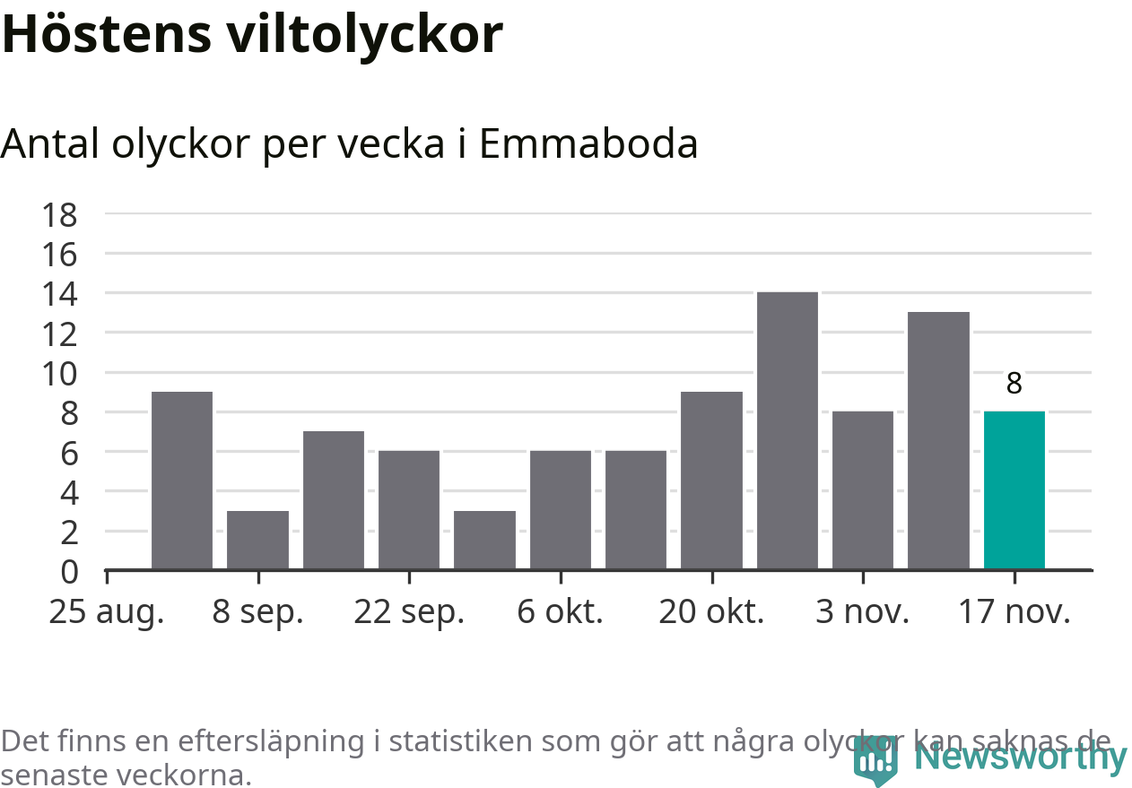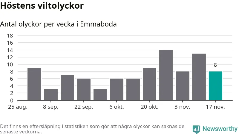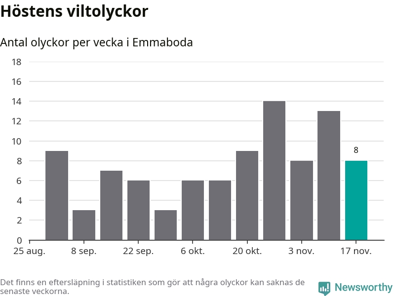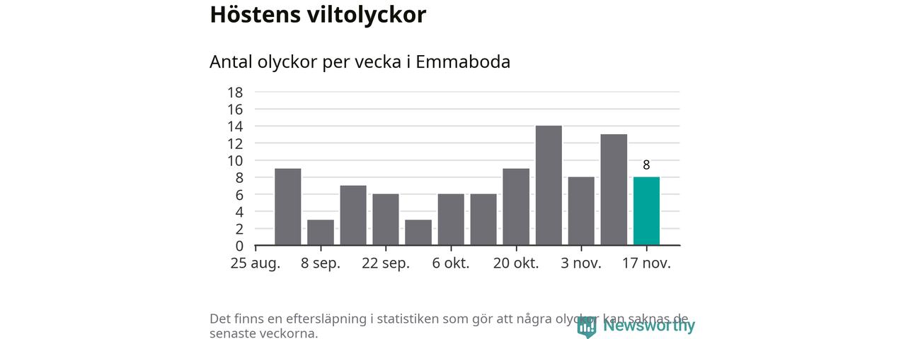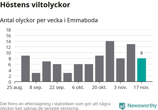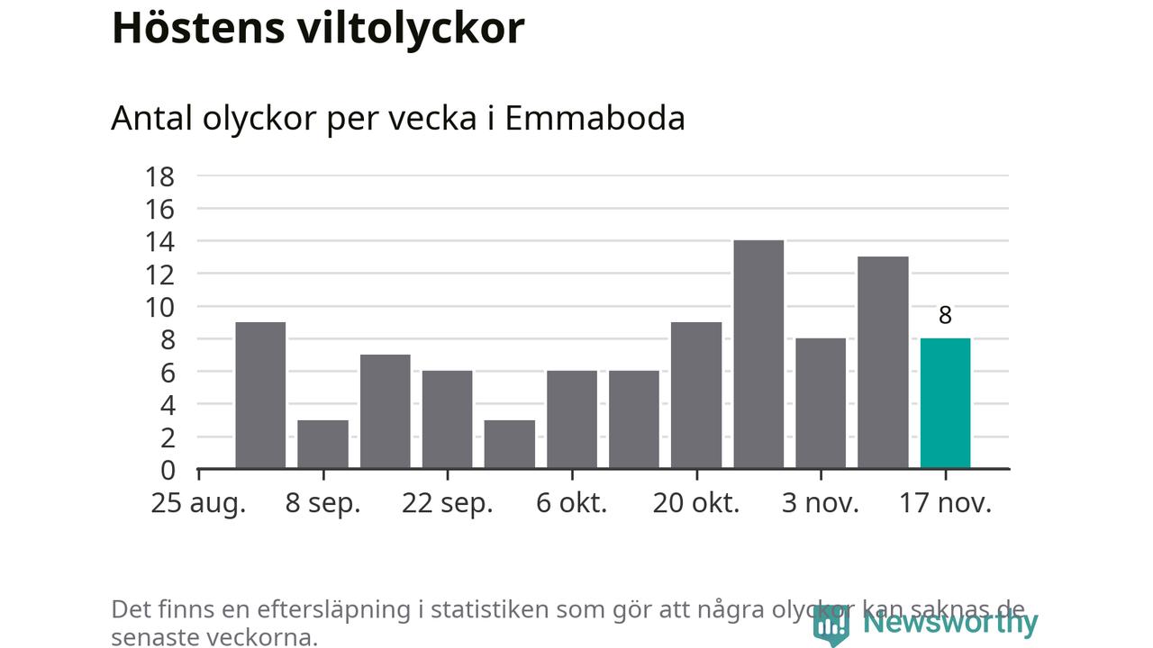 Hittills har åtta viltolyckor rapporterats in i Emmaboda kommun från vecka 47. Se listan här.
