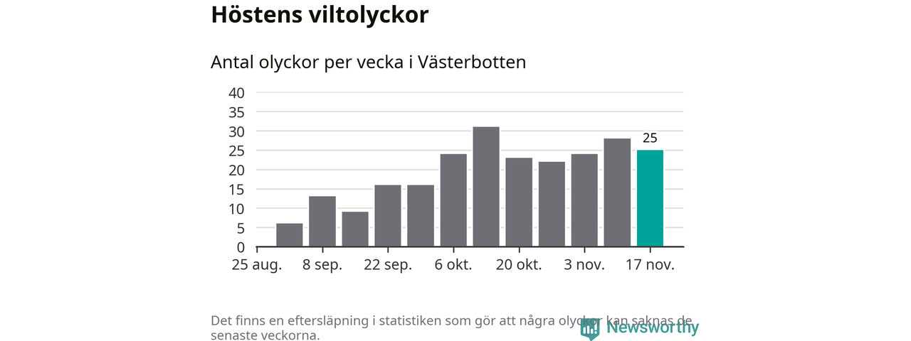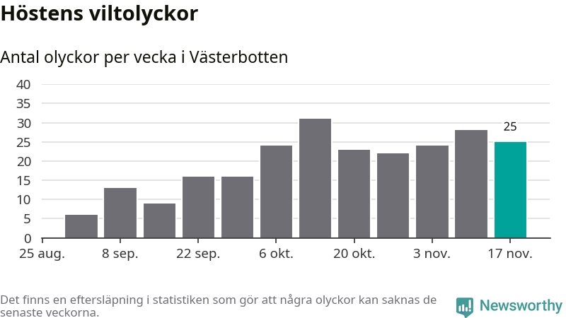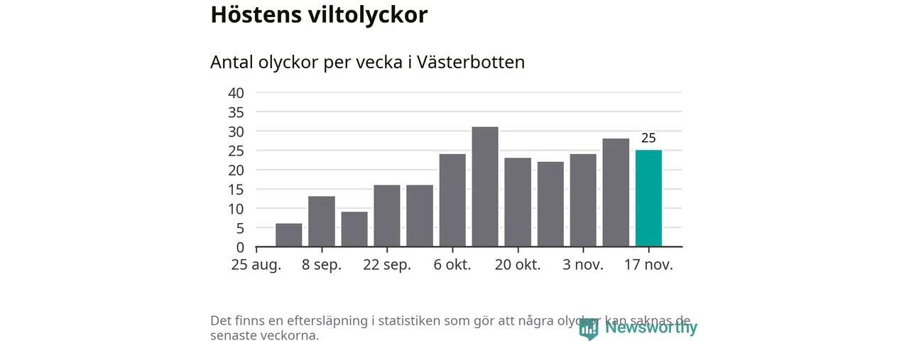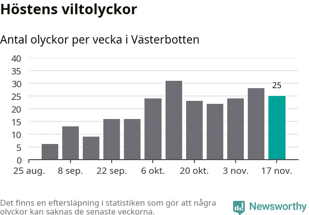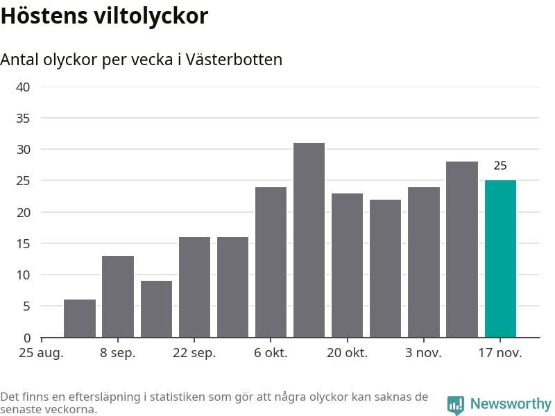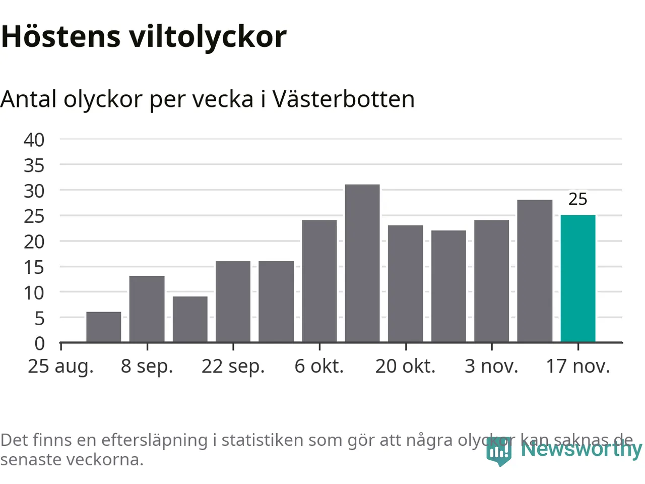 Hittills har 25 viltolyckor rapporterats in i Västerbottens län från vecka 47. Se listan här.