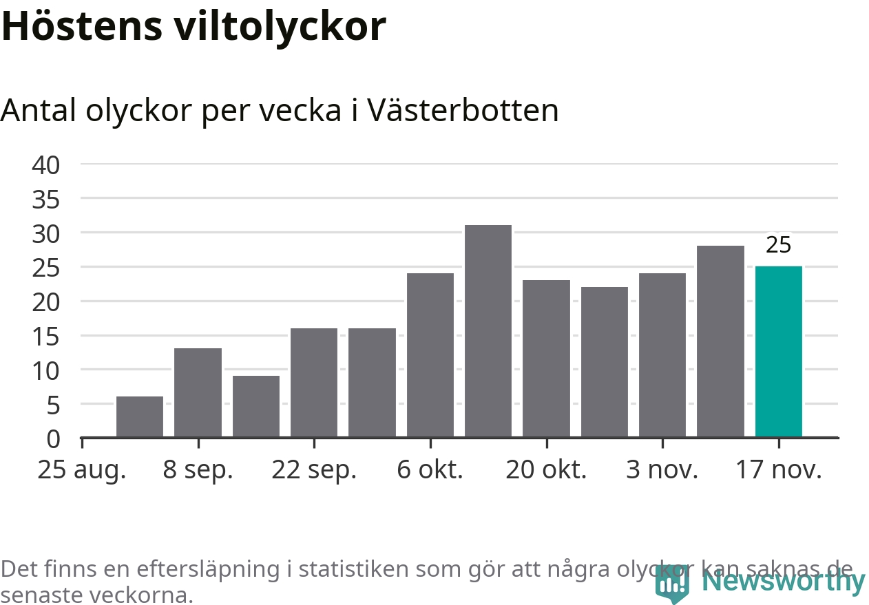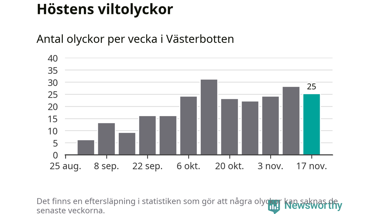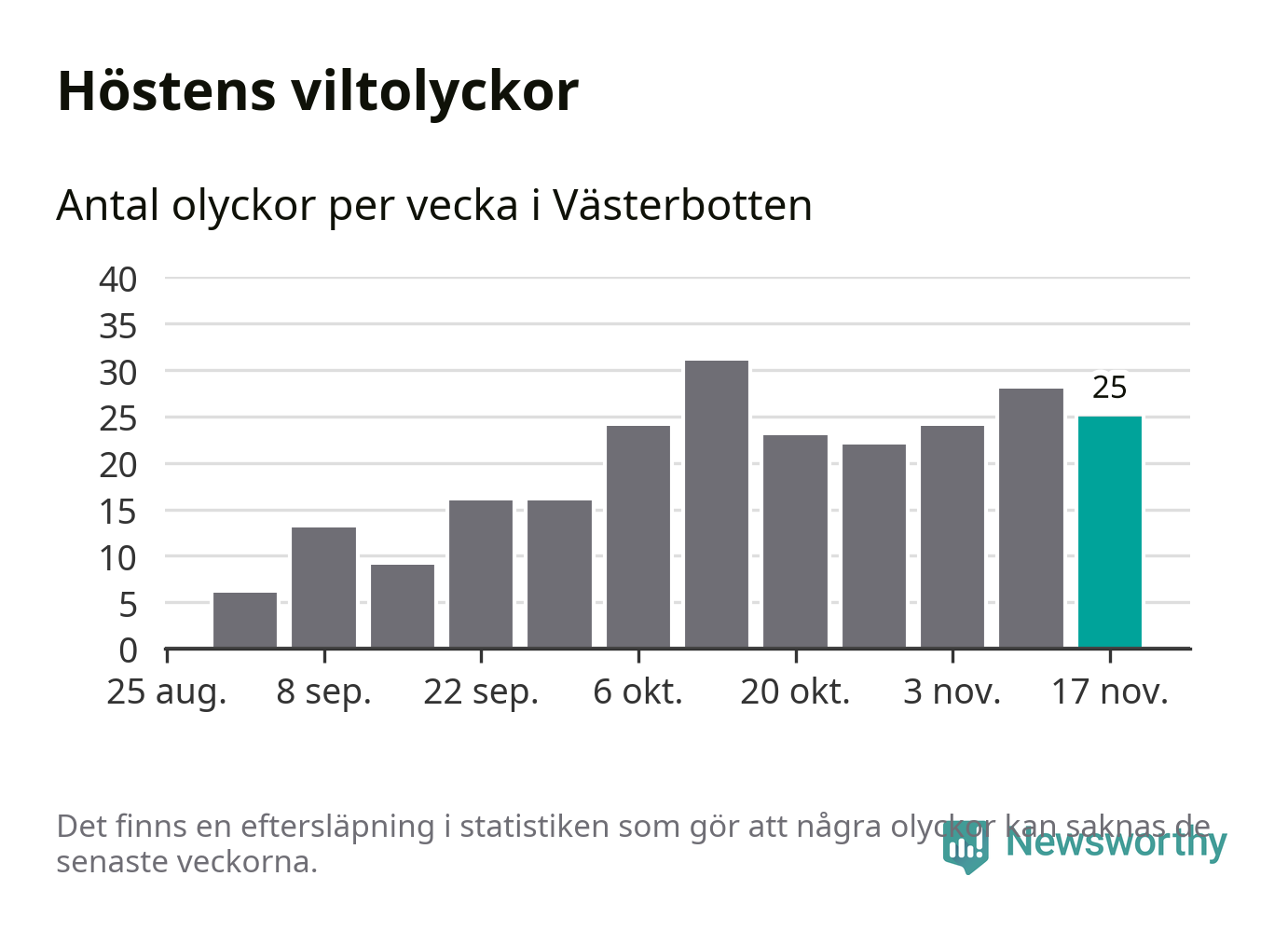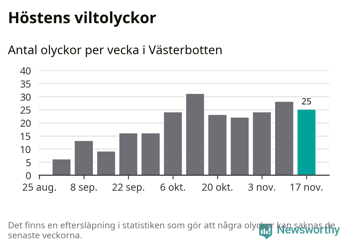 Hittills har 25 viltolyckor rapporterats in i Västerbottens län från vecka 47. Se listan här.