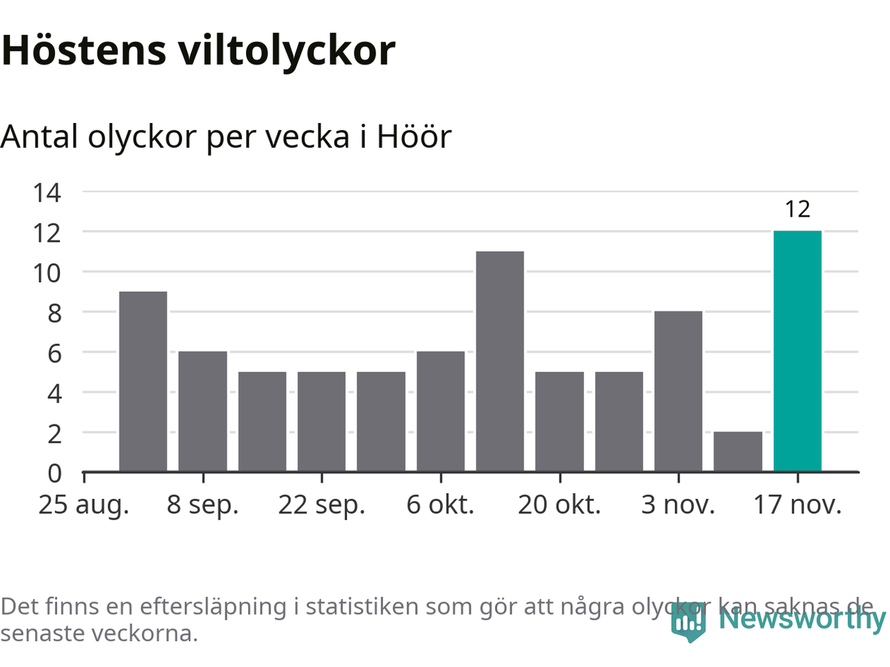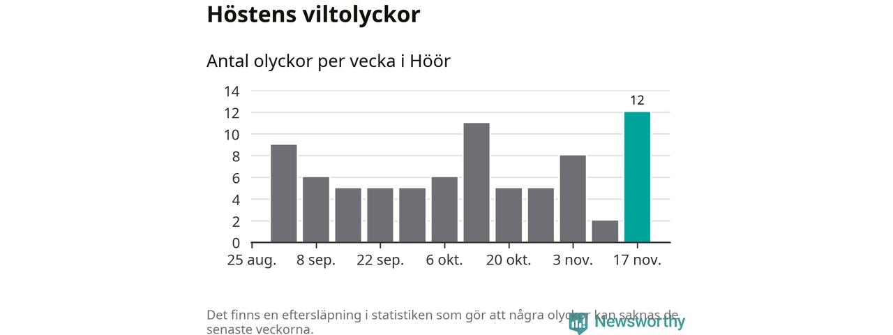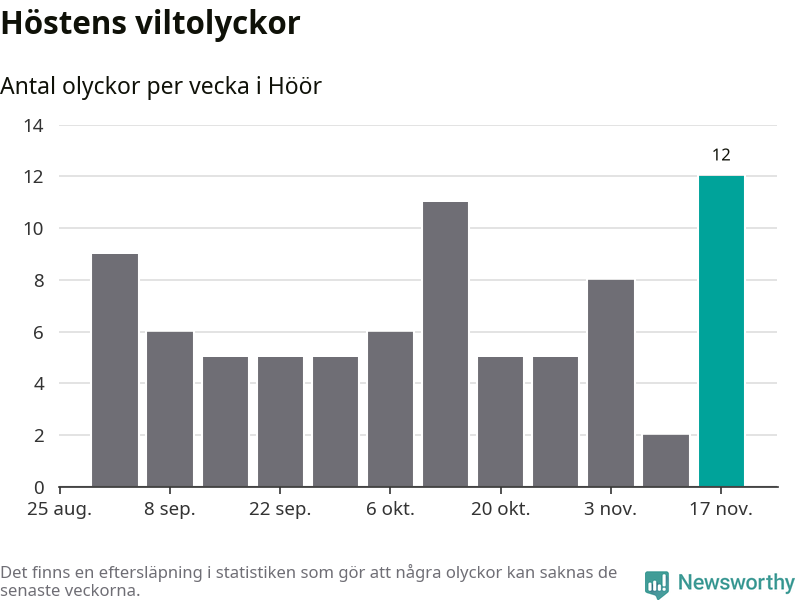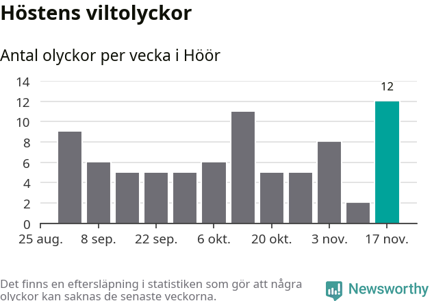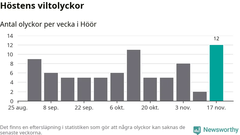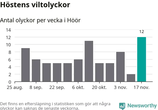 Hittills har tolv viltolyckor rapporterats in i Höörs kommun från vecka 47. Det är en av de högsta siffrorna för en enskild vecka på över tio år.