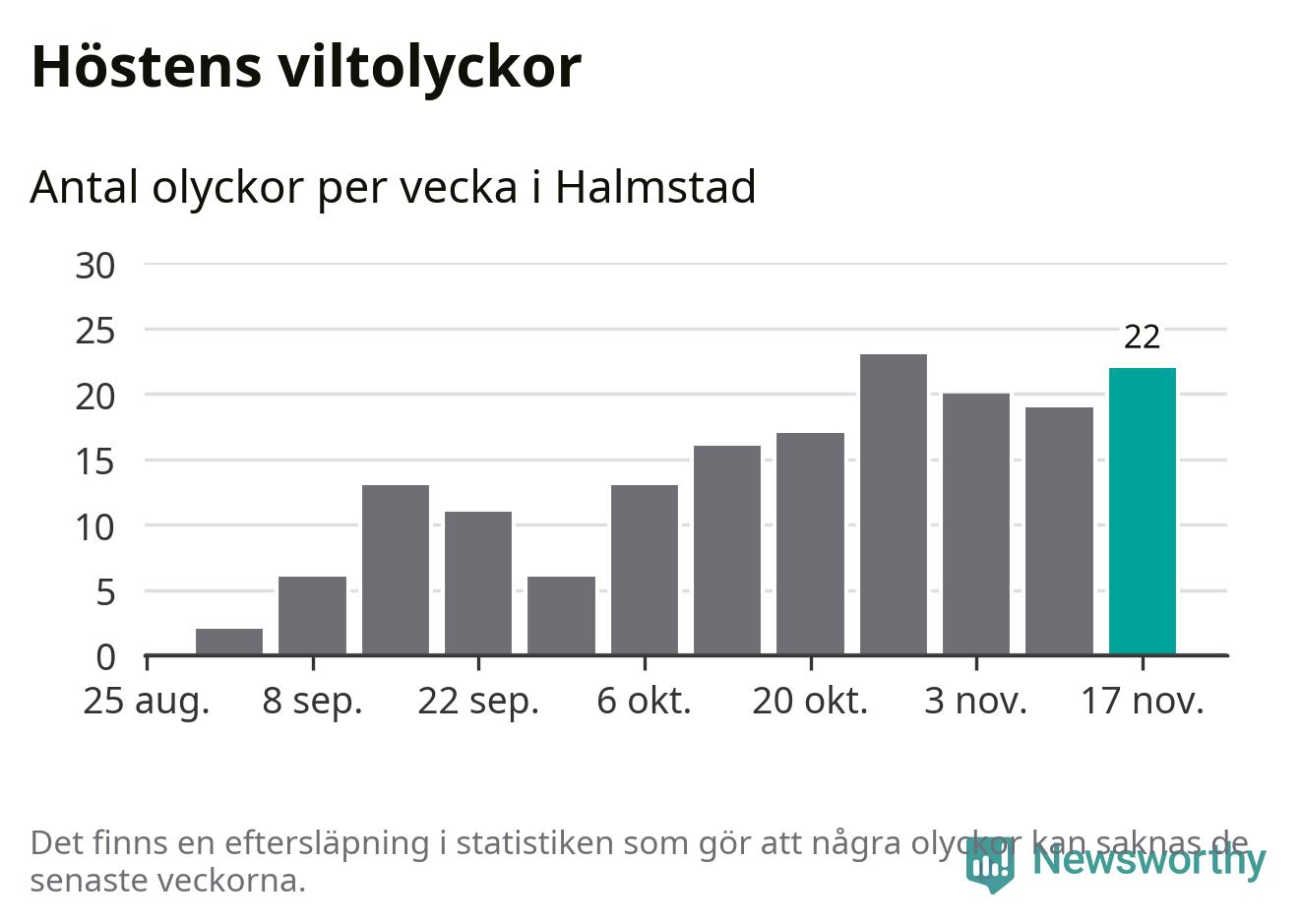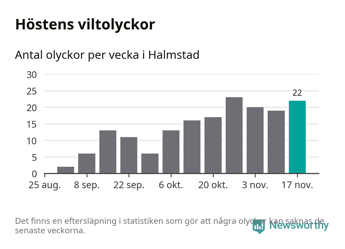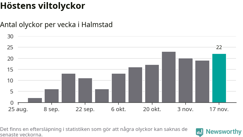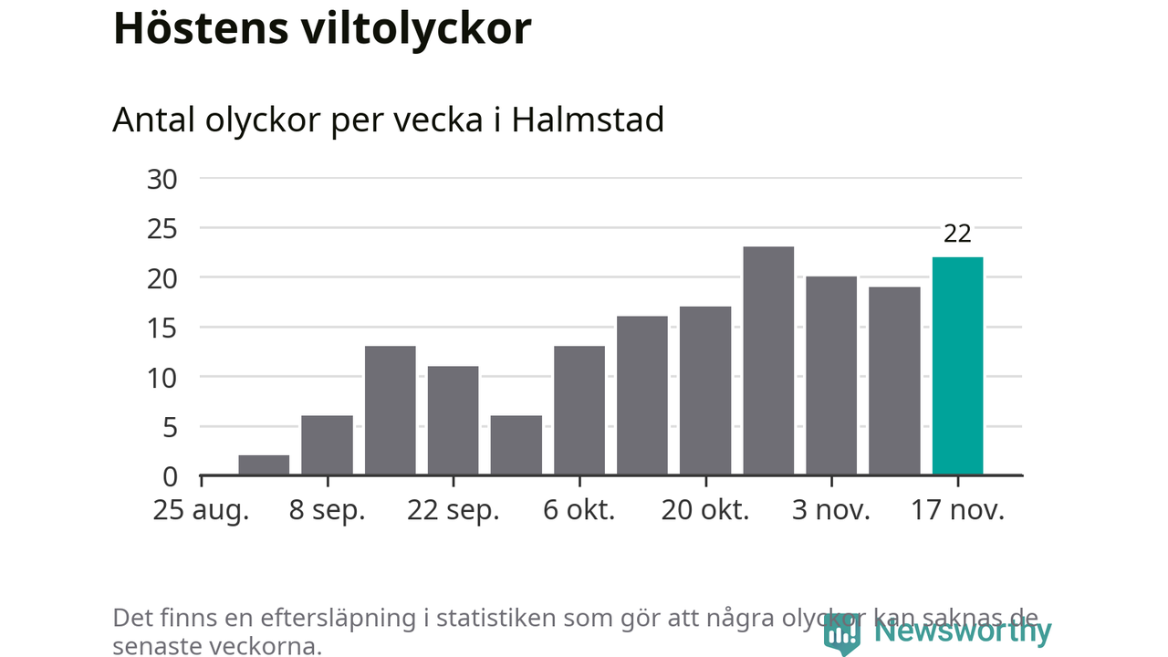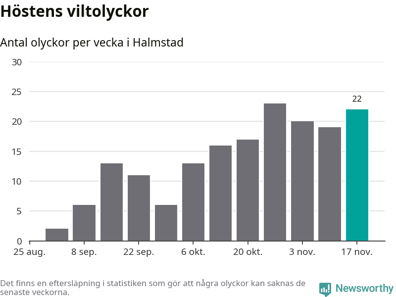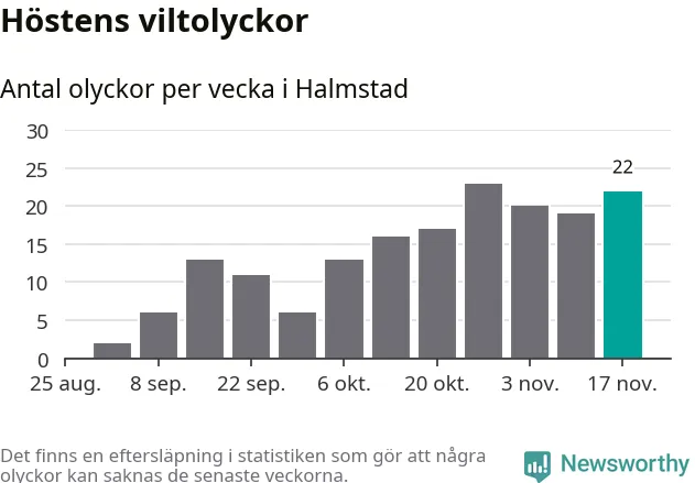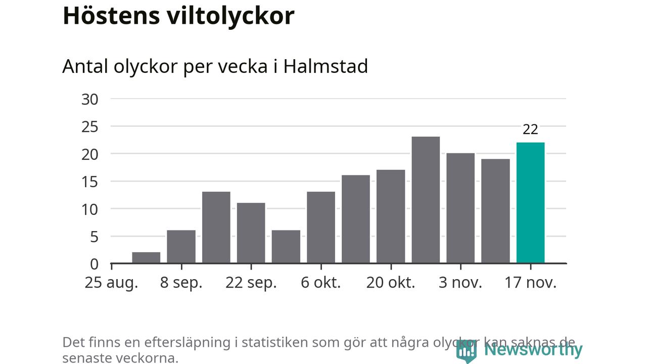 22 olyckor på en enda vecka är däremot ovanligt många. Bara fyra gånger tidigare sedan 2015 har det skett så många viltolyckor på en vecka i Halmstads kommun, senast för fyra veckor sedan.