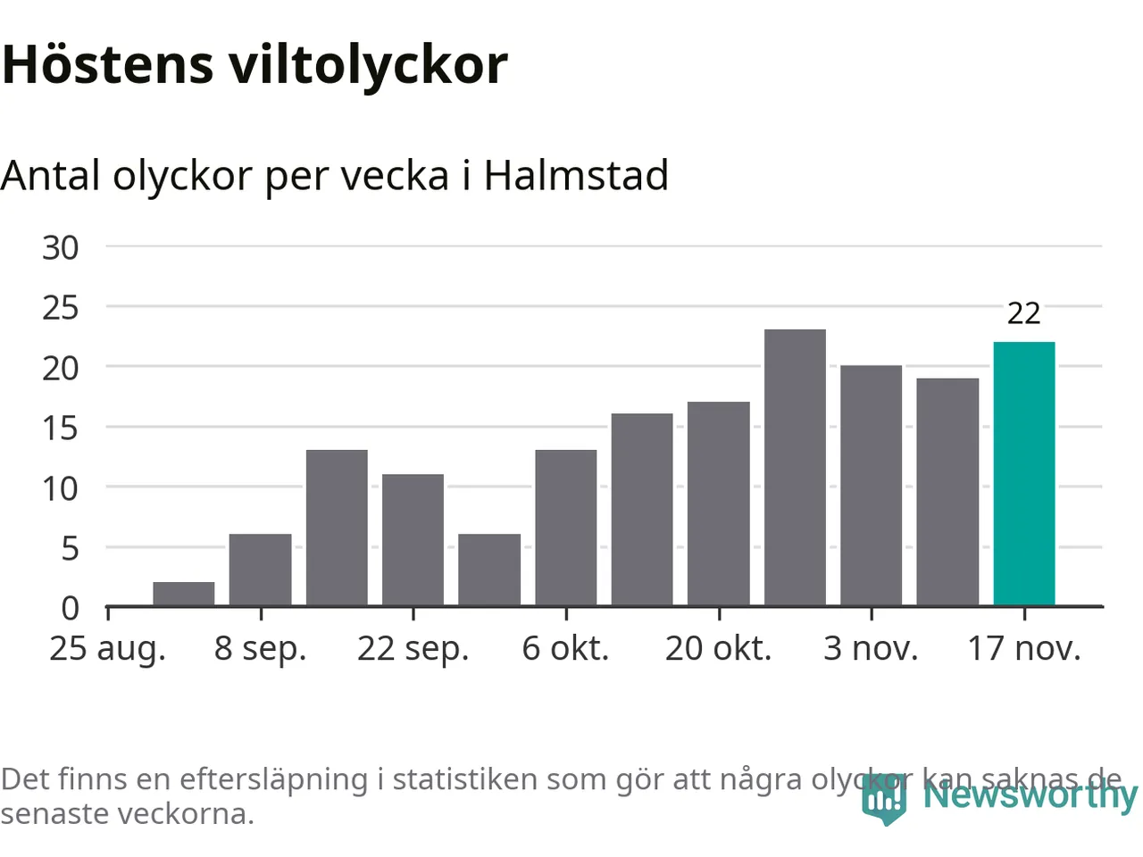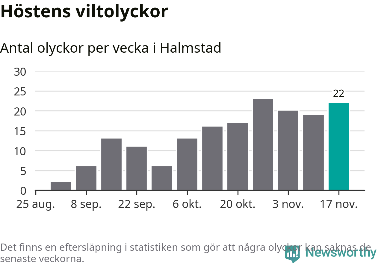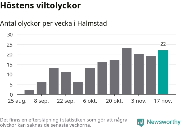 Hittills har 22 viltolyckor rapporterats in i Halmstads kommun från vecka 47. Det är en av de högsta siffrorna för en enskild vecka på över tio år.