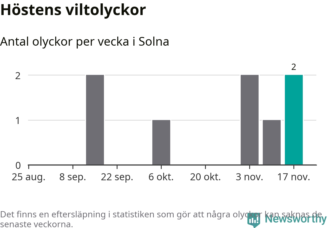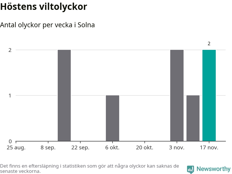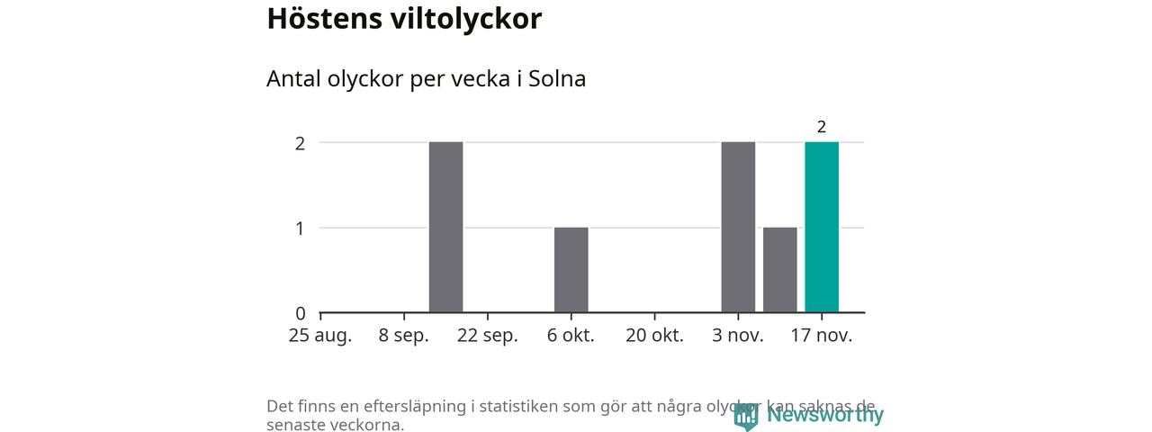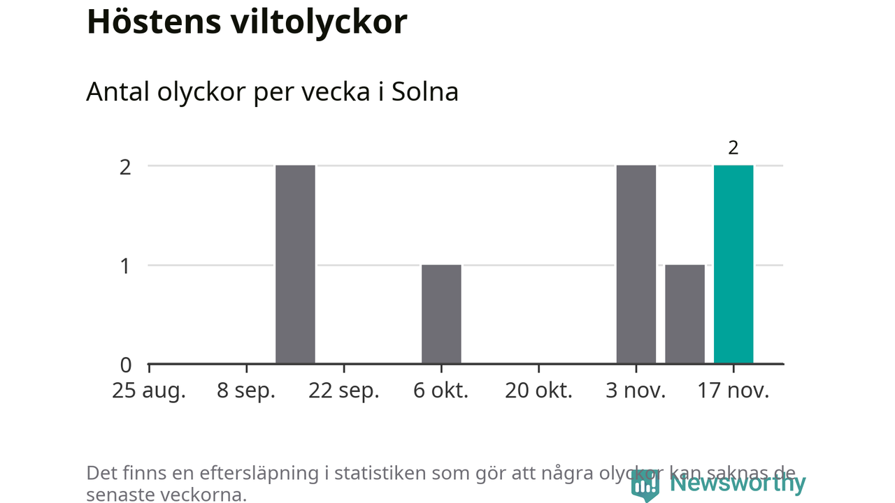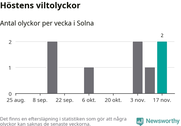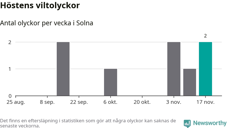 Hittills har två viltolyckor rapporterats in i Solna kommun från vecka 47. Se listan här.