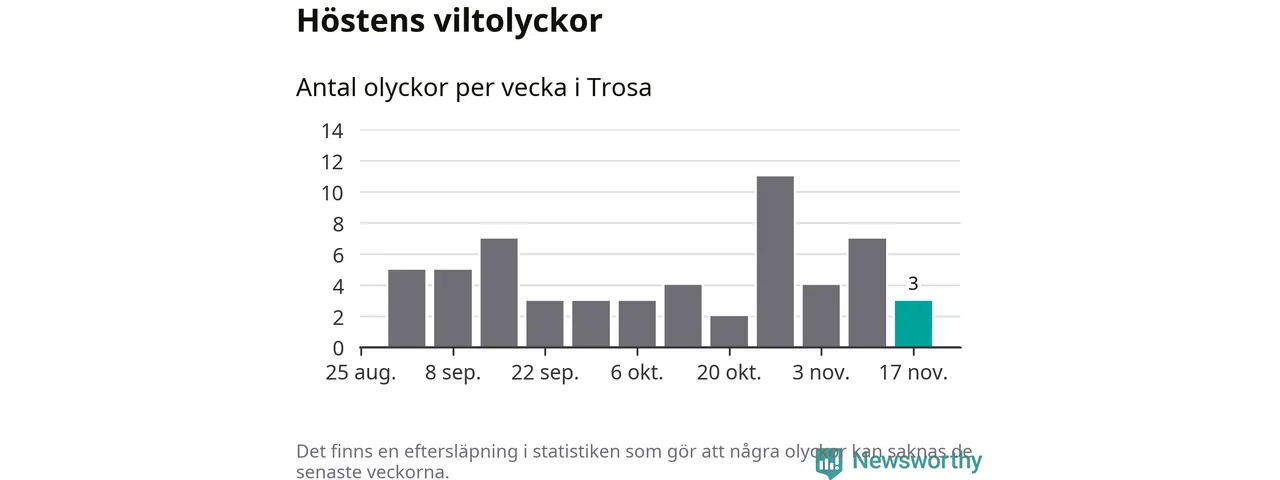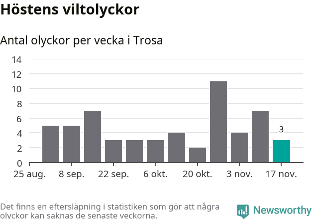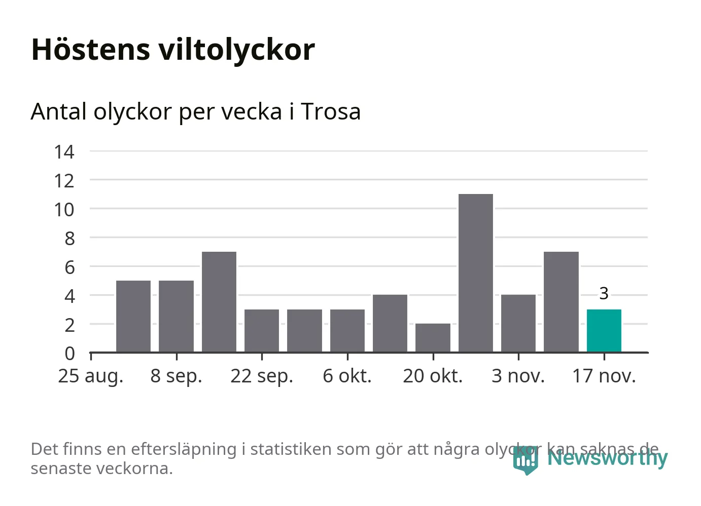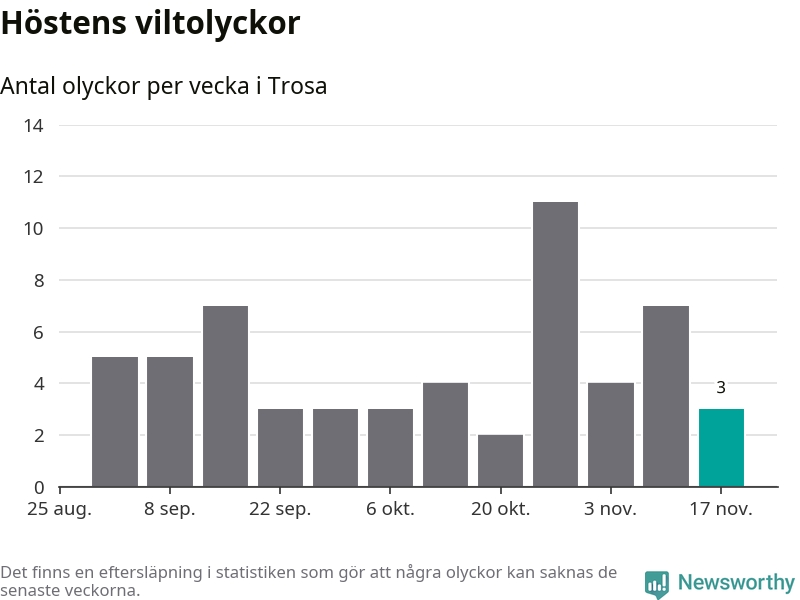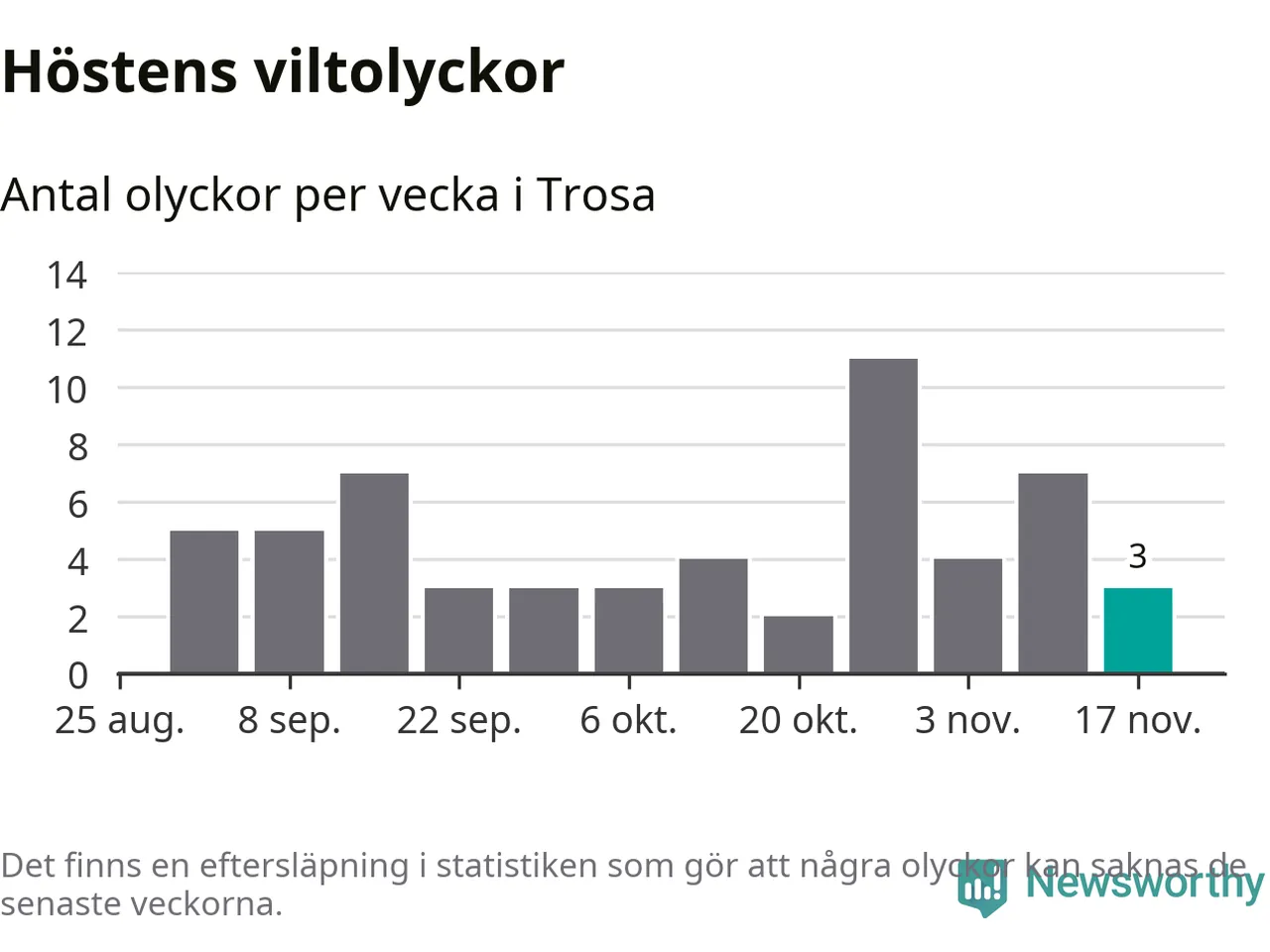 Hittills har tre viltolyckor rapporterats in i Trosa kommun från vecka 47. Se listan här.