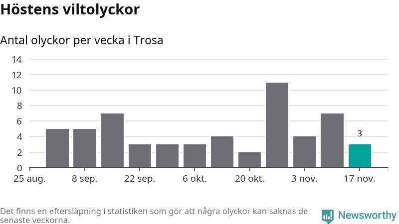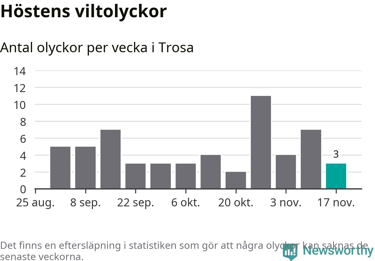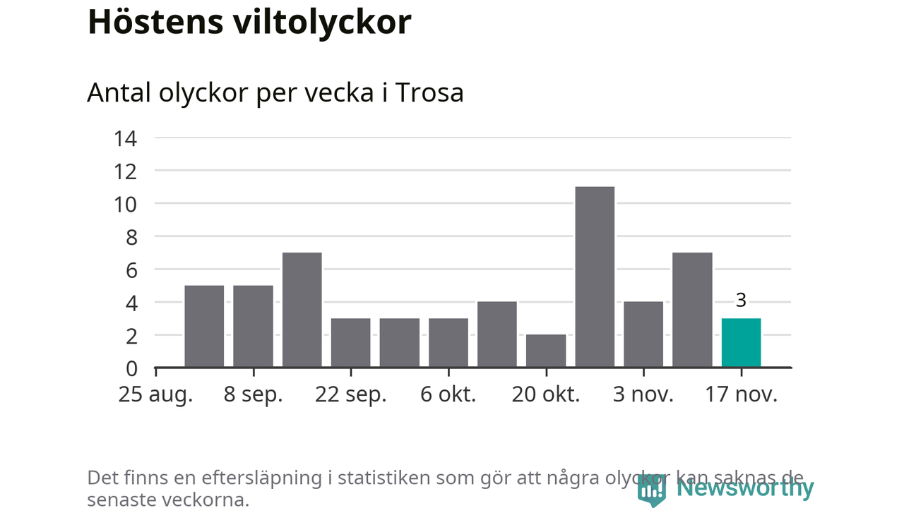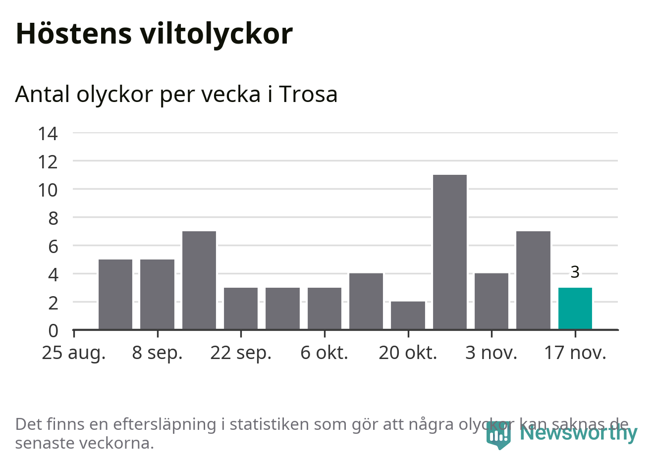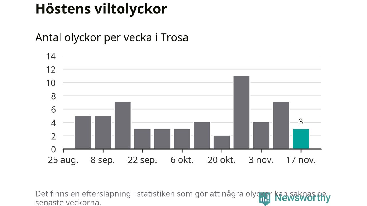 Hittills har tre viltolyckor rapporterats in i Trosa kommun från vecka 47. Se listan här.
